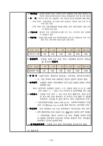- 453 %ub2e4.%uc81c%ucd9c%uc11c%ub958- %uad6d%ub0b4%uc790%uc0b0: %uc2e0%uccad%uc778 %uba85%uc758%uc758 %ub3d9%uc0b0, %ubd80%ub3d9%uc0b0 %ubaa8%ub450 %ud3ec%ud568%ud558%ub418 %ubd80%ucc44 %ub4f1%uc744 %uc81c%uc678%ud55c %uc21c%uc790%uc0b0%ub9cc%ud574%ub2f9(%uc2e0%uc6a9%uc815%ubcf4%uc870%ud68c%uc11c %ub4f1%uc73c%ub85c %ucc44%ubb34%ubd88%uc774%ud589 %uc5ec%ubd80 %ubc0f %ubd80%ucc44 %ud655%uc778)- %ud559 %ub825: %uad6d%ub0b4%uff65%uc678 %ud559%uc704 %ubaa8%ub450 %ud3ec%ud568%ud558%uba70, %uc774%ubbf8 %ucde8%ub4dd%ud55c %uacbd%uc6b0%ub9cc %ud574%ub2f9(%ucde8%ub4dd %uc608%uc815 %uc81c%uc678)%u261e (%uad6d%ub0b4 %ud559%uc704)%u300c%uace0%ub4f1%uad50%uc721%ubc95%u300d%uc81c 2%uc870%uc5d0 %ub530%ub77c %uc778%uc815%ub418%ub294 %ud559%uad50%uc758 %uacfc%uc815 %uc218%ub8cc %ud6c4 %ucde8%ub4dd%ud55c %uac83%ub9cc %uc778%uc815(%uad6d%uc678 %ud559%uc704)%uad6d%ub0b4 %uace0%ub4f1%uad50%uc721%ubc95%uc0c1%uc5d0 %ud559%uad50%uc5d0 %uc900%ud558%ub294 %uc815%uc2dd %uad50%uc721%uae30%uad00%uc5d0%uc11c %uacfc%uc815 %uc218%ub8cc %ud6c4 %ucde8%ub4dd%ud55c %uac83%ub9cc %uc778%uc815- %uae30%ubcf8%uc18c%uc591: %ubc95%ubb34%ubd80 %uc8fc%uad00 %uc0ac%ud68c%ud1b5%ud569%ud504%ub85c%uadf8%ub7a8 %uc774%uc218 %ub610%ub294 %uc774%uc218%ud558%uc9c0 %uc54a%uc740 %uc0c1%ud0dc%uc5d0%uc11c %uc885%ud569%ud3c9%uac00 %ud569%uaca9- %uad6d%ubbfc%uace0%uc6a9 : %uc2e0%uccad%uc77c %ud604%uc7ac 6%uac1c%uc6d4 %uc774%uc0c1 %uc815%uaddc%uc9c1(%uc804%uc77c%uc81c %uc0c1%uc6a9%uace0%uc6a9 %ud615%ud0dc)%uc73c%ub85c %uacc4%uc18d %uace0%uc6a9 %uc911%uc778 %uad6d%ubbfc %uc218%uc5d0 %ub530%ub77c %ub2e4%uc74c%uacfc %uac19%uc774 %uac00%uc810 %ubd80%uc5ec%uace0%uc6a9%ub41c %uad6d%ubbfc%uc2181~5%uba856~10%uba8511~15%uba8516~20%uba8521~25%uba8526%uba85 %uc774%uc0c1%uad6d%ubbfc%uace0%uc6a9 %uac00%uc8105%uc81010%uc81015%uc81020%uc81025%uc81030%uc810- %uacbd%uc601%uacbd%ub825: %uc2e0%uccad%uc77c %ud604%uc7ac 3%ub144 %uc774%uc0c1 %uad6d%ub0b4 %uc0ac%uc5c5%uccb4%uc5d0 %ubcf8%uc778%uc758 %uc790%ubcf8%uae08%uc744 %ud22c%uc790%ud55c %ub300%ud45c%uc790%ubcf8%uc778 %uc790%ubcf8%uae081~5%uc5b56~10%uc5b511~15%uc5b516~20%uc5b521~25%uc5b526%uc5b5 %uc774%uc0c1%uacbd%uc601%uacbd%ub825 %uac00%uc8105%uc81010%uc81015%uc81020%uc81025%uc81030%uc810- %ucd94 %ucc9c %uc11c: %ud5cc%ubc95%uae30%uad00%uc7a5, %uc911%uc559%ubd80%ucc98 %uc7a5%uad00(%uae09), %uad6d%ud68c%uc758%uc6d0, %uad11%uc5ed%uc790%uce58%ub2e8%uccb4%uc7a5%u261e %ub2e8, %uac00%uc810 %ubd80%uc5ec%uc5d0 %ub300%ud55c %ucd5c%uc885%uc801%uc778 %ud310%ub2e8%uc740 %ubc95%ubb34%ubd80 %uc7a5%uad00%uc774 %uacb0%uc815- %ub0a9%uc138%uc2e4%uc801: %uc2e0%uccad%uc77c%uc774 %uc18d%ud558%ub294 %uc5f0%ub3c4(%u5e74%u5ea6)%uc758 %uc774%uc804 2%ub144%uac04 %uc5f0%ud3c9%uade0 %ub0a9%ubd80%ud55c %uc18c%ub4dd%uc138 400%ub9cc%uc6d0 %uc774%uc0c1%uc608%uc2dc) %uc601%uc8fc%uc790%uaca9 %uc2e0%uccad%uc77c%uc774 2022.1.1.%uc778 %uc0ac%ub78c%uacfc 2022.12.31.%uc778 %uc0ac%ub78c %ubaa8%ub450 2020.1.1. ~ 2021.12.31.%uae4c%uc9c0%uc758 %ucd1d %ub0a9%ubd80%uc138%uc561%uc744 2%ub85c %ub098%ub214- %uc0ac%ud68c%ubd09%uc0ac: %uc2e0%uccad%uc77c %uc774%uc804 %ucd5c%uadfc 1%u223c3%ub144 %uc774%ub0b4 %ubd09%uc0ac %ud65c%ub3d9%uc73c%ub85c, %ud574%ub2f9 %uc5f0%ub3c4 %ub2f9 %ucd5c%uc18c 6%ud68c%uc774%uc0c1 %ucc38%uc5ec%ud558%uace0 %ucd1d 50%uc2dc%uac04 %uc774%uc0c1 %ud65c%ub3d9 %uc2dc 5%uc810%uc744%uc778%uc815%ud558%ub418, %uc5f0%ub3c4%ubcc4 %ucd1d %ud569%uc0b0 %uc810%uc218%ub294 %ucd5c%ub300 10%uc810%uae4c%uc9c0%ub9cc %uc778%uc815%u261e 1365%uc790%uc6d0%ubd09%uc0ac%ud3ec%ud138 (www.1365.go.kr), %uc0ac%ud68c%ubcf5%uc9c0%uc790%uc6d0%ubd09%uc0ac %uc778%uc99d%uad00%ub9ac %uc2dc%uc2a4%ud15c(www.vms.or.kr)%uc744 %ud1b5%ud574 %ud655%uc778%ub418%ub294 %uacbd%uc6b0%uc5d0%ub9cc %uc778%uc815 - %uad6d%ub0b4%uc720%ud559: %uad6d%ub0b4 %ub300%ud559%uc5d0%uc11c 4%ub144 %uc774%uc0c1 %uc720%ud559%ud558%uba74%uc11c %ud559%uc0ac%uc774%uc0c1%uc758 %ud559%uc704 %ucde8%ub4dd%u261e %uc720%ud559 %uccb4%ub958%uc790%uaca9(D-2)%uc758 %ub300%uc0c1%uc774 %ub418%ub294 %ud559%uad50*%uc5d0%uc11c %uacf5%ubd80%ud55c %uacbd%uc6b0 %uc778%uc815%ub428*%u300c%uace0%ub4f1%uad50%uc721%ubc95%u300d%uc81c2%uc870 1%ud638%ubd80%ud130 4%ud638 %ud559%uad50, %ud2b9%ubcc4%ubc95 %uaddc%uc815%uc5d0 %uc758%ud558%uc5ec %uc124%ub9bd%ub41c %uc804%ubb38%ub300%ud559 %uc774%uc0c1(%uc57c%uac04 %ub300%ud559%uc6d0 %ud3ec%ud568)%uc758 %ud559%uad50, %ud55c%uad6d%ud3f4%ub9ac%ud14d%ub300%ud559%uc758 %ub2e4%uac00%ub2a5%uae30%uc220%ud559%uc704%uacfc%uc815 - %uc77c%u2027%ud559%uc2b5%uc5f0%uacc4%uc720%ud559 : %uc120%ubc1c%ub420 %ub2f9%uc2dc %ud574%ub2f9 %ud559%uc704%uacfc%uc815%uc744 %uc815%uc0c1%uc801%uc73c%ub85c %uc878%uc5c5