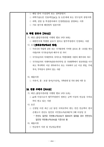 - 454 %u25cb%ud574%ub2f9 %ubd84%uc57c %uc218%uc0c1%uacbd%ub825 %ub610%ub294 %uacbd%ub825%uc99d%uba85%uc11c%u25cb%uacfc%ud559%uae30%uc220%ub17c%ubb38 %uc778%uc6a9%uc0c9%uc778(SCI)%ub4f1 %ub17c%ubb38%uac8c%uc7ac %ub610%ub294 %uc5f0%uad6c%uc2e4%uc801 %uc99d%uba85%uc11c%ub958%u25cb%uacfc%ud559,%uacbd%uc601 %ub4f1 %ud2b9%uc815%ubd84%uc57c%uc5d0%uc11c %uc778%uc815%ubc1b%uc558%uc74c%uc744 %uc99d%uba85%ud558%ub294 %uc11c%ub958%u25cb%uae30%ud0c0 %uc810%uc218%uc81c %ud574%ub2f9%ud56d%ubaa9 %uc785%uc99d%uc11c%ub9589.%ud2b9%ubcc4 %uacf5%ub85c%uc790%u3014F-5-12%u3015%uac00.%ub300%uc0c1 (%ucd9c%uc785%uad6d%uad00%ub9ac%ubc95 %uc2dc%ud589%ub839 %ubcc4%ud45c 1%uc758310%ud638)%u25cb%ub300%ud55c%ubbfc%uad6d%uc5d0 %ud2b9%ubcc4%ud55c %uacf5%ub85c%uac00 %uc788%ub2e4%uace0 %ubc95%ubb34%ubd80%uc7a5%uad00%uc774 %uc778%uc815%ud558%ub294 %uc0ac%ub78c%ub098.%uc694%uac74(%uc0dd%uacc4%uc720%uc9c0%ub2a5%ub825%uc694%uac74 %uba74%uc81c)%u25cb%uc6b0%ub9ac%ub098%ub77c %ub3c5%ub9bd%uc5d0 %uacf5%ud5cc %ub610%ub294 %uad6d%uac00%ubc1c%uc804%uc5d0 %uae30%uc5ec%ud55c %uacf5%ub85c%ub85c %ud6c8%u2024%ud3ec%uc7a5%uc744 %ubc1b%uc740%uc0ac%ub78c(%uc774%ud558 %uad6d%uac00%uc720%uacf5%uc790)%uacfc %ubc30%uc6b0%uc790 %ubc0f %uc790%ub140 %u25cb%uad6d%uac00%uc720%uacf5%uc790%uc758 %uc9c1%uacc4%uc874%ube44%uc18d %uc790%uaca9%uc73c%ub85c %ud2b9%ubcc4%uadc0%ud654%ud55c %uc0ac%ub78c%uc758 %ubc30%uc6b0%uc790%uc640 %uc790%ub140%u25cb%uad6d%uac00%uc720%uacf5%uc790%uc758 %uc9c1%uacc4%ube44%uc18d(%uc99d%uc190%uc790%ub140%uae4c%uc9c0)%uc911 %uad6d%ub0b4%ub300%ud559%uc5d0%uc11c %uc815%uaddc%uacfc%uc815%uc744 %uc774%uc218%ud558%uace0 %ud559%uc0ac%ud559%uc704 %uc774%uc0c1 %ucde8%ub4dd%ud558%uac70%ub098 %ub610%ub294 %uad6d%ub0b4%uc5d0%uc11c 1%ub144 %uc774%uc0c1 %ucde8%uc5c5,%uc8fc%uc7ac,%ud22c%uc790,%ubb34%uc5ed%uc885%uc0ac%uacbd%ub825%uc774 %uc788%ub294 %uc0ac%ub78c%ub2e4%uc81c%ucd9c%uc11c%ub958%u25cb%uc0ac%uc720%uc11c,%ud6c8%u2024%ud3ec%uc7a5 %uc99d%uc11c(%uc218%uc0c1%uc790),%uac00%uc871%uad00%uacc4 %ubc0f %uae30%ud0c0 %uc99d%ube59%uc11c%ub958 %ub4f110.%uc5f0%uae08 %uc218%ud61c%uc790%u3014F-5-13%u3015%uac00.%ub300%uc0c1 (%ucd9c%uc785%uad6d%uad00%ub9ac%ubc95 %uc2dc%ud589%ub839 %ubcc4%ud45c 1%uc758311%ud638)%u25cb60%uc138 %uc774%uc0c1%uc73c%ub85c%uc11c %ubc95%ubb34%ubd80%uc7a5%uad00%uc774 %uc815%ud558%ub294 %uae08%uc561 %uc774%uc0c1%uc758 %uc5f0%uae08%uc744 %uad6d%uc678%ub85c%ubd80%ud130 %ubc1b%uace0 %uc788%ub294 %uc0ac%ub78c%ub098.%uc694%uac74 %u25cb%uc2e0%uccad%uc77c %uc774%uc804 %ucd5c%uadfc 1%ub144 %ub3d9%uc548 %uad6d%uc678%ub85c%ubd80%ud130 %ubc1b%ub294 %uc5f0%uac04 %uc5f0%uae08%uc561%uc774 %ud55c%uad6d%uc740%ud589%uace0%uc2dc %uc804%ub144%ub3c4 %uc77c%uc778%ub2f9 %uad6d%ubbfc%ucd1d%uc18c%ub4dd(GNI)*%uc758 2%ubc30 %uc774%uc0c1%uc77c %uac83* %uc804%ub144%ub3c4 %uc77c%uc778%ub2f9 %uad6d%ubbfc%ucd1d%uc18c%ub4dd(GNI)%uac00 %ubc1c%ud45c%ub418%uc9c0 %uc54a%uc558%uc744 %uacbd%uc6b0 %uc804%uc804%ub144%ub3c4 %uc77c%uc778%ub2f9 %uad6d%ubbfc%ucd1d%uc18c%ub4dd(GNI)%uc744 %uae30%uc900%uc73c%ub85c %ud568%ub2e4.%uc81c%ucd9c%uc11c%ub958%u25cb%uc5f0%uae08%uc99d%uc11c %uc0ac%ubcf8 %ubc0f %uc5f0%uae08%uc785%uae08%ud1b5%uc7a5