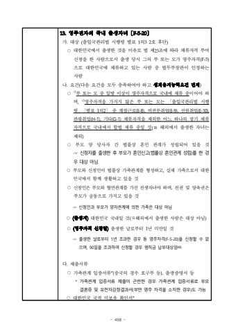 - 458 13.%uc601%uc8fc%uad8c%uc790%uc758 %uad6d%ub0b4 %ucd9c%uc0dd%uc790%ub140%u3014F-5-20%u3015%uac00.%ub300%uc0c1 (%ucd9c%uc785%uad6d%uad00%ub9ac%ubc95 %uc2dc%ud589%ub839 %ubcc4%ud45c 1%uc75832%ud638 %ud6c4%ub2e8)%u25cb%ub300%ud55c%ubbfc%uad6d%uc5d0%uc11c %ucd9c%uc0dd%ud55c %uac83%uc744 %uc774%uc720%ub85c %ubc95 %uc81c23%uc870%uc5d0 %ub530%ub77c %uccb4%ub958%uc790%uaca9 %ubd80%uc5ec%uc2e0%uccad%uc744 %ud55c %uc0ac%ub78c%uc73c%ub85c%uc11c %ucd9c%uc0dd %ub2f9%uc2dc %uadf8%uc758 %ubd80 %ub610%ub294 %ubaa8%uac00 %uc601%uc8fc%uc790%uaca9(F-5)%uc73c%ub85c %ub300%ud55c%ubbfc%uad6d%uc5d0 %uccb4%ub958%ud558%uace0 %uc788%ub294 %uc0ac%ub78c %uc911 %ubc95%ubb34%ubd80%uc7a5%uad00%uc774 %uc778%uc815%ud558%ub294 %uc0ac%ub78c%ub098.%uc694%uac74(%ub2e4%uc74c %uc694%uac74%uc744 %ubaa8%ub450 %ucda9%uc871%ud558%uc5ec%uc57c %ud558%uace0 %uc0dd%uacc4%uc720%uc9c0%ub2a5%ub825%uc694%uac74 %uba74%uc81c)%u25cb%u326e%ubd80 %ub610%ub294 %ubaa8 %uc911 %uc77c%ubc29 %uc774%uc0c1%uc774 %uc601%uc8fc%uc790%uaca9%uc73c%ub85c %uad6d%ub0b4%uc5d0 %uccb4%ub958 %uc911%uc774%uc5b4%uc57c %ud558%uba70,%u326f%uc601%uc8fc%uc790%uaca9%uc744 %uac00%uc9c0%uc9c0 %uc54a%uc740 %ubd80 %ub610%ub294 %ubaa8%ub294 %u300c%ucd9c%uc785%uad6d%uad00%ub9ac%ubc95 %uc2dc%ud589%ub839%u300d%u3014%ubcc4%ud45c 1%uc7582%u3015%uc911 %uacc4%uc808%uadfc%ub85c(E-8),%ube44%uc804%ubb38%ucde8%uc5c5(E-9),%uc120%uc6d0%ucde8%uc5c5(E-10),%uad00%uad11%ucde8%uc5c5(H-1),%uae30%ud0c0(G-1)%uccb4%ub958%uc790%uaca9%uc744 %uc81c%uc678%ud55c %uc5b4%ub290 %ud558%ub098%uc758 %uc7a5%uae30 %uccb4%ub958%uc790%uaca9%uc73c%ub85c %uad6d%ub0b4%uc5d0%uc11c %ud569%ubc95 %uccb4%ub958 %uc911%uc77c %uac83(%u203b%ud574%uc678%uc5d0%uc11c %ucd9c%uc0dd%ud55c %uc790%ub140%ub294 %uc81c%uc678)%u25cb%ubd80%ubaa8 %uc591 %ub2f9%uc0ac%uc790 %uac04 %ubc95%ub960%uc0c1 %ud63c%uc778 %uad00%uacc4%uac00 %uc131%ub9bd%ub418%uc5b4 %uc788%uc744 %uac83 %u261e %uc2e0%uccad%uc790%ub97c %ucd9c%uc0dd%ud55c %ud6c4 %ubd80%ubaa8%uac00 %ud63c%uc778%uc2e0%uace0(%ubc95%ub960%uc0c1 %ud63c%uc778%uad00%uacc4 %uc131%ub9bd)%ub97c %ud55c %uacbd%uc6b0 %ub300%uc0c1 %uc544%ub2d8%ubd80%ubaa8%uc640 %uc2e0%uccad%uc778%uc774 %ubc95%ub960%uc0c1 %uac00%uc871%uad00%uacc4%ub97c %ud615%uc131%ud558%uace0%uc2e4%uc81c %uac00%uc871%uc73c%ub85c%uc11c %ub300%ud55c%ubbfc%uad6d%uc5d0%uc11c %ud568%uaed8 %uc0dd%ud65c%ud558%uace0 %uc788%uc744 %uac83%u25cb%uc2e0%uccad%uc778%uc740 %ubd80%ubaa8%uc640 %ud608%uc5f0%uad00%uacc4%ub97c %uac00%uc9c4 %uce5c%uc0dd%uc790%ub140%uc57c%ud558%uba70,%uce5c%uad8c %ubc0f %uc591%uc721%uad8c%uc740%ubd80%ubaa8%uac00 %uacf5%ub3d9%uc73c%ub85c %uac00%uc9c0%uace0 %uc788%uc744 %uac83%u261e %uc2e0%uccad%uc778%uacfc %ubd80%ubaa8%uac00 %uc591%uc790%uad00%uacc4%uc5d0 %uc758%ud55c %uac00%uc871%uc740 %ub300%uc0c1 %uc544%ub2d8%u25cb(%ucd9c%uc0dd%uc9c0)%ub300%ud55c%ubbfc%uad6d %uad6d%ub0b4%uc77c %uac83(%u203b%ud574%uc678%uc5d0%uc11c %ucd9c%uc0dd%ud55c %uc0ac%ub78c%uc740 %ub300%uc0c1 %uc544%ub2d8)%u25cb(%uc601%uc8fc%uc790%uaca9 %uc2e0%uccad%uc77c)%ucd9c%uc0dd%ud55c %ub0a0%ub85c%ubd80%ud130 1%ub144 %ubbf8%ub9cc%uc77c %uac83%u261e %ucd9c%uc0dd%ud55c %ub0a0%ub85c%ubd80%ud130 1%ub144 %ucd08%uacfc%ud55c %uacbd%uc6b0 %ub3d9 %uc601%uc8fc%uc790%uaca9(F-5-20)%uc744 %uc2e0%uccad%ud560 %uc218 %uc5c6%uc73c%uba70, 90%uc77c%uc744 %ucd08%uacfc%ud558%uc5ec %uc2e0%uccad%ud560 %uacbd%uc6b0 %ubc94%uce59%uae08 %ub0a9%ubd80%ub300%uc0c1%uc78448)%ub2e4.%uc81c%ucd9c%uc11c%ub958%u25cb%uac00%uc871%uad00%uacc4 %uc785%uc99d%uc11c%ub958*(%uc911%uad6d%uc758 %uacbd%uc6b0 %ud638%uad6c%ubd80 %ub4f1),%ucd9c%uc0dd%uc99d%uba85%uc11c %ub4f1* %uac00%uc871%uad00%uacc4 %uc785%uc99d%uc11c%ub958 %uc81c%ucd9c%uc774 %uace4%ub780%ud55c %uacbd%uc6b0 %uac00%uc871%uad00%uacc4 %uc785%uc99d%uc11c%ub958%ub85c %ubd80%ubaa8%uacb0%ud63c%uc99d %ubc0f %uc720%uc804%uc790%uac10%uc815%uacb0%uacfc%uc11c(%ubd80%ub9cc %uc601%uc8fc %uc790%uaca9%uc744 %uc18c%uc9c0%ud55c %uacbd%uc6b0)%ub3c4 %uac00%ub2a5%u25cb%ub300%ud55c%ubbfc%uad6d %uad6d%uc801 %ubbf8%ubcf4%uc720 %ud655%uc778%uc11c*