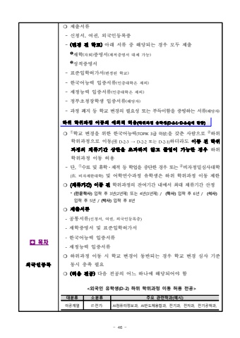 - 46 -%uf000%uc678%uad6d%uc778%ub4f1%ub85d%u274d %uc81c%ucd9c%uc11c%ub958- %uc2e0%uccad%uc11c, %uc5ec%uad8c, %uc678%uad6d%uc778%ub4f1%ub85d%uc99d- (%ubcc0%uacbd %uc804 %ud559%uad50) %uc544%ub798 %uc11c%ub958 %uc911 %ud574%ub2f9%ub418%ub294 %uacbd%uc6b0 %ubaa8%ub450 %uc81c%ucd9c%u2776%uc7ac%ud559(%uc790%ud1f4)%uc99d%uba85%uc11c(%uc81c%uc801%uc99d%uba85%uc11c %ub300%uccb4 %uac00%ub2a5)%u2777%uc131%uc801%uc99d%uba85%uc11c- %ud45c%uc900%uc785%ud559%ud5c8%uac00%uc11c(%ubcc0%uacbd%ub41c %ud559%uad50) - %ud55c%uad6d%uc5b4%ub2a5%ub825 %uc785%uc99d%uc11c%ub958(%uc778%uc99d%ub300%ud559%uc740 %uc81c%uc678)- %uc7ac%uc815%ub2a5%ub825 %uc785%uc99d%uc11c%ub958(%uc778%uc99d%ub300%ud559%uc740 %uc81c%uc678)- %uc815%ubd80%ucd08%uccad%uc7a5%ud559%uc0dd %uc785%uc99d%uc11c%ub958(%ud574%ub2f9%uc790)- %uacfc%uc815 %ud3d0%uc9c0 %ub4f1 %ud559%uad50 %ubcc0%uacbd%uc758 %ud544%uc694%uc131 %ub610%ub294 %ubd80%ub4dd%uc774%ud568%uc744 %uc99d%ube59%ud558%ub294 %uc11c%ub958(%ud574%ub2f9%uc790)%ud558%uc704 %ud559%uc704%uacfc%uc815 %uc774%ub3d9%uc758 %uc608%uc678%uc801 %ud5c8%uc6a9(%ud559%uc704%uacfc%uc815 %uc720%ud559%uc0dd(D-2-1~D-2-4)%uc5d0 %ud55c%ud568)%u274d%u2780%ud559%uad50 %ubcc0%uacbd%uc744 %uc704%ud55c %ud55c%uad6d%uc5b4%ub2a5%ub825(TOPIK 3%uae09 %uc774%uc0c1)%uc744 %uac16%ucd98 %uc0ac%ub78c%uc73c%ub85c %u2781%ud558%uc704 %ud559%uc704%uacfc%uc815%uc73c%ub85c %uc774%ub3d9(%uf000D-2-3%u2192D-2-2%ub610%ub294 D-2-1)%ud558%ub354%ub77c%ub3c4 %uc774%ub3d9 %uc804 %ud559%uc704%uacfc%uc815%uc758 %uccb4%ub958%uae30%uac04 %uc0c1%ud55c%uc744 %ucd08%uacfc%ud558%uc9c0 %uc54a%uace0 %uc878%uc5c5%uc774 %uac00%ub2a5%ud55c %uacbd%uc6b0%ud558%uc704 %ud559%uc704%uacfc%uc815 %uc774%ub3d9 %ud5c8%uc6a9- %ub2e8, %u2780%uc218%ub8cc %ubc0f %ud734%ud559%u00b7%uc81c%uc801 %ub4f1 %ud559%uc5c5%uc744 %uc911%ub2e8%ud55c %uacbd%uc6b0 %ub610%ub294 %u2781%ube44%uc790%uc815%ubc00%uc2ec%uc0ac%ub300%ud559(%u820a.%ube44%uc790%uc81c%ud55c%ub300%ud559)%ubc0f %uc5b4%ud559%uc5f0%uc218%uacfc%uc815 %uc720%ud559%uc0dd%uc740 %ud558%uc704 %ud559%uc704%uacfc%uc815 %uc774%ub3d9 %uc81c%ud55c%u274d(%uccb4%ub958%uae30%uac04)%uc774%ub3d9 %uc804 %ud559%uc704%uacfc%uc815%uc758 %uc794%uc5ec%uae30%uac04 %ub0b4%uc5d0%uc11c %ucd5c%ub300 %uccb4%ub958%uae30%uac04 %uc0b0%uc815* (%uc804%ubb38%ud559%uc0ac) %uc785%ud559 %ud6c4 3%ub144(2%ub144%uc81c) %ub610%ub294 4%ub144(3%ub144%uc81c) / (%ud559%uc0ac) %uc785%ud559 %ud6c4 6%ub144 / (%uc11d%uc0ac) %uc785%ud559 %ud6c4 5%ub144 / (%ubc15%uc0ac) %uc785%ud559 %ud6c4 8%ub144%u274d%uc81c%ucd9c%uc11c%ub958-%uacf5%ud1b5%uc11c%ub958(%uc2e0%uccad%uc11c,%uc5ec%uad8c,%uc678%uad6d%uc778%ub4f1%ub85d%uc99d)-%uc7ac%ud559%uc99d%uba85%uc11c %ubc0f %ud45c%uc900%uc785%ud559%ud5c8%uac00%uc11c -%ud55c%uad6d%uc5b4%ub2a5%ub825 %uc785%uc99d%uc11c%ub958-%uc7ac%uc815%ub2a5%ub825 %uc785%uc99d%uc11c%ub958%u274d%ud558%uc704%uacfc%uc815 %uc774%ub3d9 %uc2dc %ud559%uad50 %ubcc0%uacbd%uc774 %ub3d9%ubc18%ub418%ub294 %uacbd%uc6b0 %ud559%uad50 %ubcc0%uacbd %uc2ec%uc0ac %uae30%uc900 %ub3d9%uc2dc %ucda9%uc871 %ud544%uc694%u274d(%ud5c8%uc6a9 %uc804%uacf5) %ub2e4%uc74c %uc804%uacf5%uc758 %uc5b4%ub290 %ud558%ub098%uc5d0 %ud574%ub2f9%ub418%uc5b4%uc57c %ud568<%uc678%uad6d%uc778 %uc720%ud559%uc0dd(D-2) %ud558%uc704 %ud559%uc704%uacfc%uc815 %uc774%ub3d9 %ud5c8%uc6a9 %uc804%uacf5>%ub300%ubd84%ub958%uc18c%ubd84%ub958%uc8fc%uc694 %uad00%ub828%ud559%uacfc(%uc608%uc2dc)%uc774%uacf5%uacc4%uc5f4IT%u00b7%uc804%uae30%u00b7AI%ucef4%ud4e8%ud130%uc815%ubcf4%uacfc, AI%ubc18%ub3c4%uccb4%uc735%ud569%uacfc, %uc804%uae30%uacfc, %uc804%uc790%uacfc, %uc804%uae30%uacf5%ud559%uacfc,