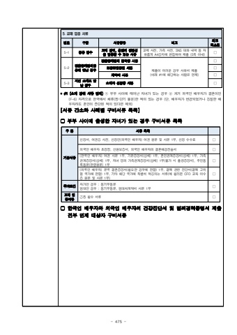 - 475 5. %uad50%uc81c %uc785%uc99d %uc11c%ub958%ubc88%ud638%uad6c%ubd84%uc11c%ub958%uc885%ub958%ube44%uace0%uccb4%ud06c%ub9ac%uc2a4%ud2b85-1%uacf5%ud1b5 %ud544%uc218%uad50%uc81c %uacbd%uc704, %ud63c%uc778%uc758 %uc9c4%uc815%uc131%uc744 %uc785%uc99d%ud560 %uc218 %uc788%ub294 %uc11c%ub958%uad50%uc81c %uc0ac%uc9c4, %uac00%uc871 %uc0ac%uc9c4, SNS %ub300%ud654 %ub0b4%uc5ed %ub4f1 %uc790%uc720%ub86d%uac8c A4%uc6a9%uc9c0%uc5d0 %ud3b8%uc9d1%ud558%uc5ec %uc81c%ucd9c (5%ucabd %uc774%ub0b4)%u25a15-2%uacb0%ud63c%uc911%uac1c%uc5c5%uccb4%ub97c %ud1b5%ud574 %ub9cc%ub09c %uacbd%uc6b0%uacb0%ud63c%uc911%uac1c%uc5c5%uccb4 %ub4f1%ub85d%uc99d %uc0ac%ubcf8%uc81c%ucd9c%uc774 %uc5b4%ub824%uc6b4 %uacbd%uc6b0 %uc0ac%uc720%uc11c %uc81c%ucd9c(%uc544%ub798 #1%uc5d0 %ud574%ub2f9%ud558%ub294 %uc0ac%ub78c%uc740 %uba74%uc81c)%u25a1%ubcf4%uc99d%ubcf4%ud5d8%uc99d%uad8c %uc0ac%ubcf8%u25a1%uacc4%uc57d%uc11c %uc0ac%ubcf8%u25a15-3%uc9c0%uc778 %uc18c%uac1c%ub85c %ub9cc%ub09c %uacbd%uc6b0%uc18c%uac1c%uc790 %uc2e0%ubd84%uc99d %uc0ac%ubcf8%u25a1* #1 (%uc18c%uac1c %uacbd%uc704 %uc11c%ub958 %uba74%uc81c)%u2460 %ubd80%ubd80 %uc0ac%uc774%uc5d0 %ud0dc%uc5b4%ub09c %uc790%ub140%uac00 %uc788%ub294 %uacbd%uc6b0 %u2461 %uacfc%uac70 %uc678%uad6d%uc778 %ubc30%uc6b0%uc790%uac00 %uacb0%ud63c%uc774%ubbfc(F-6) %uc790%uaca9%uc73c%ub85c %ud55c%uad6d%uc5d0%uc11c %uccb4%ub958(%uc7a5%ub2e8%uae30 %ubd88%ubb38)%ud55c %uc801%uc774 %uc788%ub294 %uacbd%uc6b0 (%ub2e8, %ubc30%uc6b0%uc790%uac00 %ubcc0%uacbd%ub418%uc5c8%uac70%ub098 %ub3d9%uc77c%ud55c %ubc30%uc6b0%uc790%ub77c%ub3c4 %ud63c%uc778%uc774 %uc911%ub2e8%ub41c %uc801%uc774 %uc788%ub2e4%uba74 %uc81c%uc678)[%uc11c%ub958 %uac04%uc18c%ud654 %uc0ac%ub840%ubcc4 %uad6c%ube44%uc11c%ub958 %ubaa9%ub85d]%u25a2 %ubd80%ubd80 %uc0ac%uc774%uc5d0 %ucd9c%uc0dd%ud55c %uc790%ub140%uac00 %uc788%ub294 %uacbd%uc6b0 %uad6c%ube44%uc11c%ub958 %ubaa9%ub85d%uad6c %ubd84%uc11c%ub958 %ubaa9%ub85d%uae30%ubcf8%uc11c%ub958%uc2e0%uccad%uc11c, %uc5ec%uad8c%uc6a9 %uc0ac%uc9c4, %uc2e0%uccad%uc778(%uc678%uad6d%uc778 %ubc30%uc6b0%uc790) %uc5ec%uad8c %uc6d0%ubcf8 %ubc0f %uc0ac%ubcf8 1%ubd80, %uc2e0%uccad %uc218%uc218%ub8cc %u25a1%uc678%uad6d%uc778 %ubc30%uc6b0%uc790 %ucd08%uccad%uc7a5, %uc2e0%uc6d0%ubcf4%uc99d%uc11c, %uc678%uad6d%uc778 %ubc30%uc6b0%uc790%uc758 %uacb0%ud63c%ubc30%uacbd%uc9c4%uc220%uc11c%u25a1(%ud55c%uad6d%uc778 %ubc30%uc6b0%uc790) %uc5ec%uad8c %uc0ac%ubcf8 1%ubd80, %uae30%ubcf8%uc99d%uba85%uc11c(%uc0c1%uc138) 1%ubd80, %ud63c%uc778%uad00%uacc4%uc99d%uba85%uc11c(%uc0c1%uc138) 1%ubd80, %uac00%uc871%uad00%uacc4%uc99d%uba85%uc11c(%uc0c1%uc138) 1%ubd80, %uc790%ub140 %uba85%uc758 %uac00%uc871%uad00%uacc4%uc99d%uba85%uc11c(%uc0c1%uc138) 1%ubd80(%ubd88%uac00 %uc2dc %ucd9c%uc0dd%uc99d%uba85%uc11c), %uc8fc%ubbfc%ub4f1%ub85d%ub4f1%ubcf8(%ud55c%uae00%uc6d0%ubcf8) 1%ubd80%u25a1(%uc678%uad6d%uc778 %ubc30%uc6b0%uc790) %ubcf8%uad6d %uacb0%ud63c%uc99d%uba85%uc11c(%ud544%uc694%ud55c %uacbd%uc6b0%uc5d0 %ud55c%ud568) 1%ubd80, %uacb0%ud575 %uad00%ub828 %uc9c4%ub2e8%uc11c(%uacb0%ud575 %uace0%uc704%ud5d8 %uad6d%uac00%uc5d0 %ud55c%ud568) 1%ubd80, %uae30%ud0c0 %ud574%ub2f9 %uad6d%uac00%uc5d0 %ud2b9%ubcc4%ud788 %uc801%uc6a9%ub418%ub294 %uc11c%ub958(%uc608 %ud544%ub9ac%ud540 CFO %uad50%uc721 %uc774%uc218%uc99d %uc6d0%ubcf8 %ubc0f %uc0ac%ubcf8 1%ubd80)%u25a1%uc8fc%uac70%uc694%uac74%uc790%uac00%uc778 %uacbd%uc6b0 : %ub4f1%uae30%ubd80%ub4f1%ubcf8%uc784%ub300%uc778 %uacbd%uc6b0 : %ub4f1%uae30%ubd80%ub4f1%ubcf8, %uc784%ub300%ucc28%uacc4%uc57d%uc11c %uc0ac%ubcf8 1%ubd80%u25a1%uad50%uc81c %uc785%uc99d%uc11c%ub958%uacf5%ud1b5 %ud544%uc218 %uc11c%ub958%u25a1%u25a2 %ud55c%uad6d%uc778 %ubc30%uc6b0%uc790%uc640 %uc678%uad6d%uc778 %ubc30%uc6b0%uc790%uc758 %uac74%uac15%uc9c4%ub2e8%uc11c %ubc0f %ubc94%uc8c4%uacbd%ub825%uc99d%uba85%uc11c %uc81c%ucd9c %uc804%ubd80 %uba74%uc81c %ub300%uc0c1%uc790 %uad6c%ube44%uc11c%ub958