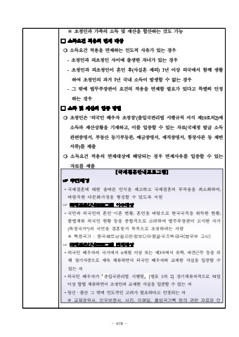 - 478 %u203b%ucd08%uccad%uc778%uacfc %uac00%uc871%uc758 %uc18c%ub4dd %ubc0f %uc7ac%uc0b0%uc744 %ud569%uc0b0%ud558%ub294 %uac83%ub3c4 %uac00%ub2a5%u25a1%uc18c%ub4dd%uc694%uac74 %uc801%uc6a9%uc758 %uba74%uc81c %ub300%uc0c1%u274d %uc18c%ub4dd%uc694%uac74 %uc801%uc6a9%uc744 %uba74%uc81c%ud558%ub294 %uc778%ub3c4%uc801 %uc0ac%uc720%uac00 %uc788%ub294 %uacbd%uc6b0-%ucd08%uccad%uc778%uacfc %ud53c%ucd08%uccad%uc778 %uc0ac%uc774%uc5d0 %ucd9c%uc0dd%ud55c %uc790%ub140%uac00 %uc788%ub294 %uacbd%uc6b0-%ucd08%uccad%uc778%uacfc %ud53c%ucd08%uccad%uc778%uc774 %ud63c%uc778 %ud6c4(%uc0ac%uc2e4%ud63c %uc81c%uc678)1%ub144 %uc774%uc0c1 %uc678%uad6d%uc5d0%uc11c %ud568%uaed8 %uc0dd%ud65c%ud558%uc5ec %ucd08%uccad%uc778%uc758 %uacfc%uac70 1%ub144 %uad6d%ub0b4 %uc18c%ub4dd%uc774 %ubc1c%uc0dd%ud560 %uc218 %uc5c6%ub294 %uacbd%uc6b0-%uadf8 %ubc16%uc5d0 %ubc95%ubb34%ubd80%uc7a5%uad00%uc774 %uc694%uac74%uc758 %uc801%uc6a9%uc744 %uba74%uc81c%ud560 %ud544%uc694%uac00 %uc788%ub2e4%uace0 %ud2b9%ubcc4%ud788 %uc778%uc815%ud558%ub294 %uacbd%uc6b0%u25a1%uc18c%ub4dd %ubc0f %uc7ac%uc0b0%uc758 %uc785%uc99d %ubc29%ubc95%u274d %ucd08%uccad%uc778%uc740 %u2018%uc678%uad6d%uc778 %ubc30%uc6b0%uc790 %ucd08%uccad%uc7a5%u2019(%ucd9c%uc785%uad6d%uad00%ub9ac%ubc95 %uc2dc%ud589%uaddc%uce59 %uc11c%uc2dd %uc81c19%ud638%uc7582)%uc5d0%uc18c%ub4dd%uacfc %uc7ac%uc0b0%uc0c1%ud669%uc744 %uae30%uc7ac%ud558%uace0,%uc774%ub97c %uc785%uc99d%ud560 %uc218 %uc788%ub294 %uc790%ub8cc(%uad6d%uc138%uccad %ubc1c%uae09 %uc18c%ub4dd %uad00%ub828%uc99d%uba85%uc11c,%ubd80%ub3d9%uc0b0 %ub4f1%uae30%ubd80%ub4f1%ubcf8,%uc608%uae08%uc99d%uba85%uc11c,%uc7ac%uc9c1%uc99d%uba85%uc11c,%ud1b5%uc7a5%uc0ac%ubcf8 %ub4f1 %uc81c%ubc18 %uc11c%ub958)%ub97c %uc81c%ucd9c%u274d %uc18c%ub4dd%uc694%uac74 %uc801%uc6a9%uc758 %uba74%uc81c%ub300%uc0c1%uc5d0 %ud574%ub2f9%ub418%ub294 %uacbd%uc6b0 %uba74%uc81c%uc0ac%uc720%ub97c %uc785%uc99d%ud560 %uc218 %uc788%ub294%uc790%ub8cc%ub97c %uc81c%ucd9c %uad6d%uc81c%uacb0%ud63c%uc548%ub0b4%ud504%ub85c%uadf8%ub7a8%u261e %ucd94%uc9c4%ubc30%uacbd%uf000%uad6d%uc81c%uacb0%ud63c%uc5d0 %ub300%ud55c %uc62c%ubc14%ub978 %uc778%uc2dd%uc744 %uc81c%uace0%ud558%uace0 %uad6d%uc81c%uacb0%ud63c%uc758 %ubd80%uc791%uc6a9%uc744 %ucd5c%uc18c%ud654%ud558%uc5ec,%ubc14%ub78c%uc9c1%ud55c %ub2e4%ubb38%ud654%uac00%uc815%uc744 %ud615%uc131%ud560 %uc218 %uc788%ub3c4%ub85d %uc9c0%uc6d0%u261e %uad6d%uc81c%uacb0%ud63c%uc548%ub0b4%ud504%ub85c%uadf8%ub7a8 %uc774%uc218%ub300%uc0c1%uf000%uad6d%ubbfc%uacfc %uc678%uad6d%uc778%uc758 %ud63c%uc778%uff65%uc774%ud63c %ud604%ud669,%ud63c%uc778%uc744 %ubc14%ud0d5%uc73c%ub85c %ud55c%uad6d%uad6d%uc801%uc744 %ucde8%ub4dd%ud55c %ud604%ud669,%ubd88%ubc95%uccb4%ub958 %uc678%uad6d%uc778 %ud604%ud669 %ub4f1%uc744 %uc885%ud569%uc801%uc73c%ub85c %uace0%ub824%ud558%uc5ec %ubc95%ubb34%ubd80%uc7a5%uad00%uc774 %uace0%uc2dc%ud55c %uad6d%uac00(%ud2b9%uc815%uad6d%uac00*)%uc758 %uad6d%ubbfc%uc744 %uacb0%ud63c%ub3d9%uac70 %ubaa9%uc801%uc73c%ub85c %ucd08%uccad%ud558%ub824%ub294 %uc0ac%ub78c%u203b %ud2b9%uc815%uad6d%uac00 : %uc911%uad6d%u2024%ubca0%ud2b8%ub0a8%u2024%ud544%ub9ac%ud540%u2024%uce84%ubcf4%ub514%uc544%u2024%ubabd%uace8%u2024%uc6b0%uc988%ubca1%u2024%ud0dc%uad6d(%ubc95%ubb34%ubd80 %uace0%uc2dc)%u261e %uad6d%uc81c%uacb0%ud63c%uc548%ub0b4%ud504%ub85c%uadf8%ub7a8 %uba74%uc81c%ub300%uc0c1%uf000%uc678%uad6d%uc778 %ubc30%uc6b0%uc790%uc758 %uad6d%uac00%uc5d0%uc11c 6%uac1c%uc6d4%uc774%uc0c1 %ub610%ub294 %uc81c3%uad6d%uc5d0%uc11c %uc720%ud559,%ud30c%uacac%uadfc%ubb34 %ub4f1%uc744 %uc704%ud574 %uc7a5%uae30%uc0ac%uc99d%uc73c%ub85c %uacc4%uc18d %uccb4%ub958%ud558%uba74%uc11c %uc678%uad6d%uc778 %ubc30%uc6b0%uc790%uc640 %uad50%uc81c%ud55c %uc0ac%uc2e4%uc744 %uc785%uc99d%ud560 %uc218 %uc788%ub294 %uc790%uf000%uc678%uad6d%uc778 %ubc30%uc6b0%uc790%uac00 %uff62%ucd9c%uc785%uad6d%uad00%ub9ac%ubc95 %uc2dc%ud589%ub839%uff63[%ubcc4%ud45c 1%uc758 2]%uc7a5%uae30%uccb4%ub958%uc790%uaca9%uc73c%ub85c 91%uc77c %uc774%uc0c1 %ud569%ubc95 %uccb4%ub958%ud558%uba74%uc11c %ucd08%uccad%uc778%uacfc %uad50%uc81c%ud55c %uc0ac%uc2e4%uc744 %uc785%uc99d%ud560 %uc218 %uc788%ub294 %uc790%uf000%uc784%uc2e0%u2024%ucd9c%uc0b0 %uadf8 %ubc16%uc5d0 %uc778%ub3c4%uc801%uc778 %uace0%ub824%uac00 %ud544%uc694%ud558%ub2e4%uace0 %uc778%uc815%ub418%ub294 %uc790%u203b%uad50%uc81c%uacbd%uc704%uc11c, %uc778%uc6b0%ubcf4%uc99d%uc11c, %uc0ac%uc9c4, %uc774%uba54%uc77c, %ucd9c%uc785%uad6d%uae30%ub85d %ub4f1%uc758 %uad00%ub828 %uc790%ub8cc%uc640 %uc778