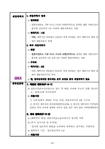 - 487 %uc7ac%uc785%uad6d%ud5c8%uac00%uf0001.%uc7ac%uc785%uad6d%ud5c8%uac00 %uba74%uc81c %uba74%uc81c%ub300%uc0c1-%uacb0%ud63c%uc774%ubbfc(F-6,%uae30%uc874 F-2-1,F-2-10%ud3ec%ud568)%uc790%uaca9%uc73c%ub85c %ub4f1%ub85d%uc744 %ud544%ud55c %uc0ac%ub78c%uc73c%ub85c%uc11c%ucd9c%uad6d%ud55c %ub0a0%ub85c%ubd80%ud130 1%ub144 %uc774%ub0b4%uc5d0 %uc7ac%uc785%uad6d%ud558%ub824%ub294 %uc0ac%ub78c%uba74%uc81c%uae30%uac04 :1%ub144-%ub2e4%ub9cc,%uccb4%ub958%uae30%uac04 %ub9cc%ub8cc%uc77c%uc774 1%ub144%ubcf4%ub2e4 %uc801%uac8c %ub0a8%uc544%uc788%ub294 %uacbd%uc6b0 %uccb4%ub958%uae30%uac04 %ubc94%uc704 %ub0b4%uc5d0%uc11c%uc7ac%uc785%uad6d%ud5c8%uac00 %uba74%uc81c2.%ubcf5%uc218 %uc7ac%uc785%uad6d%ud5c8%uac00 %ub300%uc0c1-%uacb0%ud63c%uc774%ubbfc(F-6,%uae30%uc874 F-2-1,F-2-10%ud3ec%ud568)%uc790%uaca9%uc73c%ub85c %ub4f1%ub85d%uc744 %ud544%ud55c %uc0ac%ub78c%uc73c%ub85c%uc11c %ucd9c%uad6d%ud55c %ub0a0%ub85c%ubd80%ud130 1%ub144 %ucd08%uacfc 2%ub144 %uc774%ub0b4%uc5d0 %uc7ac%uc785%uad6d%ud558%ub824%ub294 %uc0ac%ub78c%uc218%uc218%ub8cc %ud5c8%uac00%uae30%uac04 :2%ub144 -%ub2e4%ub9cc,%uccb4%ub958%uae30%uac04 %ub9cc%ub8cc%uc77c%uc774 2%ub144%ubcf4%ub2e4 %uc801%uac8c %ub0a8%uc544%uc788%ub294 %uacbd%uc6b0 %uccb4%ub958%uae30%uac04 %ubc94%uc704 %ub0b4%uc5d0%uc11c %uc7ac%uc785%uad6d%ud5c8%uac00%uae30%uac04 %ubd80%uc5ec %ub2e8,%uc785%uad6d%uaddc%uc81c%uc790%uc778 %uacbd%uc6b0%uc5d0%ub294 %ubcf8%ubd80 %uc2b9%uc778%uc744 %ubc1b%uc544 %uc7ac%uc785%uad6d%ud5c8%uac00 %ud544%uc694%uc678%uad6d%uc778%ub4f1%ub85d1. %uad6d%ubbfc%uc758 %ubc30%uc6b0%uc790(F-6-1)%uacb0%ud63c%uc774%ubbfc(F-6-1)%uc0ac%uc99d%uc73c%ub85c %uc785%uad6d %ud6c4 90%uc77c %uc774%ub0b4%uc5d0 %uc8fc%uc18c%uc9c0 %uad00%ud560 %uccad(%uc0ac%ubb34%uc18c%u318d%ucd9c%uc7a5%uc18c)%uc5d0 %uc678%uad6d%uc778%ub4f1%ub85d%uc81c%ucd9c%uc11c%ub958%u2460%uc2e0%uccad%uc11c(%ubcc4%uc9c0 %uc81c34%ud638 %uc11c%uc2dd),%uc5ec%uad8c,%ud45c%uc900%uaddc%uaca9%uc0ac%uc9c4 1%ub9e4,%uc218%uc218%ub8cc%u2461%ud55c%uad6d%uc778%ubc30%uc6b0%uc790%uc758 %ud63c%uc778%uad00%uacc4%uc99d%uba85%uc11c(%uc0c1%uc138)%u2462%ud55c%uad6d%uc778%ubc30%uc6b0%uc790%uc758 %uc8fc%ubbfc%ub4f1%ub85d%ub4f1%ubcf8%u2463%ubd80%ubd80 %uc0ac%uc774%uc5d0 %ucd9c%uc0dd%ud55c %uc790%ub140%uac00 %uc788%uc744 %uacbd%uc6b0 %uc790%ub140 %uba85%uc758 %uac00%uc871%uad00%uacc4%uc99d%uba85%uc11c2. %uc790%ub140 %uc591%uc721%uc790(F-6-2)(%uccb4%ub958%ud5c8%uac00 %ub300%uc0c1)%uacb0%ud63c%uc774%ubbfc(F-6-2)%uc0ac%uc99d%uc73c%ub85c %uc785%uad6d%ud55c %uc0ac%ub78c(%ucd94%uac00 %uc2ec%uc0ac%uae30%uc900 %ubc0f %uc720%uc758%uc810)-%uc785%uad6d%ud55c %ub0a0%ub85c%ubd80%ud130 90%uc77c%uc744 %ucd08%uacfc%ud558%uc5ec %ub4f1%ub85d%ud558%ub294 %uacbd%uc6b0%uc5d0%ub294 %uc0ac%ubc94%ucc98%ub9ac%uccb4%ub958%ud5c8%uac00 %uae30%uac04 :%uc785%uad6d%uc77c%ub85c%ubd80%ud130 1%ub144%uc81c%ucd9c%uc11c%ub958