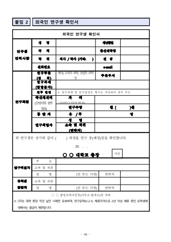 - 49 -%ubd99%uc784 2%uc678%uad6d%uc778 %uc5f0%uad6c%uc0dd %ud655%uc778%uc11c%uc678%uad6d%uc778%uc5f0%uad6c%uc0dd%ud655%uc778%uc11c%uc5f0%uad6c%uc0dd%uc778%uc801%uc0ac%ud56d%uc131 %uba85 %uc0dd%ub144%uc6d4%uc77c%uad6d %uc801%ucd9c%uc2e0%ub300%ud559%uba85%ud559 %uc704%uc11d%uc0ac /%ubc15%uc0ac (%uae30%ud0c0:)%uc804 %uacf5%uc804%ud654%ubc88%ud638e-mail%uc5f0%uad6c%uacfc%uc815%uc5f0%uad6c%uc8fc%uad00 (%uc131 %uaca9)%uc608%uc2dc)%uad50%uc721%ubd80 %uc704%ud0c1,%uc0b0%uc5c5%ubd80 %uc704%ud0c1 %ub4f1%uc8fc%uad00%ubd80%uc11c%uc5f0%uad6c%uacfc%uc81c(%ub2f4%ub2f9%ubd84%uc57c)%uc5f0%uad6c %uc77c%uc815%u203b%uc5f0%uad6c%uacfc%uc81c %ubc0f %uc5f0%uad6c%uc77c%uc815%uc740 %ubcc4%uc9c0%ub85c %uc791%uc131%ud558%uc5ec %ucca8%ubd80 %uac00%ub2a5%uad6d%ub0b4%uccb4%uc7ac%ube44(%uc99d%ube59%uc11c%ub958 %ucca8%ubd80 %ud544%uc694)%uc790 %ube44%u203b%uc794%uace0%uc99d%uba85%uc11c %ub4f1 %uc785%uc99d%uc11c%ub958 %uc81c%ucd9c %ud544%uc694%uc5f0%uad6c%uc218%ub2f9%uc6d4 ()%uc6d0%ub3d9 %ubc18 %uc790 %uc720 /%ubb34%uba85%uc5f0%uad6c%ucc45%uc784%uc790%uc131 %uba85%uc18c%uc18d %ubc0f %uc9c1%uc704(%uc5f0%ub77d%ucc98)%uc704 %uc5f0%uad6c%uc0dd%uc740 %uc0c1%uae30%uc640 %uac19%uc774 )%uacfc%uc815%uc744 %uc5f0%uad6c %uc911%uc608%uc815%uc784%uc744 %ud655%uc778%ud569%ub2c8%ub2e420...%u25cc %u25cc %ub300%ud559%uad50 %ucd1d%uc7a5%uc5f0%uad6c%ucc45%uc784%uc790%uc8fc %uc18c%uc18c%uc18d %ubc0f %uc9c1%uc704%uc131 %uba85(%uc778 %ub610%ub294 %uc11c%uba85)%uc5f0%ub77d%ucc98%uc720%ud559%uc0dd%ub2f4%ub2f9%uc790%uc18c%uc18d %ubc0f %uc9c1%uc704%uc131 %uba85(%uc778 %ub610%ub294 %uc11c%uba85)%uc5f0%ub77d%ucc98%u25cc %u25cc %ucd9c%uc785%uad6d%uc678%uad6d%uc778%uccad(%uc0ac%ubb34%uc18c%u00b7%ucd9c%uc7a5%uc18c)%uc7a5 %uadc0%ud558%u203b (%uc8fc%uc758) %ub300%ud559 %ucd1d%uc7a5 %uc9c1%uc778 %ub0a0%uc778 %uc2dc%uc5d0%ub9cc %uc720%ud6a8%ud558%uba70, %uc5f0%uad6c%uc720%ud559(D-2-5) %uccb4%ub958%uc790%uaca9%uc73c%ub85c 2%ub144 %uc774%uc0c1 %uccb4%ub958 %uc911%uc778 %uc720%ud559%uc0dd%uc5d0 %ub300%ud574%uc11c%ub294 %ubc1c%uae09%uc774 %uc81c%ud55c%ub429%ub2c8%ub2e4.%uc9c1%uc778