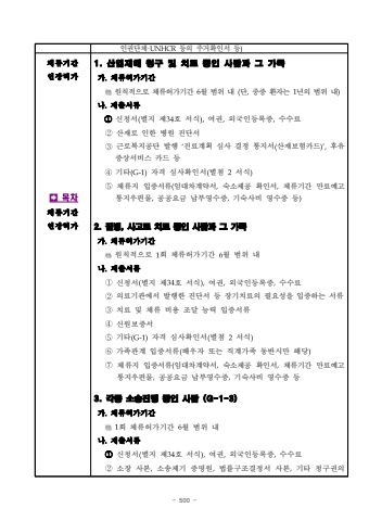 - 500 %uc778%uad8c%ub2e8%uccb4%u00b7UNHCR%ub4f1%uc758 %uc8fc%uac70%ud655%uc778%uc11c %ub4f1)%uccb4%ub958%uae30%uac04%uc5f0%uc7a5%ud5c8%uac00%uf000%ubaa9%ucc28%uccb4%ub958%uae30%uac04%uc5f0%uc7a5%ud5c8%uac001. %uc0b0%uc5c5%uc7ac%ud574 %uccad%uad6c %ubc0f %uce58%ub8cc %uc911%uc778 %uc0ac%ub78c%uacfc %uadf8 %uac00%uc871%uac00.%uccb4%ub958%ud5c8%uac00%uae30%uac04%uc6d0%uce59%uc801%uc73c%ub85c %uccb4%ub958%ud5c8%uac00%uae30%uac04 6%uc6d4 %ubc94%uc704 %ub0b4 (%ub2e8,%uc911%uc99d %ud658%uc790%ub294 1%ub144%uc758 %ubc94%uc704 %ub0b4)%ub098.%uc81c%ucd9c%uc11c%ub958%u2460%uc2e0%uccad%uc11c(%ubcc4%uc9c0 %uc81c34%ud638 %uc11c%uc2dd),%uc5ec%uad8c,%uc678%uad6d%uc778%ub4f1%ub85d%uc99d,%uc218%uc218%ub8cc%u2461%uc0b0%uc7ac%ub85c %uc778%ud55c %ubcd1%uc6d0 %uc9c4%ub2e8%uc11c%u2462%uadfc%ub85c%ubcf5%uc9c0%uacf5%ub2e8 %ubc1c%ud589 %u2018%uc9c4%ub8cc%uacc4%ud68d %uc2ec%uc0ac %uacb0%uc815 %ud1b5%uc9c0%uc11c(%uc0b0%uc7ac%ubcf4%ud5d8%uce74%ub4dc)%u2019,%ud6c4%uc720%uc99d%uc0c1%uc11c%ube44%uc2a4 %uce74%ub4dc %ub4f1%u2463%uae30%ud0c0(G-1)%uc790%uaca9 %uc2ec%uc0ac%ud655%uc778%uc11c(%ubcc4%ucca8 2%uc11c%uc2dd)%u2464%uccb4%ub958%uc9c0 %uc785%uc99d%uc11c%ub958(%uc784%ub300%ucc28%uacc4%uc57d%uc11c,%uc219%uc18c%uc81c%uacf5 %ud655%uc778%uc11c,%uccb4%ub958%uae30%uac04 %ub9cc%ub8cc%uc608%uace0 %ud1b5%uc9c0%uc6b0%ud3b8%ubb3c,%uacf5%uacf5%uc694%uae08 %ub0a9%ubd80%uc601%uc218%uc99d,%uae30%uc219%uc0ac%ube44 %uc601%uc218%uc99d %ub4f1)2. %uc9c8%ubcd1, %uc0ac%uace0%ub85c %uce58%ub8cc %uc911%uc778 %uc0ac%ub78c%uacfc %uadf8 %uac00%uc871%uac00.%uccb4%ub958%ud5c8%uac00%uae30%uac04%uc6d0%uce59%uc801%uc73c%ub85c 1%ud68c %uccb4%ub958%ud5c8%uac00%uae30%uac04 6%uc6d4 %ubc94%uc704 %ub0b4%ub098%uc81c%ucd9c%uc11c%ub958%u2460%uc2e0%uccad%uc11c(%ubcc4%uc9c0 %uc81c34%ud638 %uc11c%uc2dd),%uc5ec%uad8c,%uc678%uad6d%uc778%ub4f1%ub85d%uc99d%uc218%uc218%ub8cc%u2461%uc758%ub8cc%uae30%uad00%uc5d0%uc11c %ubc1c%ud589%ud55c %uc9c4%ub2e8%uc11c %ub4f1 %uc7a5%uae30%uce58%ub8cc%uc758 %ud544%uc694%uc131%uc744 %uc785%uc99d%ud558%ub294 %uc11c%ub958%u2462%uce58%ub8cc %ubc0f %uccb4%ub958 %ube44%uc6a9 %uc870%ub2ec %ub2a5%ub825 %uc785%uc99d%uc11c%ub958%u2463%uc2e0%uc6d0%ubcf4%uc99d%uc11c%u2464%uae30%ud0c0(G-1)%uc790%uaca9 %uc2ec%uc0ac%ud655%uc778%uc11c(%ubcc4%ucca8 2%uc11c%uc2dd)%u2465%uac00%uc871%uad00%uacc4 %uc785%uc99d%uc11c%ub958(%ubc30%uc6b0%uc790 %ub610%ub294 %uc9c1%uacc4%uac00%uc871 %ub3d9%ubc18%uc2dc%ub9cc %ud574%ub2f9)%u2466%uccb4%ub958%uc9c0 %uc785%uc99d%uc11c%ub958(%uc784%ub300%ucc28%uacc4%uc57d%uc11c,%uc219%uc18c%uc81c%uacf5 %ud655%uc778%uc11c,%uccb4%ub958%uae30%uac04 %ub9cc%ub8cc%uc608%uace0 %ud1b5%uc9c0%uc6b0%ud3b8%ubb3c,%uacf5%uacf5%uc694%uae08 %ub0a9%ubd80%uc601%uc218%uc99d,%uae30%uc219%uc0ac%ube44 %uc601%uc218%uc99d %ub4f13. %uac01%uc885 %uc18c%uc1a1%uc9c4%ud589 %uc911%uc778 %uc0ac%ub78c (G-1-3)%uac00.%uccb4%ub958%ud5c8%uac00%uae30%uac041%ud68c %uccb4%ub958%ud5c8%uac00%uae30%uac04 6%uc6d4 %ubc94%uc704 %ub0b4%ub098.%uc81c%ucd9c%uc11c%ub958%u2460%uc2e0%uccad%uc11c(%ubcc4%uc9c0 %uc81c34%ud638 %uc11c%uc2dd),%uc5ec%uad8c,%uc678%uad6d%uc778%ub4f1%ub85d%uc99d,%uc218%uc218%ub8cc%u2461%uc18c%uc7a5 %uc0ac%ubcf8,%uc18c%uc1a1%uc81c%uae30 %uc99d%uba85%uc6d0,%ubc95%ub960%uad6c%uc870%uacb0%uc815%uc11c %uc0ac%ubcf8,%uae30%ud0c0 %uccad%uad6c%uad8c%uc758