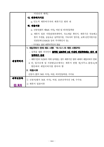 - 504 %ubbf8%uc131%ub144%uc790 %uc81c%uc678)%ub098.%uccb4%ub958%ud5c8%uac00%uae30%uac04%uc778%ub3c4%uc801 %uccb4%ub958%ud5c8%uac00%uc790%uc758 %uccb4%ub958%uae30%uac04 %ubc94%uc704 %ub0b4%ub77c.%uc81c%ucd9c%uc11c%ub958%uc2e0%uccad%uc11c(%ubcc4%uc9c0 %uc81c34%ud638 %uc11c%uc2dd),%uc5ec%uad8c %ubc0f %uc678%uad6d%uc778%ub4f1%ub85d%uc99d%uccb4%ub958%uc9c0 %uc785%uc99d %uc11c%ub958(%uc784%ub300%ucc28%uacc4%uc57d%uc11c,%uc219%uc18c%uc81c%uacf5 %ud655%uc778%uc11c,%uccb4%ub958%uae30%uac04 %ub9cc%ub8cc%uc608%uace0 %ud1b5%uc9c0 %uc6b0%ud3b8%ubb3c,%uacf5%uacf5%uc694%uae08 %ub0a9%ubd80%uc601%uc218%uc99d,%uae30%uc219%uc0ac%ube44 %uc601%uc218%uc99d,%uad50%ud68c%u00b7%ub09c%ubbfc%uc9c0%uc6d0%uc2dc%uc124%u00b7%uc778%uad8c%ub2e8%uccb4%u00b7UNHCR%ub4f1%uc758 %uc8fc%uac70%ud655%uc778%uc11c %ub4f1)*%uc218%uc218%ub8cc%ub294%uc77c%ubc18%uccb4%ub958%uc678%uad6d%uc778%uacfc%ub3d9%uc77c%uc7ac%uc785%uad6d%ud5c8%uac001. %uc7ac%uc785%uad6d%ud5c8%uac00 %uba74%uc81c %uc81c%ub3c4 %uc2dc%ud589(%u201810.12.1.%uc790 %uac1c%uc815 %uc2dc%ud589%uaddc%uce59)-%ub4f1%ub85d%uc744 %ud544%ud55c %uc678%uad6d%uc778%uc774 %ucd9c%uad6d%ud55c %ub0a0%ub85c%ubd80%ud130 1%ub144 %uc774%ub0b4%uc5d0 %uc7ac%uc785%uad6d%ud558%ub824%ub294%uacbd%uc6b0 %uc7ac%uc785%uad6d%ud5c8%uac00 %uba74%uc81c-%uccb4%ub958%uae30%uac04%uc774 1%ub144%ubcf4%ub2e4 %uc801%uac8c %ub0a8%uc544%uc788%ub294 %uacbd%uc6b0 %uccb4%ub958%uae30%uac04 %ubc94%uc704 %ub0b4%uc5d0%uc11c %uc7ac%uc785%uad6d%ud5c8%uac00 %uba74%uc81c%u203b%ub2e8,%uc785%uad6d%uaddc%uc81c %ubc0f %uc0ac%uc99d%ubc1c%uae09%uaddc%uc81c%uc790%ub294 %uccb4%ub958%uc9c0 %uad00%ud560 %uccad(%uc0ac%ubb34%uc18c%u00b7%ucd9c%uc7a5%uc18c)%uc5d0 %ubc29%ubb38%ud558%uc5ec %uc7ac%uc785%uad6d%ud5c8%uac00%ub97c %ubc1b%uc544%uc57c %ud5682. %uc81c%ucd9c%uc11c%ub958%uc2e0%uccad%uc11c (%ubcc4%uc9c0 34%ud638 %uc11c%uc2dd),%uc5ec%uad8c,%uc678%uad6d%uc778%ub4f1%ub85d%uc99d,%uc218%uc218%ub8cc%uc678%uad6d%uc778%ub4f1%ub85d%uf000%ubaa9%ucc28%u2460%uc2e0%uccad%uc11c(%ubcc4%uc9c0 34%ud638 %uc11c%uc2dd),%uc5ec%uad8c,%ud45c%uc900%uaddc%uaca9%uc0ac%uc9c4 1%ub9e4,%uc218%uc218%ub8cc%u2461%uccb4%ub958%uc9c0 %uc785%uc99d%uc11c%ub958