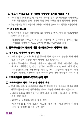 - 513 -%u25a1%uc5f0%uace0%uc640 %ubb34%uc5f0%uace0%ub3d9%ud3ec %ub4f1 %ub300%uc0c1%ubcc4 %uc0ac%uc99d%ubc1c%uae09 %uc808%ucc28%ub97c %ub2e4%ub974%uac8c %uc801%uc6a9%u25cb%uad6d%ub0b4 %uce5c%uc871 %ub4f1%uc774 %uc788%ub294 %uc5f0%uace0%ub3d9%ud3ec%uc640 %uc720%ud559%uc0dd %ubd80%ubaa8 %ub4f1 %uc0ac%uc99d%ubc1c%uae09 %ud2b9%ub840%ub300%uc0c1%uc740 %ucd08%uccad %ud5c8%uc6a9%uc778%uc6d0%uc758 %ubc94%uc704 %ub0b4%uc5d0%uc11c %uad6d%ubbfc %ub4f1%uc758 %ucd08%uccad%uc744 %ubc1b%uc544 %uc785%uad6d%ud558%uac8c %ub429%ub2c8%ub2e4.%u25cb%ubb34%uc5f0%uace0%ub3d9%ud3ec%ub294 %uad6d%ub0b4 %ub178%ub3d9%uc2dc%uc7a5 %uc0c1%ud669%uc744 %uace0%ub824%ud558%uc5ec %uc21c%ucc28%uc801%uc73c%ub85c %uc785%uad6d%uc744 %ud5c8%uc6a9%ud569%ub2c8%ub2e4.%u25a1%ucde8%uc5c5%uc808%ucc28 %uac04%uc18c%ud654 %u25cb%ubc29%ubb38%ucde8%uc5c5%uc81c %ub3d9%ud3ec%ub294 %ubc29%ubb38%ucde8%uc5c5(H-2)%ucde8%uc5c5%ud65c%ub3d9 %ubc94%uc704(<%ubcc4%ucca8 3>%ucc38%uc870)%uc5d0%uc11c%ub9cc %ucde8%uc5c5%uc774 %uac00%ub2a5%ud569%ub2c8%ub2e4.-%ucde8%uc5c5%ud76c%ub9dd%uc790%ub294 %ucde8%uc5c5%uad50%uc721 %uc774%uc218 %ubc0f %uad6c%uc9c1%uc2e0%uccad %ud6c4 %uad6c%uc9c1%uc54c%uc120%uc744 %ubc1b%uac70%ub098 %uc790%uc728%uad6c%uc9c1%uc73c%ub85c %ucde8%uc5c5%ud560 %uc218 %uc788%uace0,%uadfc%ubb34%ucc98 %ubcc0%uacbd%ub3c4 %uc2e0%uace0%ub9cc%uc73c%ub85c %uac00%ub2a53. %uc911%uad6d%u2024%uad6c%uc18c%ub828%uc9c0%uc5ed %ub3d9%ud3ec%uc5d0 %ub300%ud55c %uc7ac%uc678%ub3d9%ud3ec(F-4) %uc790%uaca9%ubd80%uc5ec %uc81c%ub3c4%u25a1%uc7ac%uc678%ub3d9%ud3ec %uc790%uaca9%ubd80%uc5ec %ub300%uc0c1%uc758 %ud655%ub300%u25cb%ubaa8%uad6d%uacfc %ub3d9%ud3ec %uac04 %uad50%ub958 %ud655%ub300 %ubc0f %ub3d9%ud3ec%uc758 %uad6d%ub0b4 %ubc95%uc801%uc9c0%uc704 %ud5a5%uc0c1%uc744 %uc704%ud574 %uc7ac%uc678%ub3d9%ud3ec %uc790%uaca9%ubd80%uc5ec %ub300%uc0c1%uc744 %uacc4%uc18d %ud655%ub300%ud574 %uac00%uace0 %uc788%uc2b5%ub2c8%ub2e4.-%uc911%uad6d%u2024%uad6c%uc18c%ub828%uc9c0%uc5ed %ub3d9%ud3ec%ub97c %ub300%uc0c1%uc73c%ub85c %ub2e8%uc21c%ub178%ubb34 %uc885%uc0ac %uac00%ub2a5%uc131%uc774 %uc801%uc740 %uad6d%u00b7%ub0b4%uc678 %ub300%ud559%uc878%uc5c5%uc790,%ubc95%uc778%uae30%uc5c5%ub300%ud45c,%uc790%uaca9%uc99d %uc18c%uc9c0%uc790,60%uc138 %uc774%uc0c1 %ub3d9%ud3ec,%uc0ac%ud68c%ud1b5%ud569%ud504%ub85c%uadf8%ub7a8 4%ub2e8%uacc4%uc774%uc0c1 %uc774%uc218%uc790,%uad6d%ub0b4 %uace0%ub4f1%ud559%uad50 %uc878%uc5c5%uc790,%uad6d%ub0b4 %ucd08%uc911%uace0 %uc7ac%ud559%uc790,%uc694%uc591%ubcf4%ud638 %uc790%uaca9 %ucde8%ub4dd%uc790 %ub4f1%uc5d0 %ub300%ud574 %uc7ac%uc678%ub3d9%ud3ec %uc790%uaca9 %ubd80%uc5ec4. %uc678%uad6d%uad6d%uc801%ub3d9%ud3ec %uc601%uc8fc(F-5)%uc790%uaca9 %ubd80%uc5ec %uc81c%ub3c4%u25a1%uc678%uad6d%uad6d%uc801%ub3d9%ud3ec %uc601%uc8fc %uc790%uaca9%ubd80%uc5ec %ub300%uc0c1%uc758 %ud655%ub300%u25cb%uad6d%ub0b4 %uacc4%uc18d %uccb4%ub958 %ubc0f %uacbd%uc81c%ud65c%ub3d9%uc758 %uc790%uc720 %ub4f1 %ub3d9%ud3ec%uc758 %uad6d%ub0b4 %ubc95%uc801%uc9c0%uc704 %ud5a5%uc0c1%uc744 %uc704%ud574 %uc678%uad6d%uad6d%uc801%ub3d9%ud3ec%ub97c %uc704%ud55c %uc601%uc8fc%uc790%uaca9%uc744 %uc815%ud558%uace0 %ub300%uc0c1%uc744 %ud655%ub300%ud574 %uac00%uace0 %uc788%uc2b5%ub2c8%ub2e4.-%uc7ac%uc678%ub3d9%ud3ec(F-4)%uc790%uaca9%uc73c%ub85c 2%ub144 %uc774%uc0c1 %uccb4%ub958 %uc911%uc774%uba70 %uc18c%ub4dd%u00b7%uc7ac%uc0b0 %ub4f1 %uc77c%uc815%uc694%uac74%uc744 %uac16%ucd98 %uacbd%uc6b0 -%ub300%ud55c%ubbfc%uad6d %uad6d%uc801%ucde8%ub4dd%uc694%uac74%uc744 %uac16%ucd98 %uacbd%uc6b0-%ubc29%ubb38%ucde8%uc5c5(H-2)%uc790%uaca9 %ub3d9%ud3ec%uac00 %uc81c%uc870%uc5c5%u2024%ub18d%ucd95%uc0b0%uc5c5%u2024%uc5b4%uc5c5 %ubd84%uc57c%uc5d0%uc11c %uc7a5%uae30 %uadfc%uc18d %ubc0f %uc77c%uc815%ud55c %uc694%uac74%uc744 %uac16%ucd98 %uacbd%uc6b0%uf000%ubaa9%ucc28