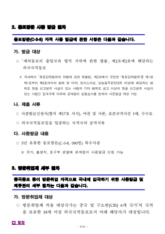 - 515 -2. %ub3d9%ud3ec%ubc29%ubb38 %uc0ac%uc99d %ubc1c%uae09 %uc808%ucc28%ub3d9%ud3ec%ubc29%ubb38(C-3-8)%uc790%uaca9 %uc0ac%uc99d %ubc1c%uae09%uc5d0 %uad00%ud55c %uc0ac%ud56d%uc740 %ub2e4%uc74c%uacfc %uac19%uc2b5%ub2c8%ub2e4.%uac00. %ubc1c%uae09 %ub300%uc0c1%u25cb%u300c%uc7ac%uc678%ub3d9%ud3ec%uc758 %ucd9c%uc785%uad6d%uacfc %ubc95%uc801 %uc9c0%uc704%uc5d0 %uad00%ud55c %ubc95%ub960%u300d%uc81c2%uc870%uc81c2%ud638%uc5d0 %ud574%ub2f9%ub418%ub294 %uc678%uad6d%uad6d%uc801%ub3d9%ud3ec%u203b%uad6d%ub0b4%uc5d0%uc11c%u300c%ud2b9%uc815%uac15%ub825%ubc94%uc8c4%uc758%ucc98%ubc8c%uc5d0%uad00%ud55c%ud2b9%ubcc4%ubc95%u300d%uc81c2%uc870%uc5d0%uc11c%uaddc%uc815%ud55c%u2018%ud2b9%uc815%uac15%ub825%ubc94%uc8c4%u2019%uc911%uc81c1%ud56d%uc81c1%ud638%ubd80%ud130%uc81c6%ud638%uae4c%uc9c0%uc758%ubc94%uc8c4%ubc0f%ub9c8%uc57d,%ubcf4%uc774%uc2a4%ud53c%uc2f1,%uc0c1%uc2b5%uc74c%uc8fc%uc6b4%uc804(3%ud68c%uc774%uc0c1)%uc5d0%ud574%ub2f9%ud558%ub294%ubc94%uc8c4%ub85c%ud615%uc744%uc120%uace0%ubc1b%uc740%uc0ac%uc2e4%uc774%uc788%ub294%uc0ac%ub78c%uacfc%uae30%ud0c0%ubc94%uc8c4%ub85c%uae08%uace0%uc774%uc0c1%uc758%ud615%uc744%uc120%uace0%ubc1b%uc740%uc0ac%uc2e4%uc774%uc788%ub294%uc0ac%ub78c%uc740%uc785%uad6d%uaddc%uc81c%uc5ec%ubd80%uc5d0%uad00%uacc4%uc5c6%uc774%uc2e4%uc9c8%uc2ec%uc0ac%ub97c%ud1b5%ud558%uc5ec%uc0ac%uc99d%ubc1c%uae09%uc81c%ud55c%uac00%ub2a5%ub098. %uc81c%ucd9c %uc11c%ub958%u25cb%uc0ac%uc99d%ubc1c%uae09%uc2e0%uccad%uc11c(%ubcc4%uc9c0 %uc81c17%ud638 %uc11c%uc2dd),%uc5ec%uad8c %ubc0f %uc0ac%ubcf8,%ud45c%uc900%uaddc%uaca9%uc0ac%uc9c4 1%ub9e4,%uc218%uc218%ub8cc%u25cb%uc678%uad6d%uad6d%uc801%ub3d9%ud3ec%uc784%uc744 %uc785%uc99d%ud558%ub294 %uad6d%uc801%uad6d%uc758 %uacf5%uc801%uc11c%ub958%ub2e4. %uc0ac%uc99d%ubc1c%uae09 %ub0b4%uc6a9%u25cb5%ub144 %uc720%ud6a8%ud55c %ub3d9%ud3ec%ubc29%ubb38(C-3-8,090%uc77c)%ubcf5%uc218%uc0ac%uc99d%u203b%uad6d%uac00,%ucd9c%uc0dd%uc9c0,%ud638%uad6c%ubd80%uad00%ud560%uc5d0%uad00%uacc4%uc5c6%uc774%uc0ac%uc99d%ubc1c%uae09%uc2e0%uccad%uac00%ub2a53. %ubc29%ubb38%ucde8%uc5c5%uc81c %uc138%ubd80 %uc808%ucc28%uc911%uad6d%ub3d9%ud3ec %ub4f1%uc774 %ubc29%ubb38%ucde8%uc5c5 %uc790%uaca9%uc73c%ub85c %uad6d%ub0b4%uc5d0 %uc785%uad6d%ud558%uae30 %uc704%ud55c %uc0ac%uc99d%ubc1c%uae09 %ubc0f %uccb4%ub958%uad00%ub9ac %uc138%ubd80 %uc808%ucc28%ub294 %ub2e4%uc74c%uacfc %uac19%uc2b5%ub2c8%ub2e4.%uac00. %ubc29%ubb38%ucde8%uc5c5%uc81c %ub300%uc0c1%u25cb%ubc29%ubb38%ucde8%uc5c5%uc81c %uc801%uc6a9 %ub300%uc0c1%uad6d%uac00%ub294 %uc911%uad6d %ubc0f %uad6c%uc18c%ub828(CIS)6%uac1c %uad6d%uac00*%uc758 %uad6d%uc801%uc744 %ubcf4%uc720%ud55c 18%uc138 %uc774%uc0c1 %uc678%uad6d%uad6d%uc801%ub3d9%ud3ec%ub85c%uc11c %uc544%ub798 %ud574%ub2f9%uc790%uac00 %ub300%uc0c1%uc785%ub2c8%ub2e4.%uf000%ubaa9%ucc28