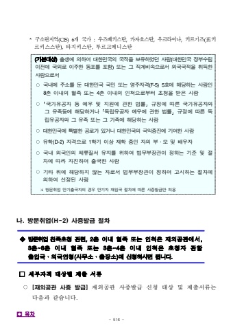 - 516 -*%uad6c%uc18c%ub828%uc9c0%uc5ed(CIS)6%uac1c %uad6d%uac00 :%uc6b0%uc988%ubca0%ud0a4%uc2a4%ud0c4,%uce74%uc790%ud750%uc2a4%ud0c4,%uc6b0%ud06c%ub77c%uc774%ub098,%ud0a4%ub974%uae30%uc988(%u820a%ud0a4%ub974%ud0a4%uc2a4%uc2a4%ud0c4),%ud0c0%uc9c0%ud0a4%uc2a4%ud0c4,%ud22c%ub974%ud06c%uba54%ub2c8%uc2a4%ud0c4(%uae30%ubcf8%ub300%uc0c1)%ucd9c%uc0dd%uc5d0 %uc758%ud558%uc5ec %ub300%ud55c%ubbfc%uad6d%uc758 %uad6d%uc801%uc744 %ubcf4%uc720%ud558%uc600%ub358 %uc0ac%ub78c(%ub300%ud55c%ubbfc%uad6d %uc815%ubd80%uc218%ub9bd %uc774%uc804%uc5d0 %uad6d%uc678%ub85c %uc774%uc8fc%ud55c %ub3d9%ud3ec%ub97c %ud3ec%ud568)%ub610%ub294 %uadf8 %uc9c1%uacc4%ube44%uc18d%uc73c%ub85c%uc11c %uc678%uad6d%uad6d%uc801%uc744 %ucde8%ub4dd%ud55c %uc0ac%ub78c%uc73c%ub85c%uc11c %u25cb%uad6d%ub0b4%uc5d0 %uc8fc%uc18c%ub97c %ub454 %ub300%ud55c%ubbfc%uad6d %uad6d%ubbfc %ub610%ub294%uc601%uc8fc%uc790%uaca9(F-5)5%ud638%uc5d0%ud574%ub2f9%ud558%ub294%uc0ac%ub78c%uc7788%ucd0c %uc774%ub0b4%uc758 %ud608%uc871 %ub610%ub294 4%ucd0c %uc774%ub0b4%uc758 %uc778%ucc99%uc73c%ub85c%ubd80%ud130 %ucd08%uccad%uc744 %ubc1b%uc740 %uc0ac%ub78c%u25cb%uff62%uad6d%uac00%uc720%uacf5%uc790 %ub4f1 %uc608%uc6b0 %ubc0f %uc9c0%uc6d0%uc5d0 %uad00%ud55c %ubc95%ub960%uff63%uaddc%uc815%uc5d0 %ub530%ub978 %uad6d%uac00%uc720%uacf5%uc790%uc640 %uadf8 %uc720%uc871%ub4f1%uc5d0 %ud574%ub2f9%ud558%uac70%ub098 %uff62%ub3c5%ub9bd%uc720%uacf5%uc790 %uc608%uc6b0%uc5d0 %uad00%ud55c %ubc95%ub960%uff63%uaddc%uc815%uc5d0 %ub530%ub978 %ub3c5%ub9bd%uc720%uacf5%uc790%uc640 %uadf8 %uc720%uc871 %ub610%ub294 %uadf8 %uac00%uc871%uc5d0 %ud574%ub2f9%ud558%ub294 %uc0ac%ub78c%u25cb%ub300%ud55c%ubbfc%uad6d%uc5d0 %ud2b9%ubcc4%ud55c %uacf5%ub85c%uac00 %uc788%uac70%ub098 %ub300%ud55c%ubbfc%uad6d%uc758 %uad6d%uc775%uc99d%uc9c4%uc5d0 %uae30%uc5ec%ud55c %uc0ac%ub78c%u25cb%uc720%ud559(D-2)%uc790%uaca9%uc73c%ub85c 1%ud559%uae30 %uc774%uc0c1 %uc7ac%ud559 %uc911%uc778 %uc790%uc758 %ubd80%u2024%ubaa8 %ubc0f %ubc30%uc6b0%uc790%u25cb%uad6d%ub0b4 %uc678%uad6d%uc778%uc758 %uccb4%ub958%uc9c8%uc11c %uc720%uc9c0%ub97c %uc704%ud558%uc5ec %ubc95%ubb34%ubd80%uc7a5%uad00%uc774 %uc815%ud558%ub294 %uae30%uc900%ubc0f %uc808%ucc28%uc5d0 %ub530%ub77c %uc790%uc9c4%ud558%uc5ec %ucd9c%uad6d%ud55c %uc0ac%ub78c%uae30%ud0c0 %uc704%uc5d0 %ud574%ub2f9%ud558%uc9c0 %uc54a%ub294 %uc790%ub85c%uc11c %ubc95%ubb34%ubd80%uc7a5%uad00%uc774 %uc815%ud558%uc5ec %uace0%uc2dc%ud558%ub294 %uc808%ucc28%uc5d0 %uc758%ud558%uc5ec %uc120%uc815%ub41c %uc0ac%ub78c%u203b%ubc29%ubb38%ucde8%uc5c5 %ub9cc%uae30%ucd9c%uad6d%uc790%uc758 %uacbd%uc6b0 %ub9cc%uae30%uc790 %uc7ac%uc785%uad6d %uc808%ucc28%uc5d0 %ub530%ub978 %uc0ac%uc99d%ubc1c%uae09%ub9cc %ud5c8%uc6a9%ub098. %ubc29%ubb38%ucde8%uc5c5(H-2) %uc0ac%uc99d%ubc1c%uae09 %uc808%ucc28%u25c8%ubc29%ubb38%ucde8%uc5c5 %uce5c%uc871%ucd08%uccad %uad00%ub828,2%ucd0c %uc774%ub0b4 %ud608%uc871 %ub610%ub294 %uc778%ucc99%uc740 %uc7ac%uc678%uacf5%uad00%uc5d0%uc11c,3%ucd0c~8%ucd0c %uc774%ub0b4 %ud608%uc871 %ub610%ub294 3%ucd0c~4%ucd0c %uc774%ub0b4 %uc778%ucc99%uc740 %ucd08%uccad%uc790 %uad00%ud560%ucd9c%uc785%uad6d%u318d%uc678%uad6d%uc778%uccad(%uc0ac%ubb34%uc18c%u318d%ucd9c%uc7a5%uc18c)%uc5d0 %uc2e0%uccad%ud558%uc2dc%uba74 %ub429%ub2c8%ub2e4.%u25a1%uc138%ubd80%uc790%uaca9 %ub300%uc0c1%ubcc4 %uc81c%ucd9c %uc11c%ub958%u25cb[%uc7ac%uc678%uacf5%uad00 %uc0ac%uc99d %ubc1c%uae09] %uc7ac%uc678%uacf5%uad00 %uc0ac%uc99d%ubc1c%uae09 %uc2e0%uccad %ub300%uc0c1 %ubc0f %uc81c%ucd9c%uc11c%ub958%ub294 %ub2e4%uc74c%uacfc %uac19%uc2b5%ub2c8%ub2e4.%uf000%ubaa9%ucc28