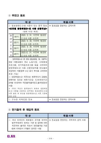- 518 -%u2461 %ubb34%uc5f0%uace0 %ub3d9%ud3ec%ub300 %uc0c1%uc81c %ucd9c %uc11c %ub958%u25cb%ub3d9%ud3ec%ubc29%ubb38(C-3-8)%uc0ac%uc99d%uc774%uc788%ub294%uc911%uad6d%ub3d9%ud3ec<%uc5f0%ub3c4%ubcc4%ubc29%ubb38%ucde8%uc5c5(H-2)%uc0ac%uc99d%uc2e0%uccad%ub300%uc0c1>(18%uc138%ubbf8%ub9cc%uc81c%uc678)2024%ub144%uc2e0%uccad%ub300%uc0c11%ubd84%uae302023.3.31.%uc774%uc804%uc5d0%ubc1c%uae09%ub41cC-3-8%uc0ac%uc99d%uc18c%uc9c0%uc7902%ubd84%uae302023.6.30.%uc774%uc804%uc5d0%ubc1c%uae09%ub41cC-3-8%uc0ac%uc99d%uc18c%uc9c0%uc7903%ubd84%uae302023.9.30.%uc774%uc804%uc5d0%ubc1c%uae09%ub41cC-3-8%uc0ac%uc99d%uc18c%uc9c0%uc7904%ubd84%uae302023.12.31.%uc774%uc804%uc5d0%ubc1c%uae09%ub41cC-3-8%uc0ac%uc99d%uc18c%uc9c0%uc790-%ubc29%ubb38%ucde8%uc5c5(H-2)%ucd1d%uc815%uc6d0(250,000%uba85,%u201822.1%uc6d4%ubd80%ud130%ubcc0%uacbd%uc2dc%ud589)%ub0b4%uc5d0%uc11c%uad6d%ub0b4%ub178%ub3d9%uc2dc%uc7a5,%uc0ac%ud68c%ud1b5%ud569%ud504%ub85c%uadf8%ub7a8,%uc870%uae30%uc801%uc751%ud504%ub85c%uadf8%ub7a8%ub4f1%uc744%uace0%ub824%ud558%uc5ec%ubc29%ubb38%ucde8%uc5c5(H-2)%uc0ac%uc99d%uc2e0%uccad%ub300%uc0c1%uc790%ub97c%uc5f0%ub3c4%ubcc4%ub85c%uc870%uc815%ud558%uc5ec%uc2dc%ud589(%ud5a5%ud6c4H-2%uc99d%uac00%ucd94%uc774%ub97c%uace0%ub824%ud558%uc5ec%uc870%uc815%uac00%ub2a5)%u25cb%ubc29%ubb38%ucde8%uc5c5(H-2)%uc790%uaca9%uc73c%ub85c%uccb4%ub958%ud558%ub2e4%uac00%uac10%uc5fc%ubcd1,%ucc9c%uc7ac%uc9c0%ubcc0%ub4f1%uc73c%ub85c%uccb4%ub958%uae30%uac04%uc744%ub3c4%uacfc(%uc704%ubc18%uae30%uac043%uac1c%uc6d4%uc774%ub0b4)%ud558%uc5ec%uc790%uc9c4%ucd9c%uad6d(%ucd9c%uad6d%uad8c%uace0,%ucd9c%uad6d%uba85%ub839)%ud55c%uc0ac%ub78c%u203b(%uc8fc%uc758)%ubb34%uc5f0%uace0%uc911%uad6d%ub3d9%ud3ec%uac00%ucd5c%ucd08%ub85c%ubc29%ubb38%ucde8%uc5c5(H-2)%uc0ac%uc99d%uc744%uc2e0%uccad%ud558%ub294%uacbd%uc6b0%uc5d0%ub294%ub3d9%ud3ec%ubc29%ubb38(C-3-8)%uc0ac%uc99d%ubc1c%uae09%ud6c4%uc5f0%ub3c4%ubcc4%ubc29%ubb38%ucde8%uc5c5(H-2)%uc0ac%uc99d%uae30%uc900%uc5d0%ub530%ub77c%uc2e0%uccad%u2022%ub3d9%ud3ec%uc784%uc744%uc99d%uba85%ud558%ub294%uacf5%uc801%uc11c%ub958%u25cb%uad6c%uc18c%ub828%uc9c0%uc5ed(CIS)%ub3d9%ud3ec%u2462 %ub9cc%uae30%ucd9c%uad6d %ud6c4 %uc7ac%uc785%uad6d %ub3d9%ud3ec%ub300 %uc0c1%uc81c %ucd9c %uc11c %ub958%u25cb%uad6d%ub0b4%uc678%uad6d%uc778%uc758%uccb4%ub958%uc9c8%uc11c%uc720%uc9c0%ub97c%uc704%ud558%uc5ec%ubc95%ubb34%ubd80%uc7a5%uad00%uc774%uc815%ud558%ub294%uae30%uc900%ubc0f%uc808%ucc28%uc5d0%ub530%ub77c%uc790%uc9c4%ud558%uc5ec%ucd9c%uad6d%ud55c%uc790%ub85c%uc11c%uc644%uc804%ucd9c%uad6d%uc77c%uae30%uc90060%uc138%uc774%ud558%ub85c%uc11c1%uac1c%uc6d4%uc774%uacbd%uacfc%ud55c%uc0ac%ub78c%u2022%ub3d9%ud3ec%uc784%uc744%uc99d%uba85%ud558%ub294%uad6d%uc801%uad6d%uc758%uf000%ubaa9%ucc28