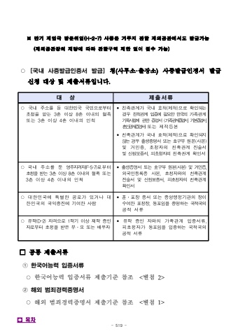 - 519 -%u203b%ub9cc%uae30%uc7ac%uc785%uad6d%ubc29%ubb38%ucde8%uc5c5(H-2-7)%uc0ac%uc99d%uc740%uac70%uc8fc%uc9c0%uad00%ud560%uc7ac%uc678%uacf5%uad00%uc5d0%uc11c%ub3c4%ubc1c%uae09%uac00%ub2a5(%uc7ac%uc678%uacf5%uad00%uc7a5%uc758%uc7ac%ub7c9%uc5d0%ub530%ub77c%uad00%ud560%uad6c%uc5ed%uc81c%ud55c%uc5c6%uc774%uc811%uc218%uac00%ub2a5)%u25cb[%uad6d%ub0b4 %uc0ac%uc99d%ubc1c%uae09%uc778%uc99d%uc11c %ubc1c%uae09] %uccad(%uc0ac%ubb34%uc18c%u00b7%ucd9c%uc7a5%uc18c)%uc0ac%uc99d%ubc1c%uae09%uc778%uc815%uc11c %ubc1c%uae09 %uc2e0%uccad %ub300%uc0c1 %ubc0f %uc81c%ucd9c%uc11c%ub958%uc785%ub2c8%ub2e4.%ub300 %uc0c1%uc81c %ucd9c %uc11c %ub958%u25cb%uad6d%ub0b4%uc8fc%uc18c%ub97c%ub454%ub300%ud55c%ubbfc%uad6d%uad6d%ubbfc%uc73c%ub85c%ubd80%ud130%ucd08%uccad%uc744%ubc1b%ub2943%ucd0c%uc774%uc0c18%ucd0c%uc774%ub0b4%uc758%ud608%uc871%ub610%ub2943%ucd0c%uc774%uc0c14%ucd0c%uc774%ub0b4%uc758%uc778%ucc99%u2022%uce5c%uc871%uad00%uacc4%uac00%uad6d%ub0b4%ud638%uc801(%uc81c%uc801)%uc73c%ub85c%ud655%uc778%ub418%ub294%uacbd%uc6b0%uce5c%ucc99%uad00%uacc4%uc785%uc99d%uc5d0%ud544%uc694%ud55c%ud55c%uad6d%uc758%uac00%uc871%uad00%uacc4%uae30%ub85d%uc0ac%ud56d%uc5d0%uad00%ud55c%uc99d%uba85%uc11c(%uac00%uc871%uad00%uacc4%uc99d%uba85%uc11c,%uae30%ubcf8%uc99d%uba85%uc11c,%ud63c%uc778%uad00%uacc4%uc99d%uba85%uc11c)%ub610%ub294%uc81c%uc801%ub4f1%ubcf8%u2022%uce5c%uc871%uad00%uacc4%uac00%uad6d%ub0b4%ud638%uc801(%uc81c%uc801)%uc73c%ub85c%ud655%uc778%ub418%uc9c0%uc54a%ub294%uacbd%uc6b0%ucd9c%uc0dd%uc99d%uba85%uc11c%ub610%ub294%ud638%uad6c%ubd80%uc6d0%ubcf8(%uc0ac%ubcf8)%ubc0f%uac70%ubbfc%uc99d,%ucd08%uccad%uc790%uc758%uce5c%uc871%uad00%uacc4%uc9c4%uc220%uc11c%ubc0f%uc2e0%uc6d0%ubcf4%uc99d%uc11c,%ud53c%ucd08%uccad%uc790%uc758%uce5c%uc871%uad00%uacc4%ud655%uc778%uc11c%u25cb%uad6d%ub0b4%uc8fc%uc18c%ub97c%ub454%uc601%uc8fc%uc790%uaca9%uc790(F-5-7)%ub85c%ubd80%ud130%ucd08%uccad%uc744%ubc1b%ub2943%ucd0c%uc774%uc0c18%ucd0c%uc774%ub0b4%uc758%ud608%uc871%ub610%ub2943%ucd0c%uc774%uc0c14%ucd0c%uc774%ub0b4%uc758%uc778%ucc99%u2022%ucd9c%uc0dd%uc99d%uba85%uc11c%ub610%ub294%ud638%uad6c%ubd80%uc6d0%ubcf8(%uc0ac%ubcf8)%ubc0f%uac70%ubbfc%uc99d,%uc678%uad6d%uc778%ub4f1%ub85d%uc99d%uc0ac%ubcf8,%ucd08%uccad%uc790%uc640%uc758%uce5c%uc871%uad00%uacc4%uc9c4%uc220%uc11c%ubc0f%uc2e0%uc6d0%ubcf4%uc99d%uc11c,%ud53c%ucd08%uccad%uc790%uc758%uce5c%uc871%uad00%uacc4%ud655%uc778%uc11c%u25cb%ub300%ud55c%ubbfc%uad6d%uc5d0%ud2b9%ubcc4%ud55c%uacf5%ub85c%uac00%uc788%uac70%ub098%ub300%ud55c%ubbfc%uad6d%uc758%uad6d%uc775%uc99d%uc9c4%uc5d0%uae30%uc5ec%ud55c%uc0ac%ub78c%u2022%ud6c8%u2024%ud3ec%uc7a5%uc99d%uc11c%ub610%ub294%uc911%uc559%ud589%uc815%uae30%uad00%uc758%uc7a5%uc774%uc218%uc5ec%ud55c%ud45c%ucc3d%uc7a5,%ub3d9%ud3ec%uc784%uc744%uc99d%uba85%ud558%ub294%uad6d%uc801%uad6d%uc758%uacf5%uc801%uc11c%ub958%u25cb%uc720%ud559(D-2)%uc790%uaca9%uc73c%ub85c1%ud559%uae30%uc774%uc0c1%uc7ac%ud559%uc911%uc778%uc790%ub85c%ubd80%ud130%ucd08%uccad%uc744%ubc1b%uc740%ubd80%u2024%ubaa8%ub610%ub294%ubc30%uc6b0%uc790%u2022%uc720%ud559%uc911%uc778%uc790%uc640%uc758%uac00%uc871%uad00%uacc4%uc785%uc99d%uc11c%ub958,%ud53c%ucd08%uccad%uc790%uac00%ub3d9%ud3ec%uc784%uc744%uc785%uc99d%ud558%ub294%uad6d%uc801%uad6d%uc758%uacf5%uc801%uc11c%ub958%u25a1%uacf5%ud1b5 %uc81c%ucd9c%uc11c%ub958%u2460 %ud55c%uad6d%uc5b4%ub2a5%ub825 %uc785%uc99d%uc11c%ub958%u25cb%ud55c%uad6d%uc5b4%ub2a5%ub825 %uc785%uc99d%uc11c%ub958 %uc81c%ucd9c%uae30%uc900 %ucc38%uc870 <%ubcc4%ucca8 2>%u2461 %ud574%uc678 %ubc94%uc8c4%uacbd%ub825%uc99d%uba85%uc11c%u25cb%ud574%uc678 %ubc94%uc8c4%uacbd%ub825%uc99d%uba85%uc11c %uc81c%ucd9c%uae30%uc900 %ucc38%uc870 <%ubcc4%ucca8 1>%uf000%ubaa9%ucc28