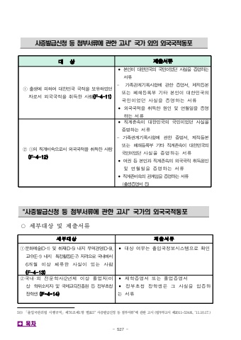 - 527 -%uc0ac%uc99d%ubc1c%uae09%uc2e0%uccad %ub4f1 %ucca8%ubd80%uc11c%ub958%uc5d0 %uad00%ud55c %uace0%uc2dc%u201d%uad6d%uac00 %uc678%uc758 %uc678%uad6d%uad6d%uc801%ub3d9%ud3ec%ub300 %uc0c1%uc81c%ucd9c%uc11c%ub958%u2460%ucd9c%uc0dd%uc5d0%uc758%ud558%uc5ec%ub300%ud55c%ubbfc%uad6d%uad6d%uc801%uc744%ubcf4%uc720%ud558%uc600%ub358%uc790%ub85c%uc11c%uc678%uad6d%uad6d%uc801%uc744%ucde8%ub4dd%ud55c%uc0ac%ub78c(F-4-11)%u2022%ubcf8%uc778%uc774%ub300%ud55c%ubbfc%uad6d%uc758%uad6d%ubbfc%uc774%uc5c8%ub358%uc0ac%uc2e4%uc744%uc99d%uba85%ud558%ub294%uc11c%ub958-%uac00%uc871%uad00%uacc4%uae30%ub85d%uc0ac%ud56d%uc5d0%uad00%ud55c%uc99d%uba85%uc11c,%uc81c%uc801%ub4f1%ubcf8%ub610%ub294%ud3d0%uc1c4%ub4f1%ub85d%ubd80%uae30%ud0c0%ubcf8%uc778%uc774%ub300%ud55c%ubbfc%uad6d%uc758%uad6d%ubbfc%uc774%uc5c8%ub358%uc0ac%uc2e4%uc744%uc99d%uba85%ud558%ub294%uc11c%ub958%u2022%uc678%uad6d%uad6d%uc801%uc744%ucde8%ub4dd%ud55c%uc6d0%uc778%ubc0f%uc5f0%uc6d4%uc77c%uc744%uc99d%uba85%ud558%ub294%uc11c%ub958%u2461%u2460%uc758%uc9c1%uacc4%ube44%uc18d%uc73c%ub85c%uc11c%uc678%uad6d%uad6d%uc801%uc744%ucde8%ub4dd%ud55c%uc0ac%ub78c(F-4-12)%u2022%uc9c1%uacc4%uc874%uc18d%uc774%ub300%ud55c%ubbfc%uad6d%uc758%uad6d%ubbfc%uc774%uc5c8%ub358%uc0ac%uc2e4%uc744%uc99d%uba85%ud558%ub294%uc11c%ub958-%uac00%uc871%uad00%uacc4%uae30%ub85d%uc0ac%ud56d%uc5d0%uad00%ud55c%uc99d%uba85%uc11c,%uc81c%uc801%ub4f1%ubcf8%ub610%ub294%ud3d0%uc1c4%ub4f1%ub85d%ubd80%uae30%ud0c0%uc9c1%uacc4%uc874%uc18d%uc774%ub300%ud55c%ubbfc%uad6d%uc758%uad6d%ubbfc%uc774%uc5c8%ub358%uc0ac%uc2e4%uc744%uc99d%uba85%ud558%ub294%uc11c%ub958%u2022%uc5ec%uad8c%ub4f1%ubcf8%uc778%uacfc%uc9c1%uacc4%uc874%uc18d%uc758%uc678%uad6d%uad6d%uc801%ucde8%ub4dd%uc6d0%uc778%ubc0f%uc5f0%uc6d4%uc77c%uc744%uc99d%uba85%ud558%ub294%uc11c%ub958%uc9c1%uacc4%uc874%ube44%uc18d%uc758%uad00%uacc4%uc784%uc744%uc99d%uba85%ud558%ub294%uc11c%ub958(%ucd9c%uc0dd%uc99d%uba85%uc11c%ub4f1)%u201c%uc0ac%uc99d%ubc1c%uae09%uc2e0%uccad %ub4f1 %ucca8%ubd80%uc11c%ub958%uc5d0 %uad00%ud55c %uace0%uc2dc%u201d%uad6d%uac00%uc758 %uc678%uad6d%uad6d%uc801%ub3d9%ud3ec%u25cb%uc138%ubd80%ub300%uc0c1 %ubc0f %uc81c%ucd9c%uc11c%ub95850)%u300c%ucd9c%uc785%uad6d%uad00%ub9ac%ubc95 %uc2dc%ud589%uaddc%uce59%u300d%uc81c76%uc870%uc81c1%ud56d %ubcc4%ud45c5%u201c %uc0ac%uc99d%ubc1c%uae09%uc2e0%uccad %ub4f1 %ucca8%ubd80%uc11c%ub958%u201d%uc5d0 %uad00%ud55c %uace0%uc2dc (%ubc95%ubb34%ubd80%uace0%uc2dc%uc81c2011-534%ud638, %u201811.10.17.)%uc138%ubd80%ub300%uc0c1%uc81c%ucd9c%uc11c%ub958%u2460%ubb38%ud654%uc608%uc220(D-1)%ubc0f%ucde8%uc7ac(D-5)%ub0b4%uc9c0%ubb34%uc5ed%uacbd%uc601(D-9),%uad50%uc218(E-1)%ub0b4%uc9c0%ud2b9%uc815%ud65c%ub3d9(E-7)%uc790%uaca9%uc73c%ub85c%uad6d%ub0b4%uc5d0%uc11c6%uac1c%uc6d4%uc774%uc0c1%uccb4%ub958%ud55c%uc0ac%uc2e4%uc774%uc788%ub294%uc0ac%ub78c(F-4-13)%u2022%ub300%uc0c1%uc5ec%ubd80%ub294%ucd9c%uc785%uad6d%uc815%ubcf4%uc2dc%uc2a4%ud15c%uc73c%ub85c%ud655%uc778%u2461%uad6d%ub0b4%u00b7%uc678%uc804%ubb38%ud559%uc0ac(2%ub144%uc81c%uc774%uc0c1%uc878%uc5c5%uc790)%uc774%uc0c1%ud559%uc704%uc18c%uc9c0%uc790%ubc0f%uad6d%uc81c%uad50%uc721%uc9c4%ud765%uc6d0%ub4f1%uc815%ubd80%ucd08%uccad%uc7a5%ud559%uc0dd(F-4-14)%u2022%uc7ac%ud559%uc99d%uba85%uc11c%ub610%ub294%uc878%uc5c5%uc99d%uba85%uc11c%u2022%uc815%ubd80%ucd08%uccad%uc7a5%ud559%uc0dd%uc740%uadf8%uc0ac%uc2e4%uc744%uc785%uc99d%ud558%ub294%uc11c%ub958%uf000%ubaa9%ucc28