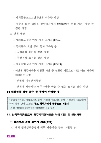 - 537 --%uc0ac%ud68c%ud1b5%ud569%ud504%ub85c%uadf8%ub7a8 5%ub2e8%uacc4 %uc774%uc218%ud55c %uc0ac%ub78c-%uc601%uc8fc%uc6a9 %ub610%ub294 %uadc0%ud654%uc6a9 %uc885%ud569%ud3c9%uac00%uc5d0%uc11c 60%uc810(100%uc810 %ub9cc%uc810 %uae30%uc900)%uc774%uc0c1 %ub4dd%uc810%ud55c %uc0ac%ub78c%u25cb%uba74%uc81c %ub300%uc0c1-%uc7ac%uc678%ub3d9%ud3ec 2%ub144 %uc774%uc0c1 %uc790%uaca9 %uc18c%uc9c0%uc790(F-5-6)-%uad6d%uc801%ucde8%ub4dd %uc694%uac74 %uad6c%ube44 %ub3d9%ud3ec(F-5-7)%uc911%u00b7%uad6d%uc801%ud68c%ubcf5 %uc694%uac74%uc744 %uac16%ucd98 %uc0ac%ub78c%u00b7%ud2b9%ubcc4%uadc0%ud654 %uc694%uac74%uc744 %uac16%ucd98 %uc0ac%ub78c-%ubc29%ubb38%ucde8%uc5c5 4%ub144 %uc774%uc0c1 %uc790%uaca9 %uc18c%uc9c0%uc790(F-5-14)-%ube44%uba74%uc81c %uc601%uc8fc%uc790%uaca9%uc744 %uc2e0%uccad%ud55c %uc0ac%ub78c %uc911 %uc2e0%uccad%uc77c %uae30%uc900%uc73c%ub85c %ub2e4%uc74c %uc5b4%ub290 %ud558%ub098%uc5d0 %ud574%ub2f9%ud558%ub294 %uc0ac%ub78c%u00b7%ubbfc%ubc95%uc0c1 %ubbf8%uc131%ub144%uc678%uad6d%uc778%u00b7%uba74%uc81c%uc5d0 %ud574%ub2f9%ub418%ub294 %uc601%uc8fc%uc790%uaca9%uc744 %ubc1b%uc744 %uc218 %uc788%ub294 %uc694%uac74%uc744 %uac16%ucd98 %uc0ac%ub78c%ub300%ud55c%ubbfc%uad6d %ubc95%ub839 %uc900%uc218 %ub4f1 %ud488%ud589%uc774 %ub2e8%uc815%ud560 %uac83%u300c%ucd9c%uc785%uad6d%uad00%ub9ac%ubc95%u300d%uc81c10%uc870%uc7583,%ub3d9%ubc95 %uc2dc%ud589%ub839 12%uc870%uc7582,%ub3d9%ubc95 %uc2dc%ud589%uaddc%uce59 18%uc870%uc7584%uc5d0 %ub530%ub77c %ud488%ud589 %ub2e8%uc815 %uc694%uac74%uc740 %ub3d9%ud3ec %uc601%uc8fc%uc790%uaca9%uc5d0 %uacf5%ud1b5%uc73c%ub85c %uc801%uc6a9%ub428%u203b %ubcf8 %ub9e4%ub274%uc5bc%uc758 %uc601%uc8fc(F-5)%uc758 %u201c%ud488%ud589%ub2e8%uc815%u201d %uc694%uac74 %ucc38%uc870%ub098. %uc678%uad6d%uad6d%uc801%ub3d9%ud3ec%ub85c%uc11c %uc601%uc8fc%uc790%uaca9(F-5)%uc744 %ubd80%uc5ec %ub300%uc0c1 %ubc0f %uc2e0%uccad%uc11c%ub958%u25a1%ud574%uc678%ubc94%uc8c4 %uacbd%ub825 %ud655%uc778%uc11c %uc81c%ucd9c(%uacf5%ud1b5)%u25cb%ud574%uc678 %ubc94%uc8c4%uacbd%ub825%uc99d%uba85%uc11c %uc138%ubd80 %uc81c%ucd9c%uae30%uc900 %ucc38%uc870 <%ubcc4%ucca8 1>%uf000%ubaa9%ucc28