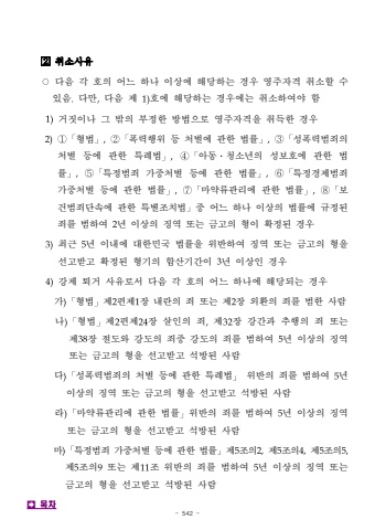 - 542 -%uf000 %ucde8%uc18c%uc0ac%uc720%u25cb%ub2e4%uc74c %uac01 %ud638%uc758 %uc5b4%ub290 %ud558%ub098 %uc774%uc0c1%uc5d0 %ud574%ub2f9%ud558%ub294 %uacbd%uc6b0 %uc601%uc8fc%uc790%uaca9 %ucde8%uc18c%ud560 %uc218 %uc788%uc74c.%ub2e4%ub9cc,%ub2e4%uc74c %uc81c 1)%ud638%uc5d0 %ud574%ub2f9%ud558%ub294 %uacbd%uc6b0%uc5d0%ub294 %ucde8%uc18c%ud558%uc5ec%uc57c %ud5681)%uac70%uc9d3%uc774%ub098 %uadf8 %ubc16%uc758 %ubd80%uc815%ud55c %ubc29%ubc95%uc73c%ub85c %uc601%uc8fc%uc790%uaca9%uc744 %ucde8%ub4dd%ud55c %uacbd%uc6b02)%u2460%u300c%ud615%ubc95%u300d,%u2461%u300c%ud3ed%ub825%ud589%uc704 %ub4f1 %ucc98%ubc8c%uc5d0 %uad00%ud55c %ubc95%ub960%u300d,%u2462%u300c%uc131%ud3ed%ub825%ubc94%uc8c4%uc758 %ucc98%ubc8c %ub4f1%uc5d0 %uad00%ud55c %ud2b9%ub840%ubc95%u300d,%u2463%u300c%uc544%ub3d9%u2024%uccad%uc18c%ub144%uc758 %uc131%ubcf4%ud638%uc5d0 %uad00%ud55c %ubc95%ub960%u300d,%u2464%u300c%ud2b9%uc815%ubc94%uc8c4 %uac00%uc911%ucc98%ubc8c %ub4f1%uc5d0 %uad00%ud55c %ubc95%ub960%u300d,%u2465%u300c%ud2b9%uc815%uacbd%uc81c%ubc94%uc8c4 %uac00%uc911%ucc98%ubc8c %ub4f1%uc5d0 %uad00%ud55c %ubc95%ub960%u300d,%u2466%u300c%ub9c8%uc57d%ub958%uad00%ub9ac%uc5d0 %uad00%ud55c %ubc95%ub960%u300d,%u2467%u300c%ubcf4%uac74%ubc94%uc8c4%ub2e8%uc18d%uc5d0 %uad00%ud55c %ud2b9%ubcc4%uc870%uce58%ubc95%u300d%uc911 %uc5b4%ub290 %ud558%ub098 %uc774%uc0c1%uc758 %ubc95%ub960%uc5d0 %uaddc%uc815%ub41c %uc8c4%ub97c %ubc94%ud558%uc5ec 2%ub144 %uc774%uc0c1%uc758 %uc9d5%uc5ed %ub610%ub294 %uae08%uace0%uc758 %ud615%uc774 %ud655%uc815%ub41c %uacbd%uc6b03)%ucd5c%uadfc 5%ub144 %uc774%ub0b4%uc5d0 %ub300%ud55c%ubbfc%uad6d %ubc95%ub960%uc744 %uc704%ubc18%ud558%uc5ec %uc9d5%uc5ed %ub610%ub294 %uae08%uace0%uc758 %ud615%uc744 %uc120%uace0%ubc1b%uace0 %ud655%uc815%ub41c %ud615%uae30%uc758 %ud569%uc0b0%uae30%uac04%uc774 3%ub144 %uc774%uc0c1%uc778 %uacbd%uc6b04)%uac15%uc81c %ud1f4%uac70 %uc0ac%uc720%ub85c%uc11c %ub2e4%uc74c %uac01 %ud638%uc758 %uc5b4%ub290 %ud558%ub098%uc5d0 %ud574%ub2f9%ub418%ub294 %uacbd%uc6b0%uac00)%u300c%ud615%ubc95%u300d%uc81c2%ud3b8%uc81c1%uc7a5 %ub0b4%ub780%uc758 %uc8c4 %ub610%ub294 %uc81c2%uc7a5 %uc678%ud658%uc758 %uc8c4%ub97c %ubc94%ud55c %uc0ac%ub78c%ub098)%u300c%ud615%ubc95%u300d%uc81c2%ud3b8%uc81c24%uc7a5 %uc0b4%uc778%uc758 %uc8c4,%uc81c32%uc7a5 %uac15%uac04%uacfc %ucd94%ud589%uc758 %uc8c4 %ub610%ub294 %uc81c38%uc7a5 %uc808%ub3c4%uc640 %uac15%ub3c4%uc758 %uc8c4%uc911 %uac15%ub3c4%uc758 %uc8c4%ub97c %ubc94%ud558%uc5ec 5%ub144 %uc774%uc0c1%uc758 %uc9d5%uc5ed %ub610%ub294 %uae08%uace0%uc758 %ud615%uc744 %uc120%uace0%ubc1b%uace0 %uc11d%ubc29%ub41c %uc0ac%ub78c%ub2e4)%u300c%uc131%ud3ed%ub825%ubc94%uc8c4%uc758 %ucc98%ubc8c %ub4f1%uc5d0 %uad00%ud55c %ud2b9%ub840%ubc95%u300d%uc704%ubc18%uc758 %uc8c4%ub97c %ubc94%ud558%uc5ec 5%ub144 %uc774%uc0c1%uc758 %uc9d5%uc5ed %ub610%ub294 %uae08%uace0%uc758 %ud615%uc744 %uc120%uace0%ubc1b%uace0 %uc11d%ubc29%ub41c %uc0ac%ub78c%ub77c)%u300c%ub9c8%uc57d%ub958%uad00%ub9ac%uc5d0 %uad00%ud55c %ubc95%ub960%u300d%uc704%ubc18%uc758 %uc8c4%ub97c %ubc94%ud558%uc5ec 5%ub144 %uc774%uc0c1%uc758 %uc9d5%uc5ed %ub610%ub294 %uae08%uace0%uc758 %ud615%uc744 %uc120%uace0%ubc1b%uace0 %uc11d%ubc29%ub41c %uc0ac%ub78c%ub9c8)%u300c%ud2b9%uc815%ubc94%uc8c4 %uac00%uc911%ucc98%ubc8c %ub4f1%uc5d0 %uad00%ud55c %ubc95%ub960%u300d%uc81c5%uc870%uc7582,%uc81c5%uc870%uc7584,%uc81c5%uc870%uc7585,%uc81c5%uc870%uc7589%ub610%ub294 %uc81c11%uc870 %uc704%ubc18%uc758 %uc8c4%ub97c %ubc94%ud558%uc5ec 5%ub144 %uc774%uc0c1%uc758 %uc9d5%uc5ed %ub610%ub294 %uae08%uace0%uc758 %ud615%uc744 %uc120%uace0%ubc1b%uace0 %uc11d%ubc29%ub41c %uc0ac%ub78c%uf000%ubaa9%ucc28