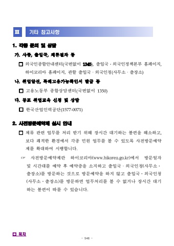 - 546 -%u2162%uae30%ud0c0 %ucc38%uace0%uc0ac%ud56d1. %uac01%uc885 %ubb38%uc758 %ubc0f %uc0c1%ub2f4%uac00.%uc0ac%uc99d,%ucd9c%uc785%uad6d,%uccb4%ub958%uc808%ucc28 %ub4f1%u25a1%uc678%uad6d%uc778%uc885%ud569%uc548%ub0b4%uc13c%ud130(%uad6d%ubc88%uc5c6%uc774 1345),%ucd9c%uc785%uad6d%u2024%uc678%uad6d%uc778%uc815%ucc45%ubcf8%ubd80 %ud648%ud398%uc774%uc9c0,%ud558%uc774%ucf54%ub9ac%uc544 %ud648%ud398%uc774%uc9c0,%uad00%ud560 %ucd9c%uc785%uad6d%u318d%uc678%uad6d%uc778%uccad(%uc0ac%ubb34%uc18c%u318d%ucd9c%uc7a5%uc18c)%ub098.%ucde8%uc5c5%uc54c%uc120,%ud2b9%ub840%uace0%uc6a9%uac00%ub2a5%ud655%uc778%uc11c %ubc1c%uae09 %ub4f1%u25a1%uace0%uc6a9%ub178%ub3d9%ubd80 %uc885%ud569%uc0c1%ub2f4%uc13c%ud130(%uad6d%ubc88%uc5c6%uc774 1350)%ub2e4.%ub3d9%ud3ec %ucde8%uc5c5%uad50%uc721 %uc2e0%uccad %ubc0f %uc0c1%ub2f4%u25a1%ud55c%uad6d%uc0b0%uc5c5%uc778%ub825%uacf5%ub2e8(1577-0071)2. %uc0ac%uc804%ubc29%ubb38%uc608%uc57d%uc81c %uc2e4%uc2dc %uc548%ub0b4%u25a1%uccb4%ub958 %uad00%ub828 %uc5c5%ubb34%ub97c %ucc98%ub9ac %ubc1b%uae30 %uc704%ud574 %uc7a5%uc2dc%uac04 %ub300%uae30%ud558%ub294 %ubd88%ud3b8%uc744 %ud574%uc18c%ud558%uace0%ubcf4%ub2e4 %ucf8c%uc801%ud55c %ud658%uacbd%uc5d0%uc11c %uac01%uc885 %ubbfc%uc6d0 %uc5c5%ubb34%ub97c %ubcfc %uc218 %uc788%ub3c4%ub85d %uc0ac%uc804%ubc29%ubb38%uc608%uc57d%uc81c%ub97c %ud655%ub300%ud558%uc5ec %uc2dc%ud589%ud569%ub2c8%ub2e4.%u261e %uc0ac%uc804%ubc29%ubb38%uc608%uc57d%uc81c%ub780 %ud558%uc774%ucf54%ub9ac%uc544(www.hikorea.go.kr)%uc5d0%uc11c %ubc29%ubb38%uc77c%uc790 %ubc0f %uc2dc%uac04%ub300%ub97c %uc608%uc57d %ud6c4 %uc608%uc57d%uc99d%uc744 %uc18c%uc9c0%ud558%uace0 %ucd9c%uc785%uad6d%u318d%uc678%uad6d%uc778%uccad(%uc0ac%ubb34%uc18c%u00b7%ucd9c%uc7a5%uc18c)%ub97c %ubc29%ubb38%ud558%ub294 %uac83%uc73c%ub85c %ubc29%ubb38%uc608%uc57d%uc744 %ud558%uc9c0 %uc54a%uace0 %ucd9c%uc785%uad6d%u00b7%uc678%uad6d%uc778%uccad(%uc0ac%ubb34%uc18c%u00b7%ucd9c%uc7a5%uc18c)%ub97c %ubc29%ubb38%ud558%uba74 %uc5c5%ubb34%ucc98%ub9ac%ub97c %ubcfc %uc218 %uc5c6%uac70%ub098 %uc7a5%uc2dc%uac04 %ub300%uae30%ud558%ub294 %ubd88%ud3b8%uc774 %ub530%ub97c %uc218 %uc788%uc2b5%ub2c8%ub2e4.%uf000%ubaa9%ucc28