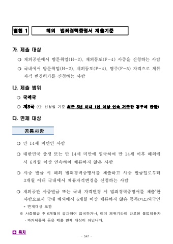 - 547 -%ubcc4%ucca8 1%ud574%uc678 %ubc94%uc8c4%uacbd%ub825%uc99d%uba85%uc11c %uc81c%ucd9c%uae30%uc900%uac00. %uc81c%ucd9c %ub300%uc0c1%u274d %uc7ac%uc678%uacf5%uad00%uc5d0%uc11c %ubc29%ubb38%ucde8%uc5c5(H-2), %uc7ac%uc678%ub3d9%ud3ec(F-4) %uc0ac%uc99d%uc744 %uc2e0%uccad%ud558%ub294 %uc0ac%ub78c%u274d %uad6d%ub0b4%uc5d0%uc11c %ubc29%ubb38%ucde8%uc5c5(H-2), %uc7ac%uc678%ub3d9%ud3ec(F-4), %uc601%uc8fc(F-5) %uc790%uaca9%uc73c%ub85c %uccb4%ub958%uc790%uaca9 %ubcc0%uacbd%ud5c8%uac00%ub97c %uc2e0%uccad%ud558%ub294 %uc0ac%ub78c%ub098. %uc81c%ucd9c %ubc94%uc704%u274d %uad6d%uc801%uad6d%u274d %uc81c3%uad6d(%ub2e8,%uc2e0%uccad%uc77c%uae30%uc900%ucd5c%uadfc5%ub144%uc774%ub0b41%ub144%uc774%uc0c1%uc5f0%uc18d%uac70%uc8fc%ud55c%uacbd%uc6b0%uc5d0%ud55c%ud568)%ub2e4. %uba74%uc81c %ub300%uc0c1%uacf5%ud1b5%uc0ac%ud56d%u274d %ub9cc 14%uc138 %ubbf8%ub9cc%uc778 %uc0ac%ub78c%u274d %ub300%ud55c%ubbfc%uad6d %ucd9c%uc0dd %ub610%ub294 %ub9cc 14%uc138 %ubbf8%ub9cc%uc5d0 %uc785%uad6d%ud558%uc5ec %ub9cc 14%uc138 %uc774%ud6c4 %ud574%uc678%uc5d0%uc11c 6%uac1c%uc6d4 %uc774%uc0c1 %uc5f0%uc18d%ud558%uc5ec %uccb4%ub958%ud558%uc9c0 %uc54a%uc740 %uc0ac%ub78c%u274d %uc0ac%uc99d %ubc1c%uae09 %uc2dc %ud574%uc678 %ubc94%uc8c4%uacbd%ub825%uc99d%uba85%uc11c%ub97c %uc81c%ucd9c%ud558%uace0 %uc0ac%uc99d %ubc1c%uae09%uc77c%ub85c%ubd80%ud130 3%uac1c%uc6d4 %uc774%ub0b4 %uad6d%ub0b4%uc5d0%uc11c %uccb4%ub958%uc790%uaca9%ubcc0%uacbd%uc744 %uc2e0%uccad%ud558%ub294 %uc0ac%ub78c%u274d %uc7ac%uc678%uacf5%uad00 %uc0ac%uc99d%ubc1c%uae09 %ub610%ub294 %uad6d%ub0b4 %uc790%uaca9%ubcc0%uacbd %uc2dc %ubc94%uc8c4%uacbd%ub825%uc99d%uba85%uc11c%ub97c %uc81c%ucd9c*%ud55c %uc0ac%ub78c%uc73c%ub85c%uc11c %uad6d%ub0b4 %ud574%uc678%uc5d0%uc11c 6%uac1c%uc6d4 %uc774%uc0c1 %uccb4%ub958%ud558%uc9c0 %uc54a%uc740 %ub4f1%ub85d(%uac70%uc18c)%uc678%uad6d%uc778* %uba74%uc81c%ub300%uc0c1 %ud3ec%ud568%u203b%uc0ac%uc99d%ubc1c%uae09%ud6c46%uac1c%uc6d4%uc774%uacbd%uacfc%ud558%uc5ec%uc785%uad6d%ud558%uac70%ub098,%uc774%ubbf8%uccb4%ub958%uae30%uac04%uc774%ub9cc%ub8cc%ub41c%ubd88%ubc95%uccb4%ub958%uc790%u2027%uacfc%uac70%uccb4%ub958%uc790%ub4f1%uc740%uc81c%ucd9c%uba74%uc81c%ub300%uc0c1%uc774%uc544%ub2d9%ub2c8%ub2e4.%uf000%ubaa9%ucc28