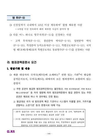 - 549 -%uc601 %uc8fc(F-5)%u274d %uc2e0%uccad%uc77c%uae4c%uc9c0 %uad6d%ub0b4%uc5d0%uc11c 10%ub144 %uc774%uc0c1 %uacc4%uc18d%ud558%uc5ec*%ud569%ubc95 %uccb4%ub958%ud55c %uc0ac%ub78c* 6%uac1c%uc6d4 %uc774%uc0c1 %uc5f0%uc18d%ud558%uc5ec %ud574%uc678 %uccb4%ub958%ud55c %uc0ac%uc2e4%uc774 %uc5c6%uc5b4%uc57c %ud568%u274d %ub2e4%uc74c %uc5b4%ub290 %ud558%ub098%ub85c %uc601%uc8fc%uc790%uaca9(F-5)%uc744 %uc2e0%uccad%ud558%ub294 %uc0ac%ub78c- %uace0%uc561 %ud22c%uc790%uc790(F-5-5), %ucca8%ub2e8%ubd84%uc57c %ubc15%uc0ac(F-5-9), %uc77c%ubc18%ubd84%uc57c %ubc15%uc0ac(F-5-15), %ud2b9%uc815%ubd84%uc57c %ub2a5%ub825%uc18c%uc720%uc790(F-5-11), %ud2b9%ubcc4%uacf5%ub85c%uc790(F-5-12), %uad6d%uc801%ubc95 %uc81c7%uc870%uc81c1%ud56d%uc81c2%ud638%uc758 %ud2b9%ubcc4%uacf5%ub85c%uc790%ub85c %ub3d9%ud3ec%uc601%uc8fc(F-5-7)%ub97c %uc2e0%uccad%ud558%ub294 %uc0ac%ub78c%ub77c. %ubc94%uc8c4%uacbd%ub825%uc99d%uba85%uc11c %uc694%uac741.%ubc1c%uae09%uae30%uad00 %ubc0f %ub0b4%uc6a9 %u274d %uc81c%ucd9c %ub300%uc0c1%uc790%uc758 %uad6d%uc801%uad6d%uc81c%uad6d%uc5d0 %uc18c%uc7ac%ud558%ub294%uad8c%ud55c %uc788%ub294 %uae30%uad00%uc774 %ubc1c%uae09%ud55c %uacf5%uc801%ubb38%uc11c%ub85c%uc11c,%uad6d%uc801%uad6d(%uc81c3%uad6d)%ub0b4%uc5d0%uc11c%uc758 %ubaa8%ub4e0 %ubc94%uc8c4%uacbd%ub825%uc774 %ud3ec%ud568%ub418%uc5b4 %uc788%ub294 %uc99d%uba85%uc11c%u2460 %uc8fc%ud55c %uacf5%uad00%uc774 %ubc1c%uae09%ud55c %ubc94%uc8c4%uacbd%ub825%uc778%uc815%uc11c%ub294 %ubd88%uc778%uc815(%ub2e8, %uc8fc%ud55c %ub7ec%uc2dc%uc544%ub300%uc0ac%uad00*, %uc8fc%ud55c %ud22c%ub974%ud06c%uba54%ub2c8%uc2a4%ud0c4%ub300%uc0ac%uad00** %ub4f1 %uc790%uad6d %ubc95%ub839%uc5d0 %ub530%ub77c %ubc94%uc8c4%uacbd%ub825%uc99d%uba85%uc11c %ubc1c%uae09 %uad8c%ud55c%uc774 %uc788%ub294 %uc8fc%ud55c %uacf5%uad00%uc740 %uc608%uc678%ub85c %ud558%ub098 %uc774 %uacbd%uc6b0%uc5d0%ub3c4 %uc778%uc99d %ud544%uc694)%u2461 %ubc1c%uae09%ub300%uc0c1 %uad6d%uac00 %ub0b4 %ubc94%uc8c4%uacbd%ub825 %ud655%uc778 %uae30%uad00%uc774%ub098 %uc2dc%uc2a4%ud15c%uc774 %ubbf8%ud761%ud560 %uacbd%uc6b0, %uac70%uc8fc%uc9c0%ub97c %uad00%ud560%ud558%ub294 %uc18c%uad00%uae30%uad00*%ub4f1%uc758 %uc99d%uba85%uc11c%ub85c %ub300%uccb4 %uac00%ub2a5*(%uc911%uad6d)%ubc1c%uae09%uae30%uad00%u2024%uc591%uc2dd%u2024%uba85%uce6d%ub4f1%uc774%ud1b5%uc77c%ub418%uc5b4%uc788%uc9c0%uc544%ub2c8%ud55c%uc810%uace0%ub824,%u201c%ubc94%uc8c4%uacbd%ub825%uc99d%uba85%uc5d0%uc0c1%uc751%ud558%ub294%ubaa8%ub4e0%ubb38%uc11c(%ud30c%ucd9c%uc18c%ubc1c%uae09%ubcf8%ud3ec%ud568)%u201d%uc778%uc815*(%ubbf8%uad6d)FBI%ubcf8%ubd80%uc758%ubc94%uc8c4%uacbd%ub825%uc99d%uba85%uc11c(%ubcf8%uc778%uc774%uc9c1%uc811%ubc1c%uae09%ubc1b%uac70%ub098FBI%uc5d0%uc11c%uacf5%uc778%ud55c%ucc44%ub110%uc744%ud1b5%ud558%uc5ec%ubc1c%uae09)%ub97c%uc81c%ucd9c%ubc1b%ub294%uac83%uc744%uc6d0%uce59%uc73c%ub85c%ud558%ub418,%uc8fc%uc815%ubd80%uc5d0%uc11c%ubc1c%uae09%ud55c%ubc94%uc8c4%uacbd%ub825%uc99d%uba85%uc11c%ub3c4%ubbf8%uad6d%uc804%uc5ed%uc758%ubc94%uc8c4%uacbd%ub825%uc774%ud3ec%ud568%ub418%uc5b4%ubc1c%uae09%ub41c%uacbd%uc6b0%uc778%uc815%uf000%ubaa9%ucc28