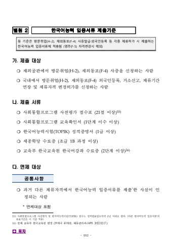- 552 -%ubcc4%ucca8 2%ud55c%uad6d%uc5b4%ub2a5%ub825 %uc785%uc99d%uc11c%ub958 %uc81c%ucd9c%uae30%uc900%ub3d9 %uae30%uc900%uc740 %ubc29%ubb38%ucde8%uc5c5(H-2), %uc7ac%uc678%ub3d9%ud3ec(F-4) %uc0ac%uc99d%ubc1c%uae09%u00b7%uc678%uad6d%uc778%ub4f1%ub85d %ub4f1 %uac01%uc885 %uccb4%ub958%ud5c8%uac00 %uc2dc %uc81c%ucd9c%ud558%ub294 %ud55c%uad6d%uc5b4%ub2a5%ub825 %uc785%uc99d%uc11c%ub958%uc5d0 %uc801%uc6a9%ub428 (%uc601%uc8fc(F-5) %uc790%uaca9%ubcc0%uacbd%uc2dc %uc81c%uc678)%uac00. %uc81c%ucd9c %ub300%uc0c1%u274d %uc7ac%uc678%uacf5%uad00%uc5d0%uc11c %ubc29%ubb38%ucde8%uc5c5(H-2),%uc7ac%uc678%ub3d9%ud3ec(F-4)%uc0ac%uc99d%uc744 %uc2e0%uccad%ud558%ub294 %uc0ac%ub78c%u274d %uad6d%ub0b4%uc5d0%uc11c %ubc29%ubb38%ucde8%uc5c5(H-2),%uc7ac%uc678%ub3d9%ud3ec(F-4)%uc678%uad6d%uc778%ub4f1%ub85d,%uac70%uc18c%uc2e0%uace0,%uccb4%ub958%uae30%uac04 %uc5f0%uc7a5 %ubc0f %uccb4%ub958%uc790%uaca9 %ubcc0%uacbd%ud5c8%uac00%ub97c %uc2e0%uccad%ud558%ub294 %uc0ac%ub78c%ub098. %uc81c%ucd9c %uc11c%ub958%u274d %uc0ac%ud68c%ud1b5%ud569%ud504%ub85c%uadf8%ub7a8 %uc0ac%uc804%ud3c9%uac00 %uc810%uc218%ud45c (21%uc810 %uc774%uc0c1)55)%u274d %uc0ac%ud68c%ud1b5%ud569%ud504%ub85c%uadf8%ub7a8 %uad50%uc721%ud655%uc778%uc11c (1%ub2e8%uacc4 %uc774%uc218 %uc774%uc0c1)%u274d %ud55c%uad6d%uc5b4%ub2a5%ub825%uc2dc%ud5d8(TOPIK)%uc131%uc801%uc99d%uba85%uc11c (1%uae09 %uc774%uc0c1)%u274d %uc138%uc885%ud559%ub2f9 %uc218%ub8cc%uc99d (%ucd08%uae09 1B%uacfc%uc815 %uc774%uc0c1)%u274d %uad50%uc721%ubd80 %ud55c%uad6d%uad50%uc721%uc6d0 %ud55c%uad6d%uc5b4%uac15%uc88c %uc218%ub8cc%uc99d (2%ub2e8%uacc4 %uc774%uc0c1%ub2e4. %uba74%uc81c %ub300%uc0c1%uacf5%ud1b5%uc0ac%ud56d%u274d %uacfc%uac70 %ub2e4%ub978 %uccb4%ub958%uc790%uaca9%uc5d0%uc11c %ud55c%uad6d%uc5b4%ub2a5%ub825 %uc785%uc99d%uc11c%ub958%ub97c %uc81c%ucd9c*%ud55c %uc0ac%uc2e4%uc774 %uc778%uc815%ub418%ub294 %uc0ac%ub78c* %uba74%uc81c%ub300%uc0c1 %ud3ec%ud56855)%uc0ac%ud68c%ud1b5%ud569%ud504%ub85c%uadf8%ub7a8 %uc0ac%uc804%ud3c9%uac00 %ubc0f %ud55c%uad6d%uc5b4%ub2a5%ub825%uc2dc%ub7fc(TOPIK) %uc810%uc218%ub294 %uc131%uc801%ubc1c%ud45c%uc77c%ub85c%ubd80%ud130 2%ub144 %uc774%ub0b4%ub85c %ud55c%ub2e4. (%ub2e4%ub978 %ud55c%uad6d%uc5b4%ub2a5%ub825 %uc785%uc99d%uc11c%ub958%u2018%uc758 %uc720%ud6a8%uae30%uac04%uc740 %uc774 %uae30%uc900 %uc801%uc6a9)56)%uc804%uccb4 %uad50%uc721%ubd80 %ud55c%uad6d%uad50%uc721%uc6d0 %ubcc0%uacbd (19%uac1c%uad6d 43%uac1c%uc6d0,%uccb4%ub958%uad00%ub9ac%uacfc-1499,2022.02.17.)%uf000%ubaa9%ucc28