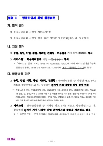 - 555 -%ubcc4%ucca8 3%ubc29%ubb38%ucde8%uc5c5%uc81c %ucde8%uc5c5 %ud65c%ub3d9%ubc94%uc704%uac00. %ubc95%uc801 %uadfc%uac70%u274d %ucd9c%uc785%uad6d%uad00%ub9ac%ubc95 %uc2dc%ud589%ub839 %uc81c23%uc870%uc81c1%ud56d%u274d %ucd9c%uc785%uad6d%uad00%ub9ac%ubc95 %uc2dc%ud589%ub839 %ubcc4%ud45c 1%uc7582%uc81c29%ud638 %ubc29%ubb38%ucde8%uc5c5(H-2)%ub098.%ud65c%ub3d9%ubc94%uc704%ub098. %uc9c0%uc815 %ubc29%uc2dd%u274d %ub18d%uc5c5,%uc784%uc5c5,%uc5b4%uc5c5,%uad11%uc5c5,%uc81c%uc870%uc5c5,%uac74%uc124%uc5c5:%ud5c8%uc6a9%uc5c5%uc885 %uc9c0%uc815%u00b7%ub098%uc5f4(%ud3ec%uc9c0%ud2f0%ube0c)%ubc29%uc2dd%u274d%uc11c%ube44%uc2a4%uc5c5*:%ud5c8%uc6a9%uc81c%uc678%uc5c5%uc885 %uc9c0%uc815%u00b7%ub098%uc5f4(%ub124%uac70%ud2f0%ube0c)%ubc29%uc2dd*%u300c%uc11c%ube44%uc2a4%uc5c5%ubd84%ub958%uace0%uc2dc%u300d(%ud1b5%uacc4%uccad%uace0%uc2dc%uc81c2018-390%ud638,%u201918.9.21.)%uc5d0%ub530%ub77c%uc11c%ube44%uc2a4%uc5c5%uc774%ub780%u300c%ud55c%uad6d%ud45c%uc900%uc0b0%uc5c5%ubd84%ub958%u300d(%ud1b5%uacc4%uccad%uace0%uc2dc%uc81c2017-13%ud638,%u201917.7.1.)%uc5d0%uc11c16%uac1c%ub300%ubd84%ub958(E,G%u301cU)%ub97c%ub9d0%ud568%ub2e4. %ud65c%ub3d9%ubc94%uc704 %uae30%uc900%u274d %ub18d%uc5c5,%uc784%uc5c5,%uc5b4%uc5c5,%uad11%uc5c5,%uc81c%uc870%uc5c5,%uac74%uc124%uc5c5:%ud55c%uad6d%uc0b0%uc5c5%ubd84%ub958 %uc911 %uc2dc%ud589%ub839 %ubcc4%ud45c 1%uc758%uc81c29%ud638 %ubc29%ubb38%ucde8%uc5c5(H-2)%ub098.%ud65c%ub3d9%ubc94%uc704 2)%uc5d0%uc11c %uc9c0%uc815%u00b7%ub098%uc5f4%ud55c %uc0b0%uc5c5 %ubd84%uc57c %ud5c8%uc6a9%u261e %ub18d%uc5c5(%uc18c%ubd84%ub958 3%uac1c), %uc784%uc5c5(%uc138%uc138%ubd84%ub958 4%uac1c), %uc5b4%uc5c5(%uc138%ubd84%ub958 1%uac1c, %uc138%uc138%ubd84%ub958 1%uac1c), %uad11%uc5c5(%uc911%ubd84%ub958 3%uac1c), %uc81c%uc870%uc5c5(%u5168 %uc5c5%uc885, %ub2e8, %uc0c1%uc2dc%uadfc%ub85c%uc790 %uc218 300%uba85 %ubbf8%ub9cc %ub610%ub294 %uc790%ubcf8%uae08 80%uc5b5%uc6d0 %uc774%ud558%uc5c5%uccb4%ub098 %ubcf8%uc810 %ub610%ub294 %uc8fc%uc0ac%ubb34%uc18c%uac00 %uc218%ub3c4%uad8c %uc678%uc758 %uc9c0%uc5ed%uc5d0%uc18c%uc7ac%ud558%ub294 %ubfcc%ub9ac%uc0ac%uc5c5 %uc911%uacac%uae30%uc5c5%uc5d0 %ucde8%uc5c5%ud558%ub294 %uacbd%uc6b0%ub85c %ud55c%uc815), %uac74%uc124%uc5c5(%u5168 %uc5c5%uc885, %ub2e8, %ubc1c%uc804%uc18c%u00b7%uc81c%ucca0%uc18c%u00b7%uc11d%uc720%ud654%ud559 %uac74%uc124%ud604%uc7a5 %uc5c5%uccb4 %uc911 %uc0b0%uc5c5%u00b7%ud658%uacbd%uc124%ube44 %uacf5%uc0ac%uc5c5%uccb4%uc5d0 %ucde8%uc5c5%ud558%ub294 %uacbd%uc6b0%ub294 %uc81c%uc678)%u274d %uc11c%ube44%uc2a4%uc5c5:%ud55c%uad6d%uc0b0%uc5c5%ubd84%ub958 %uc911 %uc2dc%ud589%ub839 %ubcc4%ud45c 1%uc7582%uc81c29%ud638 %ubc29%ubb38%ucde8%uc5c5(H-2)%ub098.%ud65c%ub3d9%ubc94%uc704 3)%uc5d0%uc11c %uc9c0%uc815%u00b7%ub098%uc5f4%ud55c %uc0b0%uc5c5 %ubd84%uc57c%uc5d0%uc11c%uc758 %ud65c%ub3d9%uc744 %uc81c%uc678%ud558%uace0 %ud5c8%uc6a9%u203b%ub2e8,%uc911%ubd84%ub958%ub610%ub294%uc18c%ubd84%ub958%ub2e8%uc704%uc5d0%uc11c%uc81c%uc678%uc5c5%uc885%uc5d0%uc18d%ud558%ub354%ub77c%ub3c4%uc608%uc678%ub85c%ud5c8%uc6a9%ud558%ub294%uacbd%uc6b0%uc788%uc74c%uf000%ubaa9%ucc28
