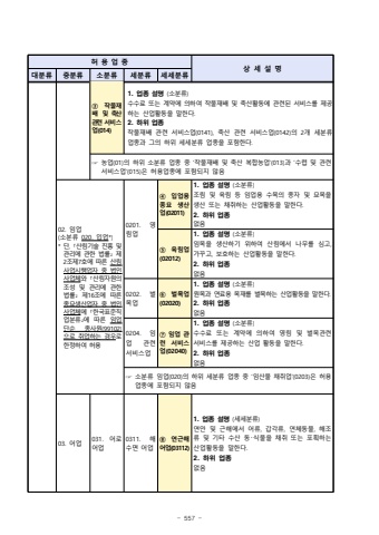 - 557 -%ud5c8 %uc6a9 %uc5c5 %uc885%uc0c1 %uc138 %uc124 %uba85%ub300%ubd84%ub958%uc911%ubd84%ub958%uc18c%ubd84%ub958%uc138%ubd84%ub958%uc138%uc138%ubd84%ub958%u2462 %uc791%ubb3c%uc7ac%ubc30 %ubc0f %ucd95%uc0b0%uad00%ub828%uc11c%ube44%uc2a4%uc5c5(014)1. %uc5c5%uc885 %uc124%uba85 (%uc18c%ubd84%ub958)%uc218%uc218%ub8cc %ub610%ub294 %uacc4%uc57d%uc5d0 %uc758%ud558%uc5ec %uc791%ubb3c%uc7ac%ubc30 %ubc0f %ucd95%uc0b0%ud65c%ub3d9%uc5d0 %uad00%ub828%ub41c %uc11c%ube44%uc2a4%ub97c %uc81c%uacf5%ud558%ub294 %uc0b0%uc5c5%ud65c%ub3d9%uc744 %ub9d0%ud55c%ub2e4.2. %ud558%uc704 %uc5c5%uc885%uc791%ubb3c%uc7ac%ubc30 %uad00%ub828 %uc11c%ube44%uc2a4%uc5c5(0141), %ucd95%uc0b0 %uad00%ub828 %uc11c%ube44%uc2a4%uc5c5(0142)%uc758 2%uac1c %uc138%ubd84%ub958 %uc5c5%uc885%uacfc %uadf8%uc758 %ud558%uc704 %uc138%uc138%ubd84%ub958 %uc5c5%uc885%uc744 %ud3ec%ud568%ud55c%ub2e4. %u261e %ub18d%uc5c5(01)%uc758 %ud558%uc704 %uc18c%ubd84%ub958 %uc5c5%uc885 %uc911 %u2018%uc791%ubb3c%uc7ac%ubc30 %ubc0f %ucd95%uc0b0 %ubcf5%ud569%ub18d%uc5c5%u2019(013)%uacfc %u2018%uc218%ub835 %ubc0f %uad00%ub828%uc11c%ube44%uc2a4%uc5c5%u2019(015)%uc740 %ud5c8%uc6a9%uc5c5%uc885%uc5d0 %ud3ec%ud568%ub418%uc9c0 %uc54a%uc74c02. %uc784%uc5c5(%uc18c%ubd84%ub958 020. %uc785%uc5c5*)* %ub2e8, %uff62%uc0b0%ub9bc%uae30%uc220 %uc9c4%ud765 %ubc0f %uad00%ub9ac%uc5d0 %uad00%ud55c %ubc95%ub960%uff63 %uc81c2%uc870%uc81c7%ud638%uc5d0 %ub530%ub978 %uc0b0%ub9bc%uc0ac%uc5c5%uc2dc%ud589%uc5c5%uc790 %uc911 %ubc95%uc778%uc0ac%uc5c5%uccb4%uc640 %uff62%uc0b0%ub9bc%uc790%uc6d0%uc758 %uc870%uc131 %ubc0f %uad00%ub9ac%uc5d0 %uad00%ud55c %ubc95%ub960%uff63 %uc81c16%uc870%uc5d0 %ub530%ub978 %uc885%ubb18%uc0dd%uc0b0%uc5c5%uc790 %uc911 %ubc95%uc778%uc0ac%uc5c5%uccb4%uc5d0 %uff62%ud55c%uad6d%ud45c%uc900%uc9c1%uc5c5%ubd84%ub958%uff63%uc5d0 %ub530%ub978 %uc784%uc5c5 %ub2e8%uc21c %uc885%uc0ac%uc6d0(99102)%uc73c%ub85c %ucde8%uc5c5%ud558%ub294 %uacbd%uc6b0%ub85c %ud55c%uc815%ud558%uc5ec %ud5c8%uc6a90201. %uc601%ub9bc%uc5c5%u2463 %uc785%uc5c5%uc6a9 %uc885%ubb18 %uc0dd%uc0b0%uc5c5(02011)1. %uc5c5%uc885 %uc124%uba85 (%uc18c%ubd84%ub958)%uc870%ub9bc %ubc0f %uc721%ub9bc %ub4f1 %uc784%uc5c5%uc6a9 %uc218%ubaa9%uc758 %uc885%uc790 %ubc0f %ubb18%ubaa9%uc744 %uc0dd%uc0b0 %ub610%ub294 %ucc44%ucde8%ud558%ub294 %uc0b0%uc5c5%ud65c%ub3d9%uc744 %ub9d0%ud55c%ub2e4.2. %ud558%uc704 %uc5c5%uc885%uc5c6%uc74c%u2464 %uc721%ub9bc%uc5c5(02012)1. %uc5c5%uc885 %uc124%uba85 (%uc18c%ubd84%ub958)%uc784%ubaa9%uc744 %uc0dd%uc0b0%ud558%uae30 %uc704%ud558%uc5ec %uc0b0%ub9bc%uc5d0%uc11c %ub098%ubb34%ub97c %uc2ec%uace0, %uac00%uafb8%uace0, %ubcf4%ud638%ud558%ub294 %uc0b0%uc5c5%ud65c%ub3d9%uc744 %ub9d0%ud55c%ub2e4.2. %ud558%uc704 %uc5c5%uc885%uc5c6%uc74c0202. %ubc8c%ubaa9%uc5c5%u2465 %ubc8c%ubaa9%uc5c5(02020)1. %uc5c5%uc885 %uc124%uba85 (%uc18c%ubd84%ub958)%uc6d0%ubaa9%uacfc %uc5f0%ub8cc%uc6a9 %ubaa9%uc7ac%ub97c %ubc8c%ubaa9%ud558%ub294 %uc0b0%uc5c5%ud65c%ub3d9%uc744 %ub9d0%ud55c%ub2e4.2. %ud558%uc704 %uc5c5%uc885%uc5c6%uc74c0204. %uc784%uc5c5 %uad00%ub828 %uc11c%ube44%uc2a4%uc5c5%u2466 %uc784%uc5c5 %uad00%ub828 %uc11c%ube44%uc2a4%uc5c5(02040)1. %uc5c5%uc885 %uc124%uba85 (%uc18c%ubd84%ub958)%uc218%uc218%ub8cc %ub610%ub294 %uacc4%uc57d%uc5d0 %uc758%ud558%uc5ec %uc601%ub9bc %ubc0f %ubc8c%ubaa9%uad00%ub828 %uc11c%ube44%uc2a4%ub97c %uc81c%uacf5%ud558%ub294 %uc0b0%uc5c5 %ud65c%ub3d9%uc744 %ub9d0%ud55c%ub2e4.2. %ud558%uc704 %uc5c5%uc885%uc5c6%uc74c%u261e %uc18c%ubd84%ub958 %uc784%uc5c5(020)%uc758 %ud558%uc704 %uc138%ubd84%ub958 %uc5c5%uc885 %uc911 %u2018%uc784%uc0b0%ubb3c %ucc44%ucde8%uc5c5%u2019(0203)%uc740 %ud5c8%uc6a9%uc5c5%uc885%uc5d0 %ud3ec%ud568%ub418%uc9c0 %uc54a%uc74c03. %uc5b4%uc5c5031. %uc5b4%ub85c %uc5b4%uc5c50311. %ud574%uc218%uba74 %uc5b4%uc5c5%u2467 %uc5f0%uadfc%ud574 %uc5b4%uc5c5(03112)1. %uc5c5%uc885 %uc124%uba85 (%uc138%uc138%ubd84%ub958)%uc5f0%uc548 %ubc0f %uadfc%ud574%uc5d0%uc11c %uc5b4%ub958, %uac11%uac01%ub958, %uc5f0%uccb4%ub3d9%ubb3c, %ud574%uc870%ub958 %ubc0f %uae30%ud0c0 %uc218%uc0b0 %ub3d9%uff65%uc2dd%ubb3c%uc744 %ucc44%ucde8 %ub610%ub294 %ud3ec%ud68d%ud558%ub294 %uc0b0%uc5c5%ud65c%ub3d9%uc744 %ub9d0%ud55c%ub2e4.2. %ud558%uc704 %uc5c5%uc885%uc5c6%uc74c