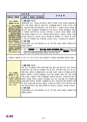 - 559 -%ud5c8 %uc6a9 %uc5c5 %uc885%uc0c1 %uc138 %uc124 %uba85%ub300%ubd84%ub958%uc911%ubd84%ub958%uc18c%ubd84%ub958%uc138%ubd84%ub958%uc138%uc138%ubd84%ub958%u246c C. %uc81c%uc870%uc5c5(%uc911%ubd84%ub958 10~34)%u203b %ub2e8, %u25b3%uc0c1%uc2dc %uc0ac%uc6a9%ud558%ub294 %uadfc%ub85c%uc790 %uc218%uac00 300%uba85 %ubbf8%ub9cc%uc774%uac70%ub098 %uc790%ubcf8%uae08%uc77480%uc5b5 %uc6d0 %uc774%ud558%uc778 %uc5c5%uccb4, %u25b3 %uff62%ubfcc%ub9ac%uc0b0%uc5c5 %uc9c4%ud765%uacfc %ucca8%ub2e8%ud654%uc5d0 %uad00%ud55c %ubc95%ub960%uff63%uc81c2%uc870%uc81c3%ud638 %ub098%ubaa9%uc5d0 %ub530%ub978 %uc911%uacac%uae30%uc5c5(%ubcf8%uc810 %ub610%ub294 %uc8fc%uc0ac%ubb34%uc18c%uac00%uff62%uc218%ub3c4%uad8c %uc815%ube44%uacc4%ud68d%uff63 %uc81c2%uc870 %uc81c1%ud638%uc5d0 %ub530%ub978 %uc218%ub3c4%uad8c %uc678%uc758 %uc9c0%uc5ed%uc5d0%uc18c%uc7ac%ud558%ub294 %uacbd%uc6b0%uc5d0%ub9cc %ud574%ub2f9)%uc5d0 %ucde8%uc5c5%ud558%ub294 %uacbd%uc6b0%ub85c%ud55c%uc815%ud558%uc5ec %ud5c8%uc6a91. %uc5c5%uc885 %uc124%uba85 (%ub300%ubd84%ub958)%uc6d0%uc7ac%ub8cc(%ubb3c%uc9c8 %ub610%ub294 %uad6c%uc131%uc694%uc18c)%uc5d0 %ubb3c%ub9ac%uc801, %ud654%ud559%uc801 %uc791%uc6a9%uc744 %uac00%ud558%uc5ec %ud22c%uc785%ub41c %uc6d0%uc7ac%ub8cc%ub97c %uc131%uc9c8%uc774 %ub2e4%ub978 %uc0c8%ub85c%uc6b4 %uc81c%ud488%uc73c%ub85c %uc804%ud658%uc2dc%ud0a4%ub294 %uc0b0%uc5c5%ud65c%ub3d9%uc744 %ub9d0%ud55c%ub2e4. %ub530%ub77c%uc11c %ub2e8%uc21c%ud788 %uc0c1%ud488%uc744 %uc120%ubcc4%uc815%ub9ac%ubd84%ud560%u2024%ud3ec%uc7a5%u2024%uc7ac%ud3ec%uc7a5%ud558%ub294 %uacbd%uc6b0 %ub4f1%uacfc %uac19%uc774 %uadf8 %uc0c1%ud488%uc758 %ubcf8%uc9c8%uc801 %uc131%uc9c8%uc744 %ubcc0%ud654%uc2dc%ud0a4%uc9c0 %uc54a%ub294 %ucc98%ub9ac%ud65c%ub3d9%uc740 %uc81c%uc870%ud65c%ub3d9%uc73c%ub85c %ubcf4%uc9c0 %uc54a%ub294%ub2e4. %uc774%ub7ec%ud55c %uc81c%uc870%ud65c%ub3d9%uc740 %uacf5%uc7a5%uc774%ub098 %uac00%ub0b4%uc5d0%uc11c %ub3d9%ub825%uae30%uacc4 %ubc0f %uc218%uacf5%uc73c%ub85c %uc774%ub8e8%uc5b4%uc9c8 %uc218 %uc788%uc73c%uba70, %uc0dd%uc0b0%ub41c %uc81c%ud488%uc740 %ub3c4%ub9e4%ub098 %uc18c%ub9e4 %ud615%ud0dc%ub85c %ud310%ub9e4%ub420 %uc218%ub3c4 %uc788%ub2e4. %uc790%ubcf8%uc7ac(%uace0%uc815%uc790%ubcf8 %ud615%uc131)%ub85c %uc0ac%uc6a9%ub418%ub294 %uc0b0%uc5c5%uc6a9 %uae30%uacc4%uc640 %uc7a5%ube44%ub97c %uc804%ubb38%uc801%uc73c%ub85c %uc218%ub9ac%ud558%ub294 %uacbd%uc6b0%ub3c4 %uc81c%uc870%uc5c5%uc73c%ub85c %ubd84%ub958%ud55c%ub2e4. %ub2e8, %ucef4%ud4e8%ud130 %ubc0f %uc8fc%ubcc0%uae30%uae30, %uac1c%uc778 %ubc0f %uac00%uc815%uc6a9%ud488 %ub4f1%uacfc %uc790%ub3d9%ucc28%ub97c %uc218%ub9ac%ud558%ub294 %uacbd%uc6b0%ub294 %uc218%ub9ac%uc5c5(95)%uc73c%ub85c %ubd84%ub958%ud55c%ub2e4.2. %ud558%uc704 %uc5c5%uc885%uc81c%uc870%uc5c5(%ub300%ubd84%ub958 C)%uc758 %ud558%uc704 %uc911%ubd84%ub958(10~34) %ubc0f %uadf8%uc758 %ud558%uc704 %uc18c%ubd84%ub958, %uc138%ubd84%ub958, %uc138%uc138%ubd84%ub958 %ubaa8%ub4e0 %uc5c5%uc885%uc744 %ud3ec%ud568%ud55c%ub2e4.%u203b%ud5a5%ud6c4%uff62%u2460%ubfcc%ub9ac%uc5c5%uc885%uc774%uba74%uc11c,%u2461%ubcf8%uc0ac%ub610%ub294%uc9c0%uc0ac%uac00%ube44%uc218%ub3c4%uad8c%uc5d0%uc18c%uc7ac(%ubcf8%uc0ac%uac00%uc218%ub3c4%uad8c%uc5d0%uc18c%uc7ac%ud558%ub294%uacbd%uc6b0%ub3c4%uc9c0%uc0ac%uac00%ube44%uc218%ub3c4%uad8c%uc5d0%uc18c%uc7ac%ud560%uacbd%uc6b0%uc9c0%uc0ac%ub294%uc2e0%uccad%uac00%ub2a5)%ud55c%u2462%uc911%uacac%uae30%uc5c5%uff63%uc5d0%ucde8%uc5c5%ud558%ub294%uacbd%uc6b0%ub3c4%ud5c8%uc6a9%uc608%uc815(%uff62%ucd9c%uc785%uad6d%uad00%ub9ac%ubc95%uc2dc%ud589%ub839%uff63%uac1c%uc815%uc774%ud6c4%uc2dc%ud589)%u261e %ub300%ubd84%ub958 D (%uc911%ubd84%ub958 35. %uc804%uae30, %uac00%uc2a4, %uc99d%uae30 %ubc0f %uacf5%uae30 %uc870%uc808 %uacf5%uae09%uc5c5)%uc758 %uc804 %uc5c5%uc885%uc740 %ud5c8%uc6a9%uc5c5%uc885%uc5d0 %ud3ec%ud568%ub418%uc9c0 %uc54a%uc74c%u246d F. %uac74%uc124%uc5c5(%uc911%ubd84%ub958 41~42)%u203b %ub2e8, %ubc1c%uc804%uc18c%uff65%uc81c%ucca0%uc18c%uff65%uc11d%uc720%ud654%ud559 %uac74%uc124%ud604%uc7a5%uc758%uac74%uc124%uc5c5%uccb4 %uc911 %uc5c5%uc885%uc774%uc0b0%uc5c5%u00b7%ud658%uacbd%uc124%ube44%uc778 %uacbd%uc6b0%ub294 %uc81c%uc6781. %uc5c5%uc885 %uc124%uba85 (%ub300%ubd84%ub958)%uacc4%uc57d %ub610%ub294 %uc790%uae30%uacc4%uc815%uc5d0 %uc758%ud558%uc5ec %uc9c0%ubc18%uc870%uc131%uc744 %uc704%ud55c %ubc1c%ud30c%uff65%uc2dc%uad74%uff65%uad74%ucc29%uff65%uc815%uc9c0 %ub4f1%uc758 %uc9c0%ubc18%uacf5%uc0ac, %uac74%uc124%uc6a9%uc9c0%uc5d0 %uac01%uc885 %uac74%ubb3c %ubc0f %uad6c%ucd95%ubb3c%uc744 %uc2e0%ucd95 %ubc0f %uc124%uce58, %uc99d%ucd95%uff65%uc7ac%ucd95%uff65%uac1c%ucd95%uff65%uc218%ub9ac %ubc0f %ubcf4%uc218%uff65%ud574%uccb4 %ub4f1%uc744 %uc218%ud589%ud558%ub294 %uc0b0%uc5c5%ud65c%ub3d9%uc73c%ub85c%uc11c %uc784%uc2dc%uac74%ubb3c, %uc870%ub9bd%uc2dd %uac74%ubb3c %ubc0f %uad6c%ucd95%ubb3c%uc744 %uc124%uce58%ud558%ub294%ud65c%ub3d9%ub3c4 %ud3ec%ud568%ud55c%ub2e4. %uc774%ub7ec%ud55c %uac74%uc124%ud65c%ub3d9%uc740 %ub3c4%uae09%uc790%uc601 %uac74%uc124%uc5c5%uc790, %uc885%ud569 %ub610%ub294 %uc804%ubb38 %uac74%uc124%uc5c5%uc790%uc5d0 %uc758%ud558%uc5ec %uc218%ud589%ub41c%ub2e4. %uc9c1%uc811 %uac74%uc124%ud65c%ub3d9%uc744 %uc218%ud589%ud558%uc9c0 %uc54a%ub354%ub77c%ub3c4 %uac74%uc124%uacf5%uc0ac%uc5d0 %ub300%ud55c %ucd1d%uad04%uc801%uc778 %ucc45%uc784%uc744 %uc9c0%uba74%uc11c %uac74%uc124%uacf5%uc0ac %ubd84%uc57c%ubcc4%ub85c %ub3c4%uae09 %ub610%ub294 %ud558%ub3c4%uae09%uc744 %uc8fc%uc5b4 %uc804%uccb4%uc801%uc73c%ub85c %uac74%uc124%uacf5%uc0ac%ub97c %uad00%ub9ac%ud558%ub294 %uacbd%uc6b0%uc5d0%ub3c4 %uac74%uc124%ud65c%ub3d9%uc73c%ub85c %ubcf8%ub2e4. %uac74%uc124%uacf5%uc0ac%uc5d0 %ub300%ud55c %ucd1d%uad04%uc801%uc778 %ucc45%uc784 %ubc0f %uc804%uccb4 %uac74%uc124%uacf5%uc0ac%ub97c %uad00%ub9ac%ud558%ub294 %ud65c%ub3d9%uc740 %uac74%uc124%uacf5%uc0ac%uc640 %uad00%ub828%ud55c %uc778%ub825%uff65%uc790%uc7ac%uff65%uc7a5%ube44%uff65%uc790%uae08%uff65%uc2dc%uacf5%uff65%ud488%uc9c8%uff65%uc548%uc804%uad00%ub9ac %ubd80%ubb38 %ub4f1%uc744 %uc804%uccb4%uc801%uc73c%ub85c %ucc45%uc784%uc9c0%uace0 %uad00%ub9ac%ud558%ub294 %uacbd%uc6b0%ub97c %ub098%ud0c0%ub0b8%ub2e4.2. %ud