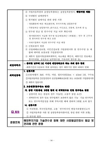 - 56 -%u2462 %uc0ac%uc5c5%uc790%ub4f1%ub85d%uc99d%uacfc %uacf5%uc7a5%ub4f1%ub85d%uc99d(%ub610%ub294 %uacf5%uc7a5%ub4f1%ub85d%uc99d%uba85%uc11c, %ud574%ub2f9%uc790%ub9cc %uc81c%ucd9c)%u2463 %uad6d%ub0b4%ubc95%uc778 %ub0a9%uc138%uc99d%uba85%uc11c%u2464%ud604%uc9c0%ubc95%uc778 %ub0a9%uc138%uc0ac%uc2e4 %uad00%ub828 %uc99d%uba85 %uc11c%ub958-%uc601%uc5c5%ud65c%ub3d9%uc5d0 %ub530%ub978 %uc138%uae08(%ubc95%uc778%uc138,%ubd80%uac00%uac00%uce58%uc138)%ub0a9%uc785%uc601%uc218%uc99d-%uac01%uc885%uacf5%uacfc%uae08 %ub0a9%uc785%uc601%uc218%uc99d (%uc804%uae30%uc694%uae08,%uc218%ub3c4%uc694%uae08,%uac74%ubb3c%uc138,%ud1a0%uc9c0%uc138 %uc911 1)%u2465%uc5f0%uc218%uc0dd %uc784%uae08 %ubc0f %uc5f0%uc218%uc218%ub2f9 %uc9c0%uae09 %uc5ec%ubd80 %ud655%uc778%uc11c%ub958-%ud604%uc9c0%ubc95%uc778%uc5d0%uc11c %uc9c0%uae09%ud55c %uc5f0%uc218%uc0dd %uc784%uae08%ub300%uc7a5(%ucd5c%uadfc 1%uac1c%uc6d4%ubd84):%uc5f0%uc218 %ud6c4 %uadfc%ubb34%uc790 %ubc0f %ud55c%uad6d%ud30c%uacac %uc5f0%uc218%uc0dd %uccb4%ud06c %uc694%ub9dd-%uad6d%ub0b4%uae30%uc5c5%uc5d0%uc11c %uc9c0%uae09%ud55c %uc5f0%uc218%uc218%ub2f9 %uc9c0%uae09 %ub300%uc7a5 %u2466%uc2e0%uc6d0%ubcf4%uc99d%uc11c %uc6d0%ubcf8%u2467%uc0b0%uc5c5%uc7ac%ud574%ubcf4%uc0c1%ubcf4%ud5d8,%uad6d%ubbfc%uac74%uac15%ubcf4%ud5d8 %uac00%uc785%uc99d%uba85%uc11c%ub958 %ubc0f %uc5f0%uc218%uc218%ub2f9 %ub4f1 %uccb4%ubd88%uc5d0 %ub300%ube44%ud55c %ubcf4%uc99d%ubcf4%ud5d8 %uac00%uc785%uc99d%uba85%uc11c%ub958%u2468%uccb4%ub958%uc9c0 %uc785%uc99d%uc11c%ub958(%uc784%ub300%ucc28%uacc4%uc57d%uc11c,%uc219%uc18c%uc81c%uacf5 %ud655%uc778%uc11c,%uccb4%ub958%uae30%uac04 %ub9cc%ub8cc%uc608%uace0 %ud1b5%uc9c0%uc6b0%ud3b8%ubb3c,%uacf5%uacf5%uc694%uae08 %ub0a9%ubd80%uc601%uc218%uc99d,%uae30%uc219%uc0ac%ube44 %uc601%uc218%uc99d %ub4f1)%uc7ac%uc785%uad6d%ud5c8%uac00%ucd9c%uad6d%ud55c %ub0a0%ubd80%ud130 1%ub144 %uc774%ub0b4%uc5d0 %uc7ac%uc785%uad6d%ud558%uace0%uc790 %ud558%ub294 %uc790%uc758%uacbd%uc6b0 %uba74%uc81c -%uccb4%ub958%uae30%uac04%uc774 1%ub144%ubcf4%ub2e4 %uc801%uac8c %ub0a8%uc544%uc788%ub294 %uacbd%uc6b0 %uccb4%ub958%uae30%uac04 %ubc94%uc704 %ub0b4%uc5d0%uc11c %uba74%uc81c%uc678%uad6d%uc778%ub4f1%ub85d%uf000%ubaa9%ucc281. %uc2e0%uccad%uc11c%ub958%u2460%uc2e0%uccad%uc11c(%ubcc4%uc9c0 34%ud638 %uc11c%uc2dd), %uc5ec%uad8c, %uceec%ub7ec%uc0ac%uc9c4(3.5cm %u00d7 4.5cm)1%uc7a5, %uc218%uc218%ub8cc%u2461%uc0ac%uc5c5%uc790%ub4f1%ub85d%uc99d %u2462%uac74%uac15%uc9c4%ub2e8%uc11c %u2463%uc0b0%uc5c5%uc7ac%ud574%ubcf4%uc0c1%ubcf4%ud5d8 %ub610%ub294 %ubcf4%uc99d%ubcf4%ud5d8 %uac00%uc785%uc99d%uba85%uc11c%ub958%u2464 %uccb4%ub958%uc9c0 %uc785%uc99d%uc11c%ub9582. %uace0%uc6a9%ubcc0%ub3d9(%uc5f0%uc218%uc7a5%uc18c %ubcc0%uacbd) %uac00. %uacf5%uc7a5 %uc774%uc804%u2024%uc99d%uc124, 3%uac1c%uc6d4 %ubc94%uc704 %ub0b4%uc704%ud0c1%uc5f0%uc218%ub85c %uc778%ud55c %uc5f0%uc218%uc7a5%uc18c %ubcc0%uacbd- %uacf5%uc7a5%uc774%uc804 %ub610%ub294 %uc99d%uc124%uc758 %uacbd%uc6b0 %uac00%ub2a5(%ub2e8, %uace0%uc6a9%uc8fc %ub3d9%uc77c %uc694%uac74)- %uc704%ud0c1%uc5f0%uc218%uc758 %uacbd%uc6b0 %ub2f9%ucd08 %uc5f0%uc218%uc5c5%uccb4%uac00 %ubcf4%uc720%ud558%uc9c0 %uc54a%uc740 %uae30%ub2a5%u02d9%uae30%uc220 %uc5f0%uc218%ubaa9%uc801%ub610%ub294 %uc5f0%uc218%ubaa9%uc801%ub2ec%uc131%uc744 %uc704%ud574 %ubd80%ub4dd%uc774%ud55c %ub54c%uc5d0 %ud55c%ud558%uba70 3%uac1c%uc6d4 %ucd08%uacfc %ubd88%uac00%ub098. %uc2e0%uccad%uc11c%ub958%u2460 %uc5ec%uad8c%uc6d0%ubcf8, %uc678%uad6d%uc778%ub4f1%ub85d%uc99d, %uace0%uc6a9%u02d9%uc5f0%uc218%uc678%uad6d%uc778 %ubcc0%ub3d9%uc0ac%uc720%ubc1c%uc0dd%uc2e0%uace0%uc11c%u2461 %uc0ac%uc5c5%uc790%ub4f1%ub85d%uc99d %uc0ac%ubcf8 %ubc0f %uacf5%uc7a5%ub4f1%ub85d%uc99d%uc0ac%ubcf8(%uc774%uc804,%uc99d%uc124 %uad00%ub828 %uc11c%ub958 %ud3ec%ud568)%u2462%uc5f0%uc218%uc0dd %uba85%ubd80 %ud6c8%ub839%uc5f0%uacc4%ud574%uc678%ud22c%uc790%uae30%uc5c5 %uae30%uc220%uc5f0%uc218%uc0dd %ub4f1%uc5d0 %ub300%ud55c %uc0ac%uc99d%ubc1c%uae09%uc778%uc815%uc11c %ubc1c%uae09 %ubc0f %uad00%ub9ac%uc5d0 %uad00%ud55c %ud6c8%ub839