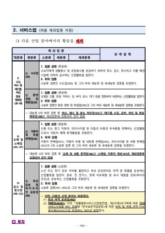 - 560 -2. %uc11c%ube44%uc2a4%uc5c5 (%ud5c8%uc6a9 %uc81c%uc678%uc5c5%uc885 %uc9c0%uc815)%u274d %ub2e4%uc74c %uc0b0%uc5c5 %ubd84%uc57c%uc5d0%uc11c%uc758 %ud65c%ub3d9%uc744 %uc81c%uc678%uc81c %uc678 %uc5c5 %uc885%uc0c1 %uc138 %uc124 %uba85%ub300%ubd84%ub958%uc911%ubd84%ub958%uc18c%ubd84%ub958%uc138%ubd84%ub958%uc138%uc138%ubd84%ub958E.%uc218%ub3c4, %ud558%uc218 %ubc0f %ud3d0%uae30%ubb3c %ucc98%ub9ac, %uc6d0%ub8cc %uc7ac%uc0dd%uc5c5(36~39)%u2460 %uc218%ub3c4%uc5c5(36)1. %uc5c5%uc885 %uc124%uba85 (%uc911%ubd84%ub958)%uc218%uc694%uc790%uc5d0%uac8c %uc0dd%ud65c%uc6a9%uc218 %ubc0f %uacf5%uc5c5%uc6a9%uc218%ub97c %uacf5%uae09%ud558%uae30 %uc704%ud558%uc5ec %ucde8%uc218, %uc9d1%uc218, %uc815%uc218%ud558%uace0 %uc774%ub97c %ubc30%uad00%uc2dc%uc124%uc5d0 %uc758%ud558%uc5ec %uae09%uc218%ud558%ub294 %uc0b0%uc5c5%ud65c%ub3d9%uc744 %ub9d0%ud55c%ub2e4.2. %ud558%uc704 %uc5c5%uc885%uc18c%ubd84%ub958 %uc5c5%uc885%uc778 %uc218%ub3c4%uc5c5(360) %ubc0f %uadf8%uc758 %ud558%uc704 %uc138%ubd84%ub958 %ubc0f %uc138%uc138%ubd84%ub958 %uc5c5%uc885%uc744 %ud3ec%ud568%ud55c%ub2e4.%u2461 %ud658%uacbd %uc815%ud654 %ubc0f %ubcf5%uc6d0%uc5c5(39)1. %uc5c5%uc885 %uc124%uba85 (%uc911%ubd84%ub958)%uc624%uc5fc%ub41c %uac74%ubb3c, %ud1a0%uc591, %uc9c0%ud558%uc218, %uac15, %ubc14%ub2e4, %ud638%uc218, %ub300%uae30 %ub4f1%uc744 %uc815%ud654%ud558%uc5ec %ubcf5%uc6d0%ud558%ub294 %uc0b0%uc5c5%ud65c%ub3d9%uc744 %ub9d0%ud55c%ub2e4.2. %ud558%uc704 %uc5c5%uc885%uc18c%ubd84%ub958 %uc5c5%uc885%uc778 %ud658%uacbd %uc815%ud654 %ubc0f %ubcf5%uc6d0%uc5c5(390)%uacfc %uadf8%uc758 %ud558%uc704 %uc138%ubd84%ub958 %ubc0f %uc138%uc138%ubd84%ub958 %uc5c5%uc885%uc744 %ud3ec%ud568%ud55c%ub2e4.%u261e %ub300%ubd84%ub958 E%uc758 %ud558%uc704 %uc5c5%uc885 %uc911 %u2018%ud558%uc218, %ud3d0%uc218 %ubc0f %ubd84%ub274 %ucc98%ub9ac%uc5c5%u2019(37)%uacfc %u2018%ud3d0%uae30%ubb3c %uc218%uc9d1, %uc6b4%ubc18, %ucc98%ub9ac %ubc0f %uc6d0%ub8cc %uc7ac%uc0dd%uc5c5%u2019(38)%uc740 %uc81c%uc678%uc5c5%uc885%uc5d0 %ud3ec%ud568%ub418%uc5b4 %uc788%uc9c0 %uc54a%uc74cG.%ub3c4%ub9e4 %ubc0f %uc18c%ub9e4%uc5c5(45~47)%u2462 %uc790%ub3d9%ucc28%ubc0f %ubd80%ud488 %ud310%ub9e4%uc5c5(45)1. %uc5c5%uc885 %uc124%uba85 (%uc911%ubd84%ub958)%uc2e0%ud488 %ub610%ub294 %uc911%uace0 %uc790%ub3d9%ucc28, %ubaa8%ud130%uc0ac%uc774%ud074 %ubc0f %uc774%ub4e4%uc758 %ubd80%ud488%uacfc %ubd80%uc18d%ud488%uc744 %ud310%ub9e4%ud558%ub294 %uc0b0%uc5c5%ud65c%ub3d9%uc73c%ub85c%uc11c %uc790%ub3d9%ucc28 %ub9e4%ub9e4 %uc911%uac1c%ud65c%ub3d9%uc744 %ud3ec%ud568%ud55c%ub2e4.2. %ud558%uc704 %uc5c5%uc885%uc790%ub3d9%ucc28 %ud310%ub9e4%uc5c5(451), %uc790%ub3d9%ucc28 %ubd80%ud488 %ubc0f %ub0b4%uc7a5%ud488 %ud310%ub9e4%uc5c5(452), %ubaa8%ud130%uc0ac%uc774%ud074 %ubc0f %ubd80%ud488 %ud310%ub9e4%uc5c5(453)%uc758 3%uac1c %uc18c%ubd84%ub958 %uc5c5%uc885 %ubc0f %uadf8%uc758 %ud558%uc704%uc138%ubd84%ub958 %ubc0f %uc138%uc138%ubd84%ub958 %uc5c5%uc885%uc744 %ud3ec%ud568%ud55c%ub2e4.%u261e %ub300%ubd84%ub958 G%uc758 %ud558%uc704 %uc5c5%uc885 %uc911 %u2018%ub3c4%ub9e4 %ubc0f %uc0c1%ud488 %uc911%uac1c%uc5c5%u2019(46)%uacfc %u2018%uc18c%ub9e4%uc5c5; %uc790%ub3d9%ucc28 %uc81c%uc678%u2019(47)%uc740 %uc81c%uc678%uc5c5%uc885%uc5d0 %ud3ec%ud568%ub418%uc5b4 %uc788%uc9c0 %uc54a%uc74cH.%uc6b4%uc218 %ubc0f %ucc3d%uace0%uc5c5(49~52)%u2463 %uc721%uc0c1 %uc6b4%uc1a1 %ubc0f %ud30c %uc774 %ud504 %ub77c%uc778 %uc6b4%uc1a1%uc5c5(49)1. %uc5c5%uc885 %uc124%uba85 (%uc18c%ubd84%ub958)%ub178%uc120 %ub610%ub294 %uc815%uae30 %uc6b4%uc1a1 %uc5ec%ubd80%ub97c %ubd88%ubb38%ud558%uace0 %uc721%uc0c1 %uc6b4%uc1a1%uc7a5%ube44%ub85c %uc5ec%uac1d %ubc0f %ud654%ubb3c%uc744%uc6b4%uc1a1%ud558%ub294 %uc0b0%uc5c5%ud65c%ub3d9%uc744 %ub9d0%ud55c%ub2e4. %uc6d0%uc720, %ucc9c %uc5f0%uac00%uc2a4, %uc815%uc81c %uc11d%uc720%uc81c%ud488 %ubc0f %uc720%uc0ac %uc81c%ud488%uc744 %uad00%ub85c(%ud30c%uc774%ud504%ub77c%uc778)%ub85c %uc6b4%uc1a1%ud558%ub294 %uc0b0%uc5c5%ud65c%ub3d9%uc744 %ud3ec%ud568%ud55c%ub2e4.2. %ud558%uc704 %uc5c5%uc885%uc18c%ubd84%ub958 %uc5c5%uc885(491~495)%uacfc %uadf8%uc758 %ud558%uc704 %uc138%ubd84%ub958 %ubc0f %uc138%uc138%ubd84%ub958 %uc5c5%uc885%uc744 %ud3ec%ud568%ud55c%ub2e4. %u261e %ub2e4%ub9cc, %ub2e4%uc74c%uc758 %uc0b0%uc5c5 %ubd84%uc57c%ub294 %ud5c8%uc6a9%ud55c%ub2e4.(1) %uc721%uc0c1 %uc5ec%uac1d %uc6b4%uc1a1%uc5c5(492)(2) %ud0dd%ubc30%uc5c5(49401). %ub2e4%ub9cc, %u300c%uc0dd%ud65c%ubb3c%ub958%uc11c%ube44%uc2a4%uc0b0%uc5c5%ubc1c%uc804%ubc95%u300d %uc81c2%uc870%uc81c3%ud638%uac00%ubaa9%uc5d0 %ub530%ub978 %ud0dd%ubc30%uc11c%ube44%uc2a4%uc0ac%uc5c5%uc744 %ud558%ub294 %uc5c5%uccb4%uc5d0 %uff62%ud55c%uad6d%ud45c%uc900%uc9c1%uc5c5%ubd84%ub958%uff63%uc5d0 %ub530%ub978 %ud558%uc5ed %ubc0f %uc801%uc7ac %uad00%ub828 %ub2e8%uc21c %uc885%uc0ac%uc6d0(92101)%uc73c%ub85c %ucde8%uc5c5%ud558%ub294 %uacbd%uc6b0%ub85c %ud55c%uc815%ud55c%ub2e4.%uf000%ubaa9%ucc28