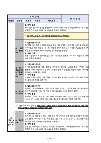 - 562 -%uc81c %uc678 %uc5c5 %uc885%uc0c1 %uc138 %uc124 %uba85%ub300%ubd84%ub958%uc911%ubd84%ub958%uc18c%ubd84%ub958%uc138%ubd84%ub958%uc138%uc138%ubd84%ub9582. %ud558%uc704 %uc5c5%uc885%uc11c%uc801, %uc7a1%uc9c0 %ubc0f %uae30%ud0c0 %uc778%uc1c4%ubb3c %ucd9c%ud310%uc5c5(581)%uacfc %uc18c%ud504%ud2b8%uc6e8%uc5b4 %uac1c%ubc1c %ubc0f %uacf5%uae09%uc5c5(582)%uc758 2%uac1c %uc18c%ubd84%ub958%uc5c5%uc885%uacfc %uadf8%uc758 %ud558%uc704 %uc138%ubd84%ub958 %ubc0f %uc138%uc138%ubd84%ub958 %uc5c5%uc885%uc744 %ud3ec%ud568%ud55c%ub2e4.%u261e %ub2e8, %u2018%uc11c%uc801, %uc7a1%uc9c0 %ubc0f %uae30%ud0c0 %uc778%uc1c4%ubb3c %ucd9c%ud310%uc5c5%u2019(581)%uc740 %ud5c8%uc6a9%ud55c%ub2e4.%u2468 %uc6b0%ud3b8 %ubc0f %ud1b5%uc2e0%uc5c5(61)1. %uc5c5%uc885 %uc124%uba85 (%uc911%ubd84%ub958)%uc77c%ubc18%ub300%uc911%uc774%ub098 %ub2e4%ub978 %uc0ac%uc5c5%uccb4%ub97c %uc704%ud558%uc5ec %uad6d%ub0b4%u2024%uc678%uc5d0 %uc1a1%ub2ec%ub418%ub294 %uc6b0%ud3b8%ubb3c%uc744 %uc218%uc9d1 %ubc0f %ubc30%ub2ec%ud558%ub294 %uc6b0%ud3b8%uc0ac%uc5c5%uacfc %uc804%uc2e0, %uc804%ud654 %ubc0f %uae30%ud0c0 %ud1b5%uc2e0%uc2dc%uc124%uc5d0 %uc758%ud558%uc5ec %uc74c%uc131 %ub610%ub294 %ube44%uc74c%uc131 %uc804%ub2ec%uc694%uc18c%ub97c %uc804%uae30%uc2dd %ub610%ub294 %uc804%uc790%uc2dd %ubc29%ubc95%uc5d0 %uc758%ud558%uc5ec %uc1a1%ub2ec%ud558%ub294 %uc804%uae30%ud1b5%uc2e0%uc5c5%uc744 %ub9d0%ud55c%ub2e4.2. %ud558%uc704 %uc5c5%uc885%uacf5%uc601 %uc6b0%ud3b8%uc5c5(611)%uacfc %uc804%uae30%ud1b5%uc2e0%uc5c5(612)%uc758 2%uac1c %uc18c%ubd84%ub958%uc5c5%uc885%uacfc %uadf8%uc758 %ud558%uc704 %uc138%ubd84%ub958 %ubc0f %uc138%uc138%ubd84%ub958 %uc5c5%uc885%uc744 %ud3ec%ud568%ud55c%ub2e4.%u2469 %ucef4%ud4e8%ud130 %ud504%ub85c%uadf8%ub798%ubc0d, %uc2dc%uc2a4%ud15c %ud1b5%ud569 %ubc0f %uad00%ub9ac%uc5c5(62)1. %uc5c5%uc885 %uc124%uba85 (%uc911%ubd84%ub958)%uc8fc%ubb38%ud615 %uc18c%ud504%ud2b8%uc6e8%uc5b4%ub97c %uac1c%ubc1c, %uc218%uc815 %ubc0f %uc2dc%ud5d8%ud558%uac70%ub098 %ucef4%ud4e8%ud130 %uc2dc%uc2a4%ud15c%uc744 %ud1b5%ud569 %uad6c%ucd95%ud558%ub294 %uc0b0%uc5c5%ud65c%ub3d9%uacfc %uace0%uac1d%uc758 %uc0ac%uc5c5%uc7a5%uc5d0%uc11c %ucef4%ud4e8%ud130 %uc2dc%uc2a4%ud15c%uc758 %uad00%ub9ac %ubc0f %uc6b4%uc601%uad00%ub828 %uc804%ubb38%uc801%uff65%uae30%uc220%uc801 %uc11c%ube44%uc2a4%ub97c%uc81c%uacf5%ud558%ub294 %uc0b0%uc5c5%ud65c%ub3d9%uc744 %ub9d0%ud55c%ub2e4.2. %ud558%uc704 %uc5c5%uc885%uc18c%ubd84%ub958 %uc5c5%uc885%uc778 %ucef4%ud4e8%ud130 %ud504%ub85c%uadf8%ub798%ubc0d, %uc2dc%uc2a4%ud15c %ud1b5%ud569 %ubc0f %uad00%ub9ac%uc5c5(620)%uacfc %uadf8%uc758 %ud558%uc704 %uc138%ubd84%ub958 %ubc0f %uc138%uc138%ubd84%ub958 %uc5c5%uc885%uc744 %ud3ec%ud568%ud55c%ub2e4.%u246a %uc815%ubcf4%uc11c%ube44%uc2a4%uc5c5(63)1. %uc5c5%uc885 %uc124%uba85 (%uc911%ubd84%ub958)%uc790%ub8cc%ucc98%ub9ac %ubc0f %ub370%uc774%ud130%ubca0%uc774%uc2a4 %uad6c%ucd95, %uc6f9 %ubc0f %uc11c%ubc84 %ud638%uc2a4%ud305, %uc2a4%ud2b8%ub9ac%ubc0d %uc11c%ube44%uc2a4%ub97c %uc81c%uacf5%ud558%uac70%ub098 %uc778%ud130%ub137 %uc815%ubcf4%ub9e4%uac1c %uc11c%ube44%uc2a4 %ubc0f %uae30%ud0c0 %ubc29%uc2dd%uc758 %uc815%ubcf4%uc81c%uacf5 %uc11c%ube44%uc2a4 %ud65c%ub3d9%uc744 %ub9d0%ud55c%ub2e4.2. %ud558%uc704 %uc5c5%uc885%uc790%ub8cc%ucc98%ub9ac, %ud638%uc2a4%ud305, %ud3ec%ud138 %ubc0f %uae30%ud0c0 %uc778%ud130%ub137 %uc815%ubcf4%ub9e4%uac1c %uc11c%ube44%uc2a4%uc5c5(631), %uae30%ud0c0 %uc815%ubcf4 %uc11c%ube44%uc2a4%uc5c5(639)%uc758 2%uac1c %uc18c%ubd84%ub958%uc5c5%uc885%uacfc %uadf8%uc758 %ud558%uc704 %uc138%ubd84%ub958 %ubc0f %uc138%uc138%ubd84%ub958 %uc5c5%uc885%uc744 %ud3ec%ud568%ud55c%ub2e4.%u261e %ub300%ubd84%ub958 G%uc758 %ud558%uc704 %uc5c5%uc885 %uc911 %u2018%uc601%uc0c1%u00b7%uc624%ub514%uc624 %uae30%ub85d%ubb3c %uc81c%uc791 %ubc0f %ubc30%uae09%uc5c5%u2019(59)%uacfc %u2018%ubc29%uc1a1 %ubc0f %uc601%uc0c1%uff65%uc624%ub514%uc624%ubb3c %uc81c%uacf5 %uc11c%ube44%uc2a4%uc5c5%u2019(60)%uc740 %uc81c%uc678%uc5c5%uc885%uc5d0 %ud3ec%ud568%ub418%uc5b4 %uc788%uc9c0 %uc54a%uc74cK.%uae08%uc735 %ubc0f %ubcf4%ud5d8%uc5c5(64~66)%u246b %uae08%uc735%uc5c5(64)1. %uc5c5%uc885 %uc124%uba85 (%uc911%ubd84%ub958)%uc790%uae08 %uc5ec%uff65%uc218%uc2e0 %ud65c%ub3d9%uc744 %uc218%ud589%ud558%ub294 %uac01%uc885 %uc740%ud589 %ubc0f %uc800%ucd95%uae30%uad00, %ubaa8%uc9d1 %uc790%uae08%uc744 %uc720%uac00%uc99d%uad8c %ubc0f %uae30%ud0c0 %uae08%uc735%uc790%uc0b0%uc5d0 %ud22c%uc790%ud558%ub294 %uae30%uad00, %uc5ec%uc2e0 %uc804%ubb38 %uae08%uc735%uae30%uad00, %uadf8 %uc678 %uacf5%uacf5%uae30%uae08 %uad00%ub9ac%uff65%uc6b4%uc6a9%uae30%uad00%uacfc %uc9c0%uc8fc%ud68c%uc0ac %ub4f1%uc774 %uc218%ud589%ud558%ub294 %uc0b0%uc5c5%ud65c%ub3d9%uc744 %ud3ec%ud568%ud55c%ub2e4.2. %ud558%uc704 %uc5c5%uc885%uc740%ud589 %ubc0f %uc800%ucd95%uae30%uad00(641), %uc2e0%ud0c1%uc5c5 %ubc0f %uc9d1%ud569 %ud22c%uc790%uc5c5(642), %uae30%ud0c0 %uae08%uc735%uc5c5(649)%uc758 3%uac1c %uc18c%ubd84%ub958%uc5c5%uc885%uacfc %uadf8%uc758 %ud558%uc704 %uc138%ubd84%ub958 %ubc0f %uc138%uc138%ubd84%ub958 %uc5c5%uc885%uc744 %ud3ec%ud568%ud55c%ub2e4.
