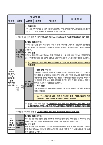 - 564 -%uc81c %uc678 %uc5c5 %uc885%uc0c1 %uc138 %uc124 %uba85%ub300%ubd84%ub958%uc911%ubd84%ub958%uc18c%ubd84%ub958%uc138%ubd84%ub958%uc138%uc138%ubd84%ub9582. %ud558%uc704 %uc5c5%uc885%uac74%ucd95 %uae30%uc220, %uc5d4%uc9c0%ub2c8%uc5b4%ub9c1 %ubc0f %uad00%ub828 %uae30%uc220%uc11c%ube44%uc2a4%uc5c5(721), %uae30%ud0c0 %uacfc%ud559%uae30%uc220 %uc11c%ube44%uc2a4%uc5c5(729)%uc758 2%uac1c %uc18c%ubd84%ub958%uc5c5%uc885%uacfc %uadf8%uc758 %ud558%uc704 %uc138%ubd84%ub958 %ubc0f %uc138%uc138%ubd84%ub958 %uc5c5%uc885%uc744 %ud3ec%ud568%ud55c%ub2e4.%u261e %ub300%ubd84%ub958 G%uc758 %ud558%uc704 %uc5c5%uc885 %uc911 %u2018%uae30%ud0c0 %uc804%ubb38, %uacfc%ud559 %ubc0f %uae30%uc220 %uc11c%ube44%uc2a4%uc5c5(73)%u2019%uc740 %uc81c%uc678%uc5c5%uc885%uc5d0 %ud3ec%ud568%ub418%uc5b4 %uc788%uc9c0 %uc54a%uc74cN.%uc0ac%uc5c5%uc2dc%uc124 %uad00%ub9ac, %uc0ac%uc5c5 %uc9c0%uc6d0 %ubc0f %uc784%ub300 %uc11c%ube44%uc2a4%uc5c5(74~76)%u2472 %uc0ac%uc5c5%uc2dc%uc124 %uad00%ub9ac %ubc0f %uc870%uacbd %uc11c%ube44%uc2a4%uc5c5(74)1. %uc5c5%uc885 %uc124%uba85 (%uc911%ubd84%ub958)%uace0%uac1d%uc758 %uc0ac%uc5c5%uc2dc%uc124%uc744 %uad00%ub9ac %ub610%ub294 %uccad%uc18c, %uc18c%ub3c5 %ubc0f %ubc29%uc81c %uc11c%ube44%uc2a4%ub97c %uc218%ud589%ud558%uac70%ub098 %uc0b0%uc5c5%uc7a5%ube44 %ubc0f %uc6a9%ud488%uc744 %ubb3c%ub9ac%uc801, %ud654%ud559%uc801%uc73c%ub85c %uc138%ucc99%ud558%ub294 %uc0b0%uc5c5%ud65c%ub3d9%uc744 %ub9d0%ud55c%ub2e4. %uc870%uacbd%uad00%ub9ac %ubc0f %uc720%uc9c0 %uc11c%ube44%uc2a4 %ud65c%ub3d9%ub3c4 %uc5ec%uae30%uc5d0 %ubd84%ub958%ud55c%ub2e4.2. %ud558%uc704 %uc5c5%uc885%uc0ac%uc5c5%uc2dc%uc124 %uc720%uc9c0%uff65%uad00%ub9ac %uc11c%ube44%uc2a4%uc5c5(741), %uac74%ubb3c%uff65%uc0b0%uc5c5%uc124%ube44 %uccad%uc18c %ubc0f %ubc29%uc81c %uc11c%ube44%uc2a4%uc5c5(742), %uc870%uacbd%uad00%ub9ac %ubc0f %uc720%uc9c0%uc11c%ube44%uc2a4%uc5c5(743)%uc758 3%uac1c %uc18c%ubd84%ub958%uc5c5%uc885%uacfc %uadf8%uc758 %ud558%uc704 %uc138%ubd84%ub958 %ubc0f %uc138%uc138%ubd84%ub958 %uc5c5%uc885%uc744 %ud3ec%ud568%ud55c%ub2e4.%u261e%ub2e8, %u2018%uc0ac%uc5c5%uc2dc%uc124 %uc720%uc9c0%uff65%uad00%ub9ac %uc11c%ube44%uc2a4%uc5c5%u2019(741)%uacfc %u2018%uac74%ubb3c %ubc0f %uc0b0%uc5c5%uc124%ube44 %uccad%uc18c%uc5c5%u2019(7421)%uc740 %ud5c8%uc6a9%ud55c%ub2e4.75. %uc0ac%uc5c5 %uc9c0%uc6d0%uc11c%ube44%uc2a4%uc5c5%u2473 %uace0%uc6a9 %uc54c%uc120 %ubc0f %uc778%ub825 %uacf5%uae09%uc5c5(751)1. %uc5c5%uc885 %uc124%uba85 (%uc18c%ubd84%ub958)%uace0%uc6a9%uc8fc%uc640 %uad6c%uc9c1%uc790%ub97c %ub300%ub9ac%ud558%uc5ec %uace0%uc6a9%uc5d0 %uad00%ub828%ub41c %uc778%uc801 %uc0ac%ud56d %uc870%uc0ac, %uad6c%uc778 %uc870%ud68c %ub4f1 %uc54c%uc120 %ud65c%ub3d9%uc744 %uc218%ud589%ud558%uac70%ub098 %uc790%uae30 %uad00%ub9ac %uc544%ub798 %ub178%ub3d9 %uc778%ub825%uc744 %ud655%ubcf4%ud558%uace0 %ud2b9%uc815 %uc778%ub825%uc744 %uc0ac%uc6a9%ud558%uae30%ub97c %uc6d0%ud558%ub294 %uc0ac%uc5c5%uc790 %ub610%ub294 %uac1c%uc778%uacfc %uace0%uc6a9%uacc4%uc57d%uc744 %uccb4%uacb0%ud558%uc5ec %uc778%ub825%uc744 %uc81c%uacf5%ud558%uace0%uadf8 %ub300%uac00%ub97c %uc9c1%uc811 %ubc1b%uc544 %ud53c%uace0%uc6a9%uc790%uc5d0%uac8c %uc790%uae30%uac00 %uc9c1%uc811 %uae09%ub8cc%ub97c %uc9c0%ubd88%ud558%ub294 %ud615%ud0dc%uc758%uc778%ub825%uc744 %uacf5%uae09%ud558%ub294 %uc0b0%uc5c5%ud65c%ub3d9%uc744 %ud3ec%ud568%ud55c%ub2e4.2. %ud558%uc704 %uc5c5%uc885%uace0%uc6a9 %uc54c%uc120%uc5c5(7511), %uc778%ub825 %uacf5%uae09%uc5c5(7512)%uc758 2%uac1c %uc138%ubd84%ub958 %uc5c5%uc885%uacfc %uadf8%uc758 %ud558%uc704 %uc138%uc138%ubd84%ub958 %uc5c5%uc885%uc744 %ud3ec%ud568%ud55c%ub2e4.%u261e%ub2e8, %u300c%uac00%uc0ac%uadfc%ub85c%uc790%uc758 %uace0%uc6a9 %uac1c%uc120 %ub4f1%uc5d0 %uad00%ud55c %ubc95%ub960%u300d %uc81c2%uc870%uc81c2%ud638%uc5d0 %ub530%ub978 %uac00%uc0ac%uc11c%ube44%uc2a4 %uc81c%uacf5%uae30%uad00%uc5d0 %ucde8%uc5c5%ud558%ub294 %uacbd%uc6b0%ub294 %ud5c8%uc6a9%ud55c%ub2e4.%u261e %uc911%ubd84%ub958 75%uc758 %ud558%uc704 %uc5c5%uc885 %uc911%u2018%uc5ec%ud589%uc0ac %ubc0f %uae30%ud0c0 %uc5ec%ud589%ubcf4%uc870 %uc11c%ube44%uc2a4%uc5c5%u2019(752), %u2018%uacbd%ube44, %uacbd%ud638 %ubc0f %ud0d0%uc815%uc5c5%u2019(753), %u2018%uae30%ud0c0 %uc0ac%uc5c5 %uc9c0%uc6d0 %uc11c%ube44%uc2a4%uc5c5%u2019(759)%uc740 %uc81c%uc678%uc5c5%uc885%uc5d0 %ud3ec%ud568%ub418%uc5b4 %uc788%uc9c0 %uc54a%uc74c%u261e %ub300%ubd84%ub958 N%uc758 %ud558%uc704 %uc5c5%uc885 %uc911 %u2018%uc784%ub300%uc5c5; %ubd80%ub3d9%uc0b0 %uc81c%uc678%u2019(76)%uc740 %uc81c%uc678%uc5c5%uc885%uc5d0 %ud3ec%ud568%ub418%uc5b4 %uc788%uc9c0 %uc54a%uc74cO.%uacf5%uacf5 %ud589%uc815, %uad6d%ubc29 %ubc0f %uc0ac%ud68c%ubcf4%uc7a5%ud589%uc815(84) %u3251 %uacf5%uacf5 %ud589%uc815, %uad6d%ubc29 %ubc0f %uc0ac%ud68c%ubcf4%uc7a5 %ud589%uc815(84)1. %uc5c5%uc885 %uc124%uba85 (%ub300%ubd84%ub958)%uad6d%uac00 %ubc0f %uc9c0%ubc29 %ud589%uc815%uae30%uad00%uc774 %uc77c%ubc18 %ub300%uc911%uc5d0%uac8c %uc81c%uacf5%ud558%ub294 %uacf5%uacf5 %ud589%uc815, %uad6d%ubc29%uff65%uc0b0%uc5c5 %ubc0f %uc0ac%ud68c%ubcf4%uc7a5 %ud589%uc815 %uc5c5%ubb34%ub97c %ud3ec%ud568%ud55c%ub2e4. %uc774%ub7ec%ud55c %ud65c%ub3d9%uc740 %ube44%uc815%ubd80 %uae30%uad00%uc5d0 %uc758%ud574 %uc218%ud589%ub418%ub294 %uacbd%uc6b0%ub3c4 %uc788%ub2e4.2. %ud558%uc704 %uc5c5%uc885%uc785%ubc95 %ubc0f %uc77c%ubc18 %uc815%ubd80 %ud589%uc815(841), %uc0ac%ud68c %ubc0f %uc0b0%uc5c5%uc815%ucc45 %ud589%uc815(842), %uc678%ubb34 %ubc0f %uad6d%ubc29 %ud589%uc815(843), %uc0ac%ubc95 %ubc0f %uacf5%uacf5 %uc9c8%uc11c %ud589%uc815(844), %uc0ac%ud68c%ubcf4%uc7a5 %ud589%uc815(845)%uc758 5%uac1c %uc18c%ubd84%ub958%uc5c5%uc885%uacfc %uadf8%uc758 %ud558%uc704 %uc138%ubd84%ub958 %ubc0f %uc138%uc138%ubd84%ub958 %uc5c5%uc885%uc744 %ud3ec%ud568%ud55c%ub2e4.