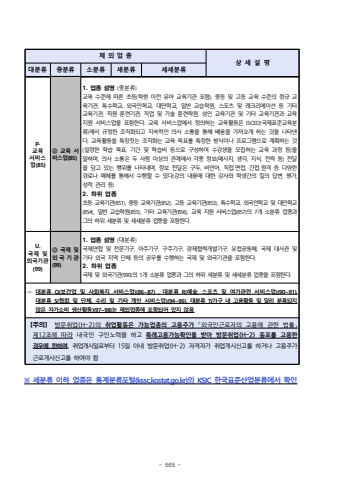- 565 -%u203b %uc138%ubd84%ub958 %uc774%ud558 %uc5c5%uc885%uc740 %ud1b5%uacc4%ubd84%ub958%ud3ec%ud138(kssc.kostat.go.kr)%uc758 KSIC %ud55c%uad6d%ud45c%uc900%uc0b0%uc5c5%ubd84%ub958%uc5d0%uc11c %ud655%uc778%uc81c %uc678 %uc5c5 %uc885%uc0c1 %uc138 %uc124 %uba85%ub300%ubd84%ub958%uc911%ubd84%ub958%uc18c%ubd84%ub958%uc138%ubd84%ub958%uc138%uc138%ubd84%ub958p.%uad50%uc721%uc11c%ube44%uc2a4%uc5c5(85) %u3252 %uad50%uc721 %uc11c%ube44%uc2a4%uc5c5(85)1. %uc5c5%uc885 %uc124%uba85 (%uc911%ubd84%ub958)%uad50%uc721 %uc218%uc900%uc5d0 %ub530%ub978 %ucd08%ub4f1(%ud559%ub839 %uc774%uc804 %uc720%uc544 %uad50%uc721%uae30%uad00 %ud3ec%ud568), %uc911%ub4f1 %ubc0f %uace0%ub4f1 %uad50%uc721 %uc218%uc900%uc758 %uc815%uaddc %uad50%uc721%uae30%uad00, %ud2b9%uc218%ud559%uad50, %uc678%uad6d%uc778%ud559%uad50, %ub300%uc548%ud559%uad50, %uc77c%ubc18 %uad50%uc2b5%ud559%uc6d0, %uc2a4%ud3ec%uce20 %ubc0f %ub808%ud06c%ub9ac%uc5d0%uc774%uc158 %ub4f1 %uae30%ud0c0 %uad50%uc721%uae30%uad00, %uc9c1%uc6d0 %ud6c8%ub828%uae30%uad00, %uc9c1%uc5c5 %ubc0f %uae30%uc220 %ud6c8%ub828%ud559%uc6d0, %uc131%uc778 %uad50%uc721%uae30%uad00 %ubc0f %uae30%ud0c0 %uad50%uc721%uae30%uad00%uacfc %uad50%uc721 %uc9c0%uc6d0 %uc11c%ube44%uc2a4%uc5c5%uc744 %ud3ec%ud568%ud55c%ub2e4. %uad50%uc721 %uc11c%ube44%uc2a4%uc5c5%uc5d0%uc11c %uc815%uc758%ud558%ub294 %uad50%uc721%ud65c%ub3d9%uc740 ISCED(%uad6d%uc81c%ud45c%uc900%uad50%uc721%ubd84%ub958)%uc5d0%uc11c %uaddc%uc815%ud55c %uc870%uc9c1%ud654%ub418%uace0 %uc9c0%uc18d%uc801%uc778 %uc758%uc0ac %uc18c%ud1b5%uc744 %ud1b5%ud574 %ubc30%uc6c0%uc744 %uac00%uc838%uc624%uac8c %ud558%ub294 %uac83%uc744 %ub098%ud0c0%ub0b8%ub2e4. %uad50%uc721%ud65c%ub3d9%uc744 %ud2b9%uc9d5%uc9d3%ub294 %uc870%uc9c1%ud654%ub294 %uad50%uc721 %ubaa9%ud45c%ub97c %ud2b9%uc815%ud55c %ubc29%uc2dd%uc774%ub098 %ud504%ub85c%uadf8%ub7a8%uc73c%ub85c %uacc4%ud68d%ud558%ub294 %uac83(%uc77c%uc815%ud55c %ud559%uc2b5 %ubaa9%ud45c, %uae30%uac04 %ubc0f %ud559%uc2b5%ube44 %ub4f1%uc73c%ub85c %uad6c%uc131%ud558%uc5ec %uc218%uac15%uc0dd%uc744 %ubaa8%uc9d1%ud558%ub294 %uad50%uc721 %uacfc%uc815 %ub4f1)%uc744 %ub9d0%ud558%uba70, %uc758%uc0ac %uc18c%ud1b5%uc740 %ub450 %uc0ac%ub78c %uc774%uc0c1%uc758 %uad00%uacc4%uc5d0%uc11c %uac01%uc885 %uc815%ubcf4(%uba54%uc2dc%uc9c0, %uc0dd%uac01, %uc9c0%uc2dd, %uc804%ub7b5 %ub4f1) %uc804%ub2ec%uc744 %ub2f4%uace0 %uc788%ub294 %ud589%uc704%ub97c %ub098%ud0c0%ub0b4%uba70, %uc815%ubcf4 %uc804%ub2ec%uc740 %uad6c%ub450, %ube44%uc5b8%uc5b4, %uc9c1%uc811%u2024%uba74%uc811, %uac04%uc811%u2024%uc6d0%uaca9 %ub4f1 %ub2e4%uc591%ud55c %uacbd%ub85c%ub098 %ub9e4%uccb4%ub97c %ud1b5%ud574%uc11c %uc218%ud589%ud560 %uc218 %uc788%ub2e4(%uac15%uc758 %ub0b4%uc6a9%uc5d0 %ub300%ud55c %uac15%uc0ac%uc640 %ud559%uc0dd%uac04%uc758 %uc9c8%uc758 %ub2f5%ubcc0, %ud3c9%uac00, %uc131%uc801 %uad00%ub9ac %ub4f1)2. %ud558%uc704 %uc5c5%uc885%ucd08%ub4f1 %uad50%uc721%uae30%uad00(851), %uc911%ub4f1 %uad50%uc721%uae30%uad00(852), %uace0%ub4f1 %uad50%uc721%uae30%uad00(853), %ud2b9%uc218%ud559%uad50, %uc678%uad6d%uc778%ud559%uad50 %ubc0f %ub300%uc548%ud559%uad50(854), %uc77c%ubc18 %uad50%uc2b5%ud559%uc6d0(855), %uae30%ud0c0 %uad50%uc721%uae30%uad00(856), %uad50%uc721 %uc9c0%uc6d0 %uc11c%ube44%uc2a4%uc5c5(857)%uc758 7%uac1c %uc18c%ubd84%ub958 %uc5c5%uc885%uacfc %uadf8%uc758 %ud558%uc704 %uc138%ubd84%ub958 %ubc0f %uc138%uc138%ubd84%ub958 %uc5c5%uc885%uc744 %ud3ec%ud568%ud55c%ub2e4.U.%uad6d%uc81c %ubc0f %uc678%uad6d%uae30%uad00(99)%u3253 %uad6d%uc81c %ubc0f %uc678 %uad6d %uae30 %uad00(99)1. %uc5c5%uc885 %uc124%uba85 (%ub300%ubd84%ub958)%uad6d%uc81c%uc5f0%ud569 %ubc0f %uc804%ubb38%uae30%uad6c, %uc544%uc8fc%uae30%uad6c, %uad6c%uc8fc%uae30%uad6c, %uacbd%uc81c%ud611%ub825%uac1c%ubc1c%uae30%uad6c, %uc720%ub7fd%uacf5%ub3d9%uccb4, %uad6d%uc81c %ub300%uc0ac%uad00 %ubc0f %uae30%ud0c0 %uc678%uad6d %uc9c0%uc5ed %ub2e8%uccb4 %ub4f1%uc758 %uacf5%ubb34%ub97c %uc218%ud589%ud558%ub294 %uad6d%uc81c %ubc0f %uc678%uad6d%uae30%uad00%uc744 %ud3ec%ud568%ud55c%ub2e4. 2. %ud558%uc704 %uc5c5%uc885%uad6d%uc81c %ubc0f %uc678%uad6d%uae30%uad00(990)%uc758 1%uac1c %uc18c%ubd84%ub958 %uc5c5%uc885%uacfc %uadf8%uc758 %ud558%uc704 %uc138%ubd84%ub958 %ubc0f %uc138%uc138%ubd84%ub958 %uc5c5%uc885%uc744 %ud3ec%ud568%ud55c%ub2e4.%u261e %ub300%ubd84%ub958 Q(%ubcf4%uac74%uc5c5 %ubc0f %uc0ac%ud68c%ubcf5%uc9c0 %uc11c%ube44%uc2a4%uc5c5)(86~87) , %ub300%ubd84%ub958 R(%uc608%uc220, %uc2a4%ud3ec%uce20 %ubc0f %uc5ec%uac00%uad00%ub828 %uc11c%ube44%uc2a4%uc5c5)(90~91), %ub300%ubd84%ub958 S(%ud611%ud68c %ubc0f %ub2e8%uccb4, %uc218%ub9ac %ubc0f %uae30%ud0c0 %uac1c%uc778 %uc11c%ube44%uc2a4%uc5c5)(94~96), %ub300%ubd84%ub958 T(%uac00%uad6c %ub0b4 %uace0%uc6a9%ud65c%ub3d9 %ubc0f %ub2ec%ub9ac %ubd84%ub958%ub418%uc9c0 %uc54a%uc740 %uc790%uac00%uc18c%ube44 %uc0dd%uc0b0%ud65c%ub3d9)(97~98)%ub294 %uc81c%uc678%uc5c5%uc885%uc5d0 %ud3ec%ud568%ub418%uc5b4 %uc788%uc9c0 %uc54a%uc74c%u3010%uc8fc%uc758%u3011%ubc29%ubb38%ucde8%uc5c5(H-2)%uc758 %ucde8%uc5c5%ud65c%ub3d9%uc740 %uac00%ub2a5%uc5c5%uc885%uc758 %uace0%uc6a9%uc8fc%uac00%u300c%uc678%uad6d%uc778%uadfc%ub85c%uc790%uc758 %uace0%uc6a9%uc5d0 %uad00%ud55c %ubc95%ub960%u300d %uc81c12%uc870%uc5d0 %ub530%ub77c%ub0b4%uad6d%uc778 %uad6c%uc778%ub178%ub825%uc744%ud558%uace0 %ud2b9%ub840%uace0%uc6a9%uac00%ub2a5%ud655%uc778%uc744 %ubc1b%uc544 %ubc29%ubb38%ucde8%uc5c5(H-2) %ub3d9%ud3ec%ub97c %uace0%uc6a9%ud55c %uacbd%uc6b0%uc5d0 %ud55c%ud558%uba70, %ucde8%uc5c5%uac1c%uc2dc%uc77c%ub85c%ubd80%ud130 15%uc77c %uc774%ub0b4%ubc29%ubb38%ucde8%uc5c5(H-2) %uc790%uaca9%uc790%uac00 %ucde8%uc5c5%uac1c%uc2dc%uc2e0%uace0%ub97c %ud558%uac70%ub098 %uace0%uc6a9%uc8fc%uac00 %uadfc%ub85c%uac1c%uc2dc%uc2e0%uace0%ub97c %ud558%uc5ec%uc57c %ud568