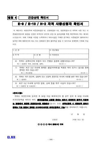 - 566 -%ubcc4%ucca8 4%uac74%uac15%uc0c1%ud0dc %ud655%uc778%uc11cE-9/E-10/H-2%uc790%uaca9%uc0ac%uc99d%uc2e0%uccad%uc790%ud655%uc778%uc11c%uc774 %ud655%uc778%uc11c%ub294 %ub300%ud55c%ubbfc%uad6d%uc758 %ube44%uc804%ubb38%ucde8%uc5c5(E-9), %uc120%uc6d0%ucde8%uc5c5(E-10), %ubc29%ubb38%ucde8%uc5c5(H-2) %uc790%uaca9%uc758 %uc0ac%uc99d %ub610%ub294%uc0ac%uc99d%ubc1c%uae09%uc778%uc815%uc11c%uc758 %ubc1c%uae09%uc744 %uc2e0%uccad%ud55c %uc678%uad6d%uc778%uc774%ubcf8%uc778%uc758 %uac74%uac15 %ubc0f %uc2ec%ub9ac%uc0c1%ud0dc%ub97c %uc9c1%uc811 %ud655%uc778%ud558%uc5ec%uc57c %ud558%ub294 %uccb4%ud06c%ub9ac%uc2a4%ud2b8%uc785%ub2c8%ub2e4%uc544%ub798 %uae30%uc7ac%ud560 %uc0ac%ud56d%uc744%ub204%ub77d%ud558%uac70%ub098%ud5c8%uc704%uc0ac%uc2e4%uc744%uae30%uc7ac%ud55c %uacbd%uc6b0%uc5d0%ub294 %uc0ac%uc99d%ubc1c%uae09%uc774 %ubd88%ud5c8%ub418%uac70%ub098 %uc785%uad6d%ud55c %ud6c4%uc5d0 %uccb4%ub958%ud5c8%uac00%uc758 %ucde8%uc18c %ub610%ub294 %uac15%uc81c%ud1f4%uac70 %ub4f1%uc758 %ubd88%uc774%uc775%uc744%ubc1b%uc744 %uc218 %uc788%uc73c%ubbc0%ub85c %uc815%ud655%ud558%uac8c%uae30%uc7ac%ud574 %uc8fc%uc2ed%uc2dc%uc624.1) %uc131 %uba852) %uc0dd%ub144%uc6d4%uc77c3) %uad6d %uc8014) %uc131 %ubcc45) %uc5ec%uad8c%ubc88%ud6386) %uadc0%ud558%ub294 %uacf5%uc911%ubcf4%uac74%uc5d0 %uc704%ud611%uc774 %ub418%ub294 %uc804%uc5fc%uc131 %uc9c8%ud658%uc5d0 %uac10%uc5fc%ub418%uc5c8%uc2b5%ub2c8%uae4c?%uc608 %u25a1 (%uc9c8%ud658%uba85: %ub9e4%ub3c5, B%ud615%uac04%uc5fc, %uacb0%ud575), %uc544%ub2c8%uc624 %u25a1 7) %uadc0%ud558%ub294 %ucd5c%uadfc 5%ub144 %uc774%ub0b4%uc5d0 %ud1b5%uc81c%ub41c %ubb3c%uc9c8(%ub9c8%uc57d%ub958)%uc744 %ubcf5%uc6a9%ud55c %uc801%uc774 %uc788%uac70%ub098 %uc54c%ucf54%uc62c %ub4f1%uc5d0 %uc911%ub3c5%ub41c %uc801%uc774 %uc788%uc2b5%ub2c8%uae4c?%uc608 %u25a1 (%ubcf5%uc6a9%ubb3c%uc9c8: ), %uc544%ub2c8%uc624 %u25a1 8) %uadc0%ud558%ub294 %uacfc%uac70 %uc815%uc2e0%uc801, %uac10%uc815%uc801 %ub610%ub294 %uc2e0%uacbd%uc801 %ud63c%ub780%uc73c%ub85c %uc758%uc0ac%uc758 %uce58%ub8cc%ub97c %ubc1b%uc740 %uc801%uc774 %uc788%uc2b5%ub2c8%uae4c?%uc608 %u25a1 (%uc9c8%ud658%uba85: ), %uc544%ub2c8%uc624 %u25a1 9) %ucd5c%uadfc 5%ub144 %uc774%ub0b4%uc5d0 %uc2ec%uac01%ud55c %uc9c8%ubcd1, %uc0c1%ud574 %ub4f1%uc744 %uacaa%uc740 %uc0ac%uc2e4%uc774 %uc788%uc2b5%ub2c8%uae4c?%uc608 %u25a1 (%uc9c8%ud658%uba85 %ubc0f %uce58%ub8cc%uacbd%uacfc : ), %uc544%ub2c8%uc624 %u25a1 <%uc720%uc758%uc0ac%ud56d>%uadc0%ud558%ub294 %ub300%ud55c%ubbfc%uad6d%uc5d0 %uc785%uad6d%ud55c %ud6c4 90%uc77c %uc774%uc0c1 %uccb4%ub958%ud558%uace0%uc790 %ud560 %uacbd%uc6b0 %uc785%uad6d %ud6c4 90%uc77c %uc774%ub0b4%uc5d0 %uc678%uad6d%uc778%ub4f1%ub85d%uc744 %ud558%uc5ec%uc57c %ud558%uba70, %uc678%uad6d%uc778%ub4f1%ub85d%uc744 %uc2e0%uccad%ud560 %ub54c%uc5d0%ub294 %ubc18%ub4dc%uc2dc %ub300%ud55c%ubbfc%uad6d %uc815%ubd80%uac00 %uc9c0%uc815%ud558%ub294 %ubcd1%uc6d0%uc5d0%uc11c %ubc1c%uae09%ud55c %uac74%uac15%uc9c4%ub2e8%uc11c%ub97c %uc81c%ucd9c%ud574%uc57c%ud569%ub2c8%ub2e4. %ub610%ud55c, %uc678%uad6d%uc778%ub4f1%ub85d %uc2dc %ub300%ud55c%ubbfc%uad6d %uc815%ubd80%uac00 %uc815%ud558%ub294 %uae30%ucd08 %ubc95%uc9c8%uc11c %uad50%uc721%uc744 %uc774%uc218%ud558%uc5ec%uc57c%uc9c0%ub9cc %uc678%uad6d%uc778%ub4f1%ub85d%uc774 %uac00%ub2a5%ud568%uc744 %uc720%uc758%ud558%uc2dc%uae30 %ubc14%ub78d%ub2c8%ub2e4. %ub144 %uc6d4 %uc77c%uc2e0%uccad%uc778: (%uc11c%uba85 %ub610%ub294 %uc778) %u25cb %u25cb %u25cb %u25cb %ub300%uc0ac (%ucd1d%uc601%uc0ac)%uadc0%ud558%uf000%ubaa9%ucc28