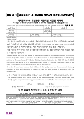 - 568 -%ubcc4%ucca8 6-1%uc7ac%uc678%ub3d9%ud3ec(F-4) %ucde8%uc5c5%ud65c%ub3d9 %uc81c%ud55c%uc9c1%uc5c5 %ube44%ucde8%uc5c5 %uc11c%uc57d%uc11c(%uc601%ubb38)%uc7ac%uc678%ub3d9%ud3ec(F-4)%ucde8%uc5c5%ud65c%ub3d9%uc81c%ud55c%uc9c1%uc5c5%ube44%ucde8%uc5c5%uc11c%uc57d%uc11cPledgeofNon-Employmentin(F-4)RestrictedOccupations%u203b %uc11c%uc57d%uc11c%ub294 %ud55c%uae00 %ub610%ub294 %uc601%ubb38%uc73c%ub85c %uc791%uc131%ud558%uc2dc%uae30 %ubc14%ub78d%ub2c8%ub2e4. (Please complete this form in Korean or English.)(2%ucabd %uc911 1%ucabd)%uc131%uba85Name In Full%uad6d %uc801Nationality%uc131 %ubcc4Gender%uc0dd%ub144%uc6d4%uc77cDate of Birth%ud734%ub300%uc804%ud654Mobile phone No.%uc5ec%uad8c%ubc88%ud638Passport No.%uc5ec%uad8c %ubc1c%uae09%uc77c%uc790Passport Issue Date%uc5ec%uad8c %uc720%ud6a8%uae30%uac04Passport Expiry Date%ub300%ud55c%ubbfc%uad6d %uc548%uc758 %uc8fc%uc18cAddress In Korea%uc0c1%uae30 %ubcf8%uc778%uc740 %ucd9c%uc785%uad6d%uad00%ub9ac%ubc95 %uc81c18%uc870%uc81c1%ud56d, %ub3d9%ubc95 %uc2dc%ud589%ub839 %uc81c23%uc870%uc81c3%ud56d, %ub3d9%ubc95 %uc2dc%ud589%uaddc%uce59 %uc81c27%uc870%uc758 2%uc5d0%ub530%ub77c %u300c%uc7ac%uc678%ub3d9%ud3ec(F-4) %uc790%uaca9%uc758 %ucde8%uc5c5%ud65c%ub3d9 %uc81c%ud55c%ubc94%uc704 %uace0%uc2dc%u300d(%ubc95%ubb34%ubd80 %uace0%uc2dc %uc81c2023-187%ud638, 2023.5.1.)%uc5d0%uc11c%uc815%ud55c %uc7ac%uc678%ub3d9%ud3ec(F-4) %uc790%uaca9%uc758 %ucde8%uc5c5%ud65c%ub3d9 %uc81c%ud55c %uc9c1%uc5c5%uc5d0 %ucde8%uc5c5%ud558%uc9c0 %uc54a%uc744 %uac83%uc744 %uc11c%uc57d%ud569%ub2c8%ub2e4.%uc774%ub97c %uc704%ubc18%ud560 %uacbd%uc6b0 %ubc94%uce59%uae08 %ucc98%ubd84 %ubc0f %uccb4%ub958%uae30%uac04 %uc5f0%uc7a5 %ubd88%ud5c8 %ub4f1 %ucd9c%uc785%uad6d%uad00%ub9ac%ubc95%uc5d0 %ub530%ub978 %ucc98%ubc8c%uc744 %ubc1b%uc744 %uc218 %uc788%uc74c%uc744 %uc548%ub0b4%ubc1b%uc558%uc2b5%ub2c8%ub2e4.I hereby pledge that I will not engage in employment activities in occupations restricted for overseas Korean (F-4) status holders as prescribed in the Announcement of Scope of Restrictions on Job-Seeking Activities for Overseas Korean (F-4) Status (Ministry of Justice Notification No. 2023-187, May 1, 2023) in accordance with Article 18 (1) of the Immigration Act, Article 23 (3) of the Enforcement Decree of the same Act and Article 27-2 of the Enforcement Rule of the same Act.I confirm I have been informed that violation of this pledge can lead to punishments including imposition of fines and permission to extend the stay not being granted in accordance with the Immigration Act. %u203b %ub2e8, %uc9c0%uc5ed%ud2b9%ud654%ud615 %ube44%uc790 %uc2dc%ubc94%uc9c0%uc5ed%uc5d0 %uac70%uc8fc%ud558%ub294 %uc7ac%uc678%ub3d9%ud3ec(F-4)%ub85c%uc11c %uc0ac%uc804%uc5d0 %uccb4%ub958%uc790%uaca9 %uc678 %ud65c%ub3d9%ud5c8%uac00%ub97c %uc2e0%uccad%ud558%ub294 %uacbd%uc6b0%ub294 %uc608%uc678%uc784Yet, overseas Korean (F-4) status holders in the regional-specialized visa pilot regions who have already applied for permission to engage in activities not covered by the status of stay are excluded.%ub144(Year) %uc6d4(Month) %uc77c(Day)%uc2e0%uccad%uc778 Applicant : (%uc11c%uba85 %ub610%ub294 %uc778) (Signature or Seal)OO%ucd9c%uc785%uad6d%u00b7%uc678%uad6d%uc778%uccad(%uc0ac%ubb34%uc18c%u00b7%ucd9c%uc7a5%uc18c)%uc7a5%uadc0%ud558To:ChiefofOOImmigration(Branch)Office%ud589%uc815%uc815%ubcf4 %uacf5%ub3d9%uc774%uc6a9 %ub3d9%uc758%uc11c (Consent for sharing of administrative information)%ubcf8%uc778%uc740 %uc774 %uac74 %uc5c5%ubb34%ucc98%ub9ac%uc640 %uad00%ub828%ud558%uc5ec %ub2f4%ub2f9 %uacf5%ubb34%uc6d0%uc774 %u300c%uc804%uc790%uc815%ubd80%ubc95%u300d %uc81c36%uc870%uc5d0 %ub530%ub978 %ud589%uc815%uc815%ubcf4%uc758 %uacf5%ub3d9%uc774%uc6a9%uc744 %ud1b5%ud558%uc5ec %ub2f4%ub2f9 %uacf5%ubb34%uc6d0 %ud655%uc778 %uc0ac%ud56d%uc744 %ud655%uc778%ud558%ub294 %uac83%uc5d0 %ub3d9%uc758%ud569%ub2c8%ub2e4. *%ub3d9%uc758%ud558%uc9c0 %uc544%ub2c8%ud558%ub294 %uacbd%uc6b0%uc5d0%ub294 %uc2e0%uccad%uc778%uc774 %uc9c1%uc811 %uad00%ub828 %uc11c%ub958%ub97c %uc81c%ucd9c%ud558%uc5ec%uc57c %ud569%ub2c8%ub2e4I hereby consent to allow all documents and information required for the processing of this application to be viewed by a public servant in charge under Article 36 of the Electronic Government Act. *If %u2018Disagree%u2019, the applicant him/herself should submit all the related documents.%uc2e0%uccad%uc778Applicant%uc11c%uba85 %ub610%ub294 %uc778signature/seal%uc2e0%uccad%uc778%uc758 %ubc30%uc6b0%uc790Spouse of applicant%uc11c%uba85 %ub610%ub294 %uc778signature/seal%uc2e0%uccad%uc778%uc758 %ubd80 %ub610%ub294 %ubaa8Father/Mother ofapplicant %uc11c%uba85 %ub610%ub294 %uc778signature/seal%uf000%ubaa9%ucc28