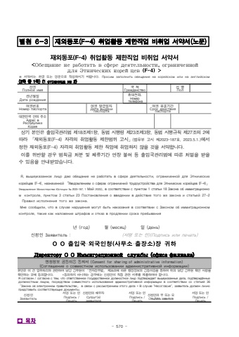 - 570 -%ubcc4%ucca8 6-3%uc7ac%uc678%ub3d9%ud3ec(F-4) %ucde8%uc5c5%ud65c%ub3d9 %uc81c%ud55c%uc9c1%uc5c5 %ube44%ucde8%uc5c5 %uc11c%uc57d%uc11c(%ub178%ubb38)%uc7ac%uc678%ub3d9%ud3ec(F-4)%ucde8%uc5c5%ud65c%ub3d9%uc81c%ud55c%uc9c1%uc5c5%ube44%ucde8%uc5c5%uc11c%uc57d%uc11c<%u041e%u0431%u0435%u0449%u0430%u043d%u0438%u0435 %u043d%u0435 %u0440%u0430%u0431%u043e%u0442%u0430%u0442%u044c %u0432 %u0441%u0444%u0435%u0440%u0435 %u0434%u0435%u044f%u0442%u0435%u043b%u044c%u043d%u043e%u0441%u0442%u0438,%u043e%u0433%u0440%u0430%u043d%u0438%u0447%u0435%u043d%u043d%u043e%u0439%u0434%u043b%u044f %u042d%u0442%u043d%u0438%u0447%u0435%u0441%u043a%u0438%u0445 %u043a%u043e%u0440%u0435%u0439%u0446%u0435%u0432 (F-4)>%u203b %uc11c%uc57d%uc11c%ub294%ud55c%uae00 %ub610%ub294 %uc601%ubb38%uc73c%ub85c %uc791%uc131%ud558%uc2dc%uae30 %ubc14%ub78d%ub2c8%ub2e4%u041f%u0440%u043e%u0441%u0438%u043c %u0437%u0430%u043f%u043e%u043b%u043d%u0438%u0442%u044c %u043e%u0431%u0435%u0449%u0430%u043d%u0438%u0435 %u043d%u0430 %u043a%u043e%u0440%u0435%u0439%u0441%u043a%u043e%u043c %u0438%u043b%u0438 %u043d%u0430 %u0430%u043d%u0433%u043b%u0438%u0439%u0441%u043a%u043e%u043c (2%ucabd %uc911 1%ucabd) (1 %u0441%u0442%u0440%u0430%u043d%u0438%u0446%u0430 %u0438%u0437 2)%uc131%uba85%u041f%u043e%u043b%u043d%u043e%u0435 %u0438%u043c%u044f%uad6d %uc801%u0413%u0440%u0430%u0436%u0434%u0430%u043d%u0441%u0442%u0432%u043e%uc131 %ubcc4%u041f%u043e%u043b%uc0dd%ub144%uc6d4%uc77c%u0414%u0430%u0442%u0430 %u0440%u043e%u0436%u0434%u0435%u043d%u0438%u044f%ud734%ub300%uc804%ud654%u041d%u043e%u043c%u0435%u0440 %u0442%u0435%u043b%u0435%u0444%u043e%u043d%u0430%uc5ec%uad8c%ubc88%ud638%u041d%u043e%u043c%u0435%u0440 %u043f%u0430%u0441%u043f%u043e%u0440%u0442%u0430%uc5ec%uad8c %ubc1c%uae09%uc77c%uc790%u0414%u0430%u0442%u0430 %u0432%u044b%u0434%u0430%u0447%u0438 %u043f%u0430%u0441%u043f%u043e%u0440%u0442%u0430%uc5ec%uad8c %uc720%ud6a8%uae30%uac04%u0421%u0440%u043e%u043a %u0434%u0435%u0439%u0441%u0442%u0432%u0438%u044f %u043f%u0430%u0441%u043f%u043e%u0440%u0442%u0430%ub300%ud55c%ubbfc%uad6d %uc548%uc758 %uc8fc%uc18c%u0410%u0434%u0440%u0435%u0441 %u0432 %u0420%u0435%u0441%u043f%u0443%u0431%u0443%u043b%u0438%u043a%u0435 %u041a%u043e%u0440%u0435%u044f %uc0c1%uae30 %ubcf8%uc778%uc740 %ucd9c%uc785%uad6d%uad00%ub9ac%ubc95 %uc81c18%uc870%uc81c1%ud56d, %ub3d9%ubc95 %uc2dc%ud589%ub839 %uc81c23%uc870%uc81c3%ud56d, %ub3d9%ubc95 %uc2dc%ud589%uaddc%uce59 %uc81c27%uc870%uc758 2%uc5d0%ub530%ub77c %u300c%uc7ac%uc678%ub3d9%ud3ec(F-4) %uc790%uaca9%uc758 %ucde8%uc5c5%ud65c%ub3d9 %uc81c%ud55c%ubc94%uc704 %uace0%uc2dc%u300d(%ubc95%ubb34%ubd80 %uace0%uc2dc %uc81c2023-187%ud638, 2023.5.1.)%uc5d0%uc11c%uc815%ud55c %uc7ac%uc678%ub3d9%ud3ec(F-4) %uc790%uaca9%uc758 %ucde8%uc5c5%ud65c%ub3d9 %uc81c%ud55c %uc9c1%uc5c5%uc5d0 %ucde8%uc5c5%ud558%uc9c0 %uc54a%uc744 %uac83%uc744 %uc11c%uc57d%ud569%ub2c8%ub2e4.%uc774%ub97c %uc704%ubc18%ud560 %uacbd%uc6b0 %ubc94%uce59%uae08 %ucc98%ubd84 %ubc0f %uccb4%ub958%uae30%uac04 %uc5f0%uc7a5 %ubd88%ud5c8 %ub4f1 %ucd9c%uc785%uad6d%uad00%ub9ac%ubc95%uc5d0 %ub530%ub978 %ucc98%ubc8c%uc744 %ubc1b%uc744 %uc218 %uc788%uc74c%uc744 %uc548%ub0b4%ubc1b%uc558%uc2b5%ub2c8%ub2e4.%u042f, %u0432%u044b%u0448%u0435%u0443%u043a%u0430%u0437%u0430%u043d%u043d%u043e%u0435 %u043b%u0438%u0446%u043e %u0434%u0430%u044e %u043e%u0431%u0435%u0449%u0430%u043d%u0438%u0435 %u043d%u0435 %u0440%u0430%u0431%u043e%u0442%u0430%u0442%u044c %u0432 %u0441%u0444%u0435%u0440%u0435 %u0434%u0435%u044f%u0442%u0435%u043b%u044c%u043d%u043e%u0441%u0442%u0438, %u043e%u0433%u0440%u0430%u043d%u0438%u0447%u0435%u043d%u043d%u043e%u0439%u0434%u043b%u044f %u042d%u0442%u043d%u0438%u0447%u0435%u0441%u043a%u0438%u0445 %u043a%u043e%u0440%u0435%u0439%u0446%u0435%u0432 (F-4), %u043d%u0430%u0437%u043d%u0430%u0447%u0435%u043d%u043d%u043e%u0439 %u300c%u0423%u0432%u0435%u0434%u043e%u043c%u043b%u0435%u043d%u0438%u0435%u043c %u043e %u0441%u0444%u0435%u0440%u0430%u0445 %u043e%u0433%u0440%u0430%u043d%u0438%u0447%u0435%u043d%u0438%u0439%u0442%u0440%u0443%u0434%u043e%u0443%u0441%u0442%u0440%u043e%u0439%u0441%u0442%u0432%u0430 %u0434%u043b%u044f %u042d%u0442%u043d%u0438%u0447%u0435%u0441%u043a%u0438%u0445 %u043a%u043e%u0440%u0435%u0439%u0446%u0435%u0432 (F-4)%u300d(%u0423%u0432%u0435%u0434%u043e%u043c%u043b%u0435%u043d%u0438%u0435 %u041c%u0438%u043d%u0438%u0441%u0442%u0435%u0440%u0441%u0442%u0432%u0430 %u042e%u0441%u0442%u0438%u0446%u0438%u0438 %u2116 2023-187, 1 %u041c%u0430%u04392023)), %u0432 %u0441%u043e%u043e%u0442%u0432%u0435%u0442%u0441%u0442%u0432%u0438%u0438 %u0441 %u043f%u0443%u043d%u043a%u0442%u043e%u043c 1 %u0441%u0442%u0430%u0442%u044c%u0438 18 %u0417%u0430%u043a%u043e%u043d%u0430 %u043e%u0431 %u0438%u043c%u043c%u0438%u0433%u0440%u0430%u0446%u0438%u043e%u043d%u043d%u043e%u043c%u043a%u043e%u043d%u0442%u0440%u043e%u043b%u0435, %u043f%u0443%u043d%u043a%u0442%u043e%u043c 3 %u0441%u0442%u0430%u0442%u044c%u0438 23 %u041f%u043e%u0441%u0442%u0430%u043d%u043e%u0432%u043b%u0435%u043d%u0438%u044f %u043e %u0432%u0432%u0435%u0434%u0435%u043d%u0438%u0438 %u0432 %u0434%u0435%u0439%u0441%u0442%u0432%u0438%u0435 %u0442%u043e%u0433%u043e %u0436%u0435 %u0437%u0430%u043a%u043e%u043d%u0430%u0438 %u0441%u0442%u0430%u0442%u044c%u0435%u0439 27-2 %u041f%u0440%u0430%u0432%u0438%u043b %u0438%u0441%u043f%u043e%u043b%u043d%u0435%u043d%u0438%u044f %u0442%u043e%u0433%u043e %u0436%u0435 %u0437%u0430%u043a%u043e%u043d%u0430.%u041c%u043d%u0435 %u0441%u043e%u043e%u0431%u0449%u0438%u043b%u0438, %u0447%u0442%u043e %u0432 %u0441%u043b%u0443%u0447%u0430%u0435 %u043d%u0430%u0440%u0443%u0448%u0435%u043d%u0438%u044f %u043c%u043e%u0433%u0443%u0442 %u0431%u044b%u0442%u044c %u043d%u0430%u043a%u0430%u0437%u0430%u043d%u0438%u044f %u0432 %u0441%u043e%u043e%u0442%u0432%u0435%u0442%u0432%u0438%u0438 %u0441 %u0417%u0430%u043a%u043e%u043d%u043e%u043c%u043e%u0431 %u0438%u043c%u043c%u0438%u0433%u0440%u0430%u0446%u0438%u043e%u043d%u043d%u043e%u043c%u043a%u043e%u043d%u0442%u0440%u043e%u043b%u0435, %u0442%u0430%u043a%u0438%u0435 %u043a%u0430%u043a %u043d%u0430%u043b%u043e%u0436%u0435%u