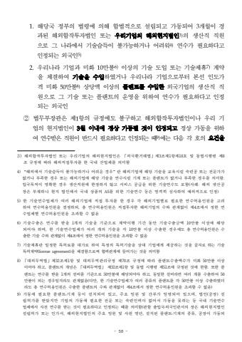 - 58 -1.%ud574%ub2f9%uad6d %uc815%ubd80%uc758 %ubc95%ub839%uc5d0 %uc758%ud574 %ud569%ubc95%uc801%uc73c%ub85c %uc124%ub9bd%ub418%uace0 %uac00%ub3d9%ub418%uc5b4 3%uac1c%uc6d4%uc774 %uacbd%uacfc%ub41c %ud574%uc678%ud569%uc791%ud22c%uc790%ubc95%uc778 %ub610%ub294 %uc6b0%ub9ac%uae30%uc5c5%uc758 %ud574%uc678%ud604%uc9c0%ubc95%uc7783)%uc758 %uc0dd%uc0b0%uc9c1 %uc9c1%uc6d0%uc73c%ub85c %uadf8 %ub098%ub77c%uc5d0%uc11c %uae30%uc220%uc2b5%ub4dd%uc774 %ubd88%uac00%ub2a5%ud558%uac70%ub098 %uc5b4%ub824%uc6cc4)%uc5f0%uc218%uac00 %ud544%uc694%ud558%ub2e4%uace0 %uc778%uc815%ub418%ub294 %uc678%uad6d%uc7785)2.%uc6b0%ub9ac%ub098%ub77c %uae30%uc5c5%uacfc %ubbf8%ud654 10%ub9cc%ubd886)%uc774%uc0c1%uc758 %uae30%uc220 %ub3c4%uc785 %ub610%ub294 %uae30%uc220%uc81c%ud7347)%uacc4%uc57d%uc744 %uccb4%uacb0%ud558%uc5ec %uae30%uc220%uc744 %uc218%uc785%ud558%uc600%uac70%ub098 %uc6b0%ub9ac%ub098%ub77c %uae30%uc5c5%uc73c%ub85c%ubd80%ud130 %ubcf8%uc120 %uc778%ub3c4%uac00%uaca9 %ubbf8%ud654 50%ub9cc%ubd888)%uc0c1%ub2f9%uc561 %uc774%uc0c1%uc758 %ud50c%ub79c%ud2b8%ub97c %uc218%uc785%ud55c%uc678%uad6d%uae30%uc5c5%uc758 %uc0dd%uc0b0%uc9c1 %uc9c1%uc6d0%uc73c%ub85c %uadf8 %uae30%uc220 %ub610%ub294 %ud50c%ub79c%ud2b8%uc758 %uc6b4%uc601%uc744 %uc704%ud558%uc5ec %uc5f0%uc218%uac00 %ud544%uc694%ud558%ub2e4%uace0 %uc778%uc815%ub418%ub294 %uc678%uad6d%uc778%u2461 %ubc95%ubb34%ubd80%uc7a5%uad00%uc740 %uc81c1%ud56d%uc758 %uaddc%uc815%uc5d0%ub3c4 %ubd88%uad6c%ud558%uace0 %ud574%uc678%ud569%uc791%ud22c%uc790%ubc95%uc778%uc774%ub098 %uc6b0%ub9ac %uae30%uc5c5%uc758 %ud604%uc9c0%ubc95%uc778%uc774 3%uc6d4 %uc774%ub0b4%uc5d0 %uc815%uc0c1 %uac00%ub3d9%ub420 %uac83%uc774 %uc778%uc815%ub418%uace0%uc815%uc0c1 %uac00%ub3d9%uc744 %uc704%ud558%uc5ec %uc5f0%uc218%ubc1b%uc740 %uc9c1%uc6d0%uc774 %ubc18%ub4dc%uc2dc %ud544%uc694%ud558%ub2e4%uace0 %uc778%uc815%ub418%ub294 %ub54c9)%uc5d0%ub294 %ub2e4%uc74c %uac01 %ud638%uc758%uc694%uac74%uc744 3)%ud574%uc678%ud569%uc791%ud22c%uc790%ubc95%uc778 %ub610%ub294 %uc6b0%ub9ac%uae30%uc5c5%uc758 %ud574%uc678%ud604%uc9c0%ubc95%uc778%uc740 %u300c%uc678%uad6d%ud658%uac70%ub798%ubc95%u300d%uc81c3%uc870%uc81c1%ud56d%uc81c18%ud638 %ubc0f %ub3d9%ubc95%uc2dc%ud589%ub839 %uc81c8%uc870%uaddc%uc815%uc5d0 %ub530%ub77c %ud574%uc678%uc9c1%uc811%ud22c%uc790%ub97c %ud55c %uad6d%ub0b4 %uc0b0%uc5c5%uccb4%ub97c %uc758%ubbf8%ud5684)%u201c%ud574%uc678%uc5d0%uc11c %uae30%uc220%uc2b5%ub4dd%uc774 %ubd88%uac00%ub2a5%ud558%uac70%ub098 %uc5b4%ub824%uc6b4 %uacbd%uc6b0%u201d%ub780 %ud574%uc678%uae30%uc5c5%uc5d0 %ud574%ub2f9 %uae30%uc220%uc744 %uad50%uc721%uc2dc%ud0ac %uc219%ub828%uacf5 %ub610%ub294 %uc804%ubb38%uac00%uac00 %uc5c6%uac70%ub098 %ubd80%uc871%ud55c %uacbd%uc6b0 %ub610%ub294 %ud574%uc678%uae30%uc5c5%uc5d0 %ud574%ub2f9 %uae30%uc220%uc744 %uc5f0%uc218%uc2dc%ud0ac %uae30%uacc4 %ub610%ub294 %ud50c%ub79c%ud2b8%uac00 %uc5c6%uac70%ub098 %ubd80%uc871%ud55c%uacbd%uc6b0%ub97c %uc758%ubbf8%ud568. %uc785%uad6d%ubaa9%uc801%uc774 %uba85%ud655%ud55c %uacbd%uc6b0 %uc0dd%uc0b0%uc9c1%uc6d0%uc5d0 %ud55c%uc815%ud558%uc9c0 %uc54a%uace0 %uc11c%ube44%uc2a4 %uacf5%uae09%uc744 %uc704%ud55c %uae30%uc220%uc5f0%uc218%ub3c4 %ud3ec%ud568(%uc0ac%ub840: %ud574%uc678 %uc0dd%uc0b0%uacf5%uc7a5%uc740 %ubd80%uc7ac%ud558%ub098 %ud604%uc9c0 %ubc95%uc778%uc5d0%uc11c %uad6d%ub0b4 %uc0c1%ud488%uc758 AS%ub97c %uc704%ud55c %uae30%uc220%uc5f0%uc218 %ub4f1%uc740 %uc5c4%uaca9%ud788 %uc2ec%uc0ac%ud558%uc5ec %uc608%uc678%uc801%uc73c%ub85c %uc778%uc815)5)%ud55c %uae30%uc220%uc5f0%uc218%uc5c5%uccb4%uac00 %uc5ec%ub7ec %ud574%uc678%uae30%uc5c5%uc5d0 %uc9c1%uc811 %ud22c%uc790%ub97c %ud55c %uacbd%uc6b0 %uac01 %ud574%uc678%uae30%uc5c5%ubcc4%ub85c %ud544%uc694%ud55c %uc5f0%uc218%ud5c8%uc6a9%uc778%uc6d0%uc744 %uace0%ub824%ud558%uc5ec %uc5f0%uc218%ud5c8%uc6a9%uc778%uc6d0%uc744 %uacb0%uc815%ud558%ub418, %ucd1d %uc5f0%uc218%ud5c8%uc6a9%uc778%uc6d0%uc740 %uc9c1%uc811%ud22c%uc790%ud55c %ud574%uc678%uae30%uc5c5%uc758 %uc218%uc640 %uad00%uacc4%uc5c6%uc774 %uc81c4%uc870%uc5d0%uc11c%uc815%ud55c %uc5f0%uc218%uc5c5%uccb4%ubcc4 %uc5f0%uc218%ud5c8%uc6a9%uc778%uc6d0%uc744 %ucd08%uacfc%ud560 %uc218 %uc5c6%uc74c6)%uae30%uc220%uc218%ucd9c%uc740 %uc5f0%uc218%ub97c %ubc1b%uc744 1%uac1c%uc758 %uae30%uc220%uc744 %uae30%uc900%uc73c%ub85c %uacc4%uc57d%uc774%ud589 %uae30%uac04 %ub3d9%uc548 %uae30%uc220%uc218%ucd9c%uae08%uc561 10%ub9cc%ubd88 %uc774%uc0c1%uc5d0 %ud574%ub2f9%ub418%uc5b4%uc57c %ud558%uba70, %ud55c %uae30%uc220%uc5f0%uc218%uc5c5%uccb4%uac00 %uc5ec%ub7ec %uac1c%uc758 %uae30%uc220%uc744 %uac01 10%ub9cc%ubd88 %uc774%uc0c1 %uc218%ucd9c%ud55c %uacbd%uc6b0%uc5d0%ub3c4 %ucd1d %uc5f0%uc218%ud5c8%uc6a9%uc778%uc6d0%uc740 %uc218%ucd9c%ud55c %uae30%uc220 %uc218%uc640 %uad00%uacc4%uc5c6%uc774 %uc81c4%uc870%uc5d0%uc11c %uc815%ud55c %uc5f0%uc218%ud5c8%uc6a9%uc778%uc6d0%uc744 %ucd08%uacfc%ud560 %uc218 %uc5c6%uc74c7)%uae30%uc220%uc81c%ud734%ub780 %uc77c%uc815%ud55c %ud2b9%ud5c8%ub8cc%ub97c %ub300%uac00%ub85c %ud558%uc5ec %ud2b9%uc815%uc758 %ud2b9%ud5c8%uae30%uc220%uc744 %uc0c1%ub300 %uae30%uc5c5%uc5d0%uac8c %uc81c%uacf5%ud558%ub294 %uac83%uc744 %uace8%uc790%ub85c %ud558%ub294%uae30%uc220%ud2b9%ud5c8%uacc4%uc57d(license agreement)%uc744 %uccb4%uacb0%ud568%uc73c%ub85c%uc368 %ud611%ub825%uad00%uacc4%uc5d0 %ub4e4%uc5b4%uac00%ub294 %uac83%uc744 %uc758%ubbf8%ud5688)%u300c%ub300%uc678%ubb34%uc5ed%ubc95%u300d%uc81c32%uc870%uc81c1%ud56d %ubc0f %ub300%uc678%ubb34%uc5ed%uad00%ub9ac%uaddc%uc815 %uc81c70%uc870 %uaddc%uc815%uc5d0 %ub530%ub77c %ud50c%ub79c%ud2b8%uc218%ucd9c%uc561%uc218%uac00 %ubbf8%ud654 50%ub9cc%ubd88 %uc774%uc0c1%uc774%uc5b4%uc57c %ud558%uace0, %ud50c%ub79c%ud2b8%uc758 %uac1c%ub150%uc740 %u300c%ub300%uc678%ubb34%uc5ed%ubc95%u300d %uc81c32%uc870%uc81c1%ud56d %ubc0f %ub3d9%ubc95 %uc2dc%ud589%ub839 %uc81c51%uc870%uc5d0 %uaddc%uc815%ub41c %uac83%uc5d0 %ud55c%ud568. %ub610%ud55c %ud50c%ub79c%ud2b8%ub294 %uc5f0%uc218%ub97c %ubc1b%uc744 1%uac1c%uc758 %uc124%ube44%ub97c %uae30%uc900%uc73c%ub85c 50%ub9cc%ubd88%uc5d0 %ud574%ub2f9%ub418%uc5b4%uc57c %ud558%uace0, %ub3d9%uc77c%ud55c %uc124%ube44%ub77c%uba74 %uc5ec%ub7ec %uac1c%ub9