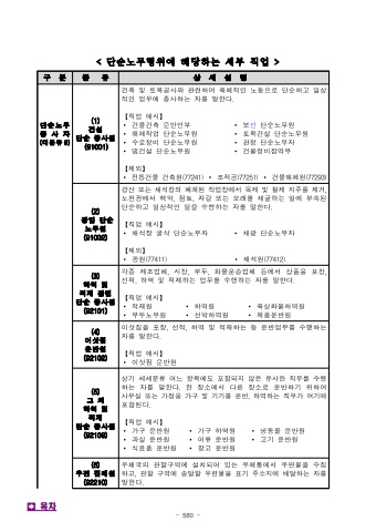 - 580 -<%ub2e8%uc21c%ub178%ubb34%ud589%uc704%uc5d0%ud574%ub2f9%ud558%ub294%uc138%ubd80%uc9c1%uc5c5>%uad6c%ubd84%uc885%ub958%uc0c1%uc138%uc124%uba85%ub2e8%uc21c%ub178%ubb34%uc885 %uc0ac %uc790(%ub300%ubd84%ub9589)(1)%uac74%uc124%ub2e8%uc21c%uc885%uc0ac%uc6d0(91001)%uac74%ucd95%ubc0f%ud1a0%ubaa9%uacf5%uc0ac%uc640%uad00%ub828%ud558%uc5ec%uc721%uccb4%uc801%uc778%ub178%ub3d9%uc73c%ub85c%ub2e8%uc21c%ud558%uace0%uc77c%uc0c1%uc801%uc778%uc5c5%ubb34%uc5d0%uc885%uc0ac%ud558%ub294%uc790%ub97c%ub9d0%ud55c%ub2e4.%u3010%uc9c1%uc5c5%uc608%uc2dc%u3011%u2219%uac74%ubb3c%uac74%ucd95%uc6b4%ubc18%uc778%ubd80%u2219%ubcf4%uc120%ub2e8%uc21c%ub178%ubb34%uc6d0%u2219%ud574%uccb4%uc791%uc5c5%ub2e8%uc21c%ub178%ubb34%uc6d0%u2219%ud1a0%ubaa9%uac74%uc124%ub2e8%uc21c%ub178%ubb34%uc6d0%u2219%uc218%ub85c%uc815%ube44%ub2e8%uc21c%ub178%ubb34%uc6d0%u2219%uad00%uc815%ub2e8%uc21c%ub178%ubb34%uc790%u2219%ub310%uac74%uc124%ub2e8%uc21c%ub178%ubb34%uc6d0%u2219%uac74%ubb3c%uc815%ube44%uc7a1%uc5ed%ubd80%u3010%uc81c%uc678%u3011%u2219%uc804%ud1b5%uac74%ubb3c%uac74%ucd95%uc6d0(77241)%u2219%uc870%uc801%uacf5(77251)%u2219%uac74%ubb3c%ud574%uccb4%uc6d0(77293)(2)%uad11%uc5c5%ub2e8%uc21c%ub178%ubb34%uc6d0(91002)%uad11%uc0b0%ub610%ub294%ucc44%uc11d%uc7a5%uc758%ud3d0%uc1c4%ub41c%uc791%uc5c5%uc7a5%uc5d0%uc11c%ubaa9%uc81c%ubc0f%ucca0%uc81c%uc9c0%uc8fc%ub97c%uc81c%uac70,%ub178%ucc9c%uad11%uc5d0%uc11c%ubc31%uc545,%uc810%ud1a0,%uc790%uac08%ub610%ub294%ubaa8%ub798%ub97c%ucc44%uad74%ud558%ub294%uc77c%uc5d0%ubd80%uc18d%ub41c%ub2e8%uc21c%ud558%uace0%uc77c%uc0c1%uc801%uc778%uc77c%uc744%uc218%ud589%ud558%ub294%uc790%ub97c%ub9d0%ud55c%ub2e4.%u3010%uc9c1%uc5c5%uc608%uc2dc%u3011%u2219%ucc44%uc11d%uc7a5%uad74%uc0ad%ub2e8%uc21c%ub178%ubb34%uc790%u2219%ucc44%uad11%ub2e8%uc21c%ub178%ubb34%uc790%u3010%uc81c%uc678%u3011%u2219%uad11%uc6d0(77411)%u2219%ucc44%uc11d%uc6d0(77412)%ud558%uc5ed%ubc0f%uc801%uc7ac%uad00%ub828%ub2e8%uc21c%uc885%uc0ac%uc6d0(92101)%uc120%uc801,%ud558%uc5ed%ubc0f%uc801%uc7ac%ud558%ub294%uc5c5%ubb34%ub97c%uc218%ud589%ud558%ub294%uc790%ub97c%ub9d0%ud55c%ub2e4.%u3010%uc9c1%uc5c5%uc608%uc2dc%u3011%u2219%uc801%uc7ac%uc6d0%u2219%ud558%uc5ed%uc6d0%u2219%uc721%uc0c1%ud654%ubb3c%ud558%uc5ed%uc6d0%u2219%ubd80%ub450%ub178%ubb34%uc6d0%u2219%uc120%ubc15%ud558%uc5ed%uc6d0%u2219%uc81c%ud488%uc6b4%ubc18%uc6d0(4)%uc774%uc0bf%uc9d0%uc6b4%ubc18%uc6d0(92102)%uc774%uc0bf%uc9d0%uc744%ud3ec%uc7a5,%uc120%uc801,%ud558%uc5ed%ubc0f%uc801%uc7ac%ud558%ub294%ub4f1%uc6b4%ubc18%uc5c5%ubb34%ub97c%uc218%ud589%ud558%ub294%uc790%ub97c%ub9d0%ud55c%ub2e4.%u3010%uc9c1%uc5c5%uc608%uc2dc%u3011%u2219%uc774%uc0bf%uc9d0%uc6b4%ubc18%uc6d0(5)%uadf8%uc678%ud558%uc5ed%ubc0f%uc801%uc7ac%ub2e8%uc21c%uc885%uc0ac%uc6d0(92109)%uc0c1%uae30%uc138%uc138%ubd84%ub958%uc5b4%ub290%ud56d%ubaa9%uc5d0%ub3c4%ud3ec%ud568%ub418%uc9c0%uc54a%uc740%uc720%uc0ac%ud55c%uc9c1%ubb34%ub97c%uc218%ud589%ud558%ub294%uc790%ub97c%ub9d0%ud55c%ub2e4.%ud55c%uc7a5%uc18c%uc5d0%uc11c%ub2e4%ub978%uc7a5%uc18c%ub85c%uc6b4%ubc18%ud558%uae30%uc704%ud558%uc5ec%uc0ac%ubb34%uc2e4%ub610%ub294%uac00%uc815%uc6a9%uac00%uad6c%ubc0f%uae30%uae30%ub97c%uc6b4%ubc18,%ud558%uc5ed%ud558%ub294%uc9c1%ubb34%uac00%uc5ec%uae30%uc5d0%ud3ec%ud568%ub41c%ub2e4.%u3010%uc9c1%uc5c5%uc608%uc2dc%u3011%u2219%uac00%uad6c%uc6b4%ubc18%uc6d0%u2219%uac00%uad6c%ud558%uc5ed%uc6d0%u2219%ub0c9%ub3d9%ubb3c%uc6b4%ubc18%uc6d0%u2219%uacfc%uc2e4%uc6b4%ubc18%uc6d0%u2219%uc5b4%ub958%uc6b4%ubc18%uc6d0%u2219%uace0%uae30%uc6b4%ubc18%uc6d0%u2219%uc2dd%ub8cc%ud488%uc6b4%ubc18%uc6d0%u2219%ucc3d%uace0%uc6b4%ubc18%uc6d0(6)%uc6b0%ud3b8%uc9d1%ubc30%uc6d0(92210)%uc6b0%uccb4%uad6d%uc758%uad00%ud560%uad6c%uc5ed%uc5d0%uc124%uce58%ub418%uc5b4%uc788%ub294%uc6b0%uccb4%ud1b5%uc5d0%uc11c%uc6b0%ud3b8%ubb3c%uc744%uc218%uc9d1%ud558%uace0,%uad00%ud560%uad6c%uc5ed%uc5d0%uc1a1%ub2ec%ud560%uc6b0%ud3b8%ubb3c%uc744%ud45c%uae30%uc8fc%uc18c%uc9c0%uc5d0%ubc30%ub2ec%ud558%ub294%uc790%ub97c%ub9d0%ud55c%ub2e4.%uf000%ubaa9%ucc28