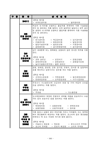 - 583 -%uad6c%ubd84%uc885%ub958%uc0c1%uc138%uc124%uba85(94211)%u3010%uc9c1%uc5c5%uc608%uc2dc%u3011%u2219%uc544%ud30c%ud2b8%uacbd%ube44%uc6d0%u2219%ube4c%ub77c%uacbd%ube44%uc6d0(23)%uac74%ubb3c%uacbd%ube44%uc6d0(94212)%ud559%uad50%uc758%ub0b4%u00b7%uc678%ubd80%ub97c%uc21c%ucc30%ud558%uace0%ucd9c%uc785%uc790%ub97c%ud1b5%uc81c%ud558%uba70%uac01%uc885%uc2dc%uc124%ubb3c%uc744%uc720%uc9c0%ubc0f%uad00%ub9ac%ud558%ub294%uc790%ub97c%ub9d0%ud55c%ub2e4.%ub610%ud55c%uc77c%ubc18%uc801%uc778%ube4c%ub529%uc774%ub098%uc5c5%ubb34%uacf5%uac04%ubc0f%uacf5%uc7a5%uc758%ub0b4%u00b7%uc678%ubd80%ub97c%uc21c%ucc30%ud558%uace0%ucd9c%uc785%uc790%ub97c%ud1b5%uc81c%ud558%uba70%uac01%uc885%uc2dc%uc124%ubb3c%uc744%uc720%uc9c0%ubc0f%uad00%ub9ac%ud55c%ub2e4.%u3010%uc9c1%uc5c5%uc608%uc2dc%u3011%u2219%uccad%uc0ac%uacbd%ube44%uc6d0%u2219%ud559%uad50%uacbd%ube44%uc6d0%u2219%uc0c1%uac00%uacbd%ube44%uc6d0%u2219%uac74%ubb3c%uacbd%ube44%uc6d0%u2219%ubcd1%uc6d0%uacbd%ube44%uc6d0%u2219%ube4c%ub529%uacbd%ube44%uc6d0%u2219%ube4c%ub529%uc2dc%uc124%uacbd%ube44%uc6d0%u2219%ube4c%ub529%ubcf4%uc548%uc6d0%u2219%uc2dc%uc7a5%uacbd%ube44%uc6d0%u2219%uacf5%uc7a5%uacbd%ube44%uc6d0%u2219%uacf5%uc0ac%ud604%uc7a5%uacbd%ube44%uc6d0%u2219%uacf5%uc0ac%uacbd%ube44%uc6d0(24)%uadf8%uc678%uac74%ubb3c%uad00%ub9ac%uc6d0(94219)%uc0c1%uae30%uc138%uc138%ubd84%ub958%uc5b4%ub290%ud56d%ubaa9%uc5d0%ub3c4%ud3ec%ud568%ub418%uc9c0%uc54a%uc740%uc720%uc0ac%ud55c%uc9c1%ubb34%ub97c%uc218%ud589%ud55c%ub2e4.%u3010%uc9c1%uc5c5%uc608%uc2dc%u3011%u2219%uad50%ud68c%uad00%ub9ac%uc778%u2219%uc131%ub2f9%uc9c0%uae30%u2219%uacf5%uc6d0%uc21c%ucc30%uc6d0%u2219%uacf5%uc6d0%uc548%uc804%uc694%uc6d0%u2219%uacf5%uc6d0%uad00%ub9ac%uc778%u2219%uacf5%uc6d0%uc9c8%uc11c%uc694%uc6d0%u2219%ub180%uc774%uc2dc%uc124%uc9c8%uc11c%uc720%uc9c0%uc6d0%u2219%ubcc4%uc7a5%uad00%ub9ac%uc778(25)%uac80%ud45c%uc6d0(94220)%uacf5%uc6d0,%uc601%ud654%uad00,%uacf5%uc5f0%uc7a5,%uc6b4%ub3d9%uacbd%uae30%uc7a5,%uc720%uc6d0%uc9c0,%uc804%uc2dc%uc7a5%ub4f1%uc785%uc7a5%uac1d%uc758%ud45c%ub97c%ud655%uc778%ud558%uace0%uc785%uc7a5%uc2dc%ud0a4%ub294%uc5c5%ubb34%ub97c%ud558%ub294%uc790%ub97c%ub9d0%ud55c%ub2e4.%u3010%uc9c1%uc5c5%uc608%uc2dc%u3011%u2219%uace0%uc18d%ubc84%uc2a4%uac80%ud45c%uc6d0%u2219%uadf9%uc7a5%uac80%ud45c%uc6d0%u2219%ub180%uc774%uacf5%uc6d0%uac80%ud45c%uc6d0%u2219%ud1b5%ud589%ub8cc%uac80%ud45c%uc6d0%u2219%uc2b9%ucc28%uad8c%uac80%ud45c%uc6d0%u2219%uc0ac%uc6b0%ub098%uac80%ud45c%uc6d0(26)%uc8fc%uc720%uc6d0(95310)%uc8fc%uc720%uc18c%ub098%uac00%uc2a4%ucda9%uc804%uc18c%uc5d0%uace0%uc6a9%ub418%uc5b4%uc5f0%ub8cc%ubc0f%uae30%ud0c0%uc790%ub3d9%ucc28%uc18c%ubaa8%ud488%ub4f1%uc744%ud310%ub9e4%ud558%ub294%uc790%ub97c%ub9d0%ud55c%ub2e4.%u3010%uc9c1%uc5c5%uc608%uc2dc%u3011%u2219%uc8fc%uc720%uc6d0%u2219%uac00%uc2a4%ucda9%uc804%uc6d0(27)%ub9e4%uc7a5%uc815%ub9ac%uc6d0(95391)%ub3c4%uc18c%ub9e4%uc5c5%uccb4%uc5d0%uc11c%ub9e4%uc7a5%uc5d0%uc9c4%uc5f4%ub418%uc5b4%ud310%ub9e4%ub420%uc81c%ud488%uc744%uc6b4%uc1a1%ud558%uac70%ub098%uc1fc%ud551%uce74%ud130%ub4f1%uc758%uc6b4%uc1a1%uc218%ub2e8%ub4f1%uc744%uc815%ub9ac%ud558%ub294%uc790%ub97c%ub9d0%ud55c%ub2e4.%u3010%uc9c1%uc5c5%uc608%uc2dc%u3011%u2219%ub9e4%uc7a5%uc815%ub9ac%uc6d0%u2219%uc0c1%ud488%uc6b4%ubc18%uc6d0%u2219%ud310%ub9e4%ubcf4%uc870%uc6d0%u2219%uc0c1%ud488%uc9c4%uc5f4%uc6d0%u2219%uc1fc%ud551%uce74%ud130%uc6b4%ubc18%u2219%uc815%ub9ac%uc6d0(28)%uc804%ub2e8%uc9c0%ubc30%ud3ec%uc6d0%ubc0f%ubcbd%ubcf4%uc6d0(95392)%uac01%uc885%uc810%ud3ec%ub098%uc0c1%ud488%uc758%uad11%uace0%uc804%ub2e8%uc9c0%ub97c%uac70%ub9ac%ub098%uc9c0%ud558%ucca0%uc5ed,%ubc84%uc2a4%uc815%ub958%uc7a5%uc5d0%uc11c%ud589%uc778%ub4e4%uc5d0%uac8c%ubc30%ud3ec%ud558%ub294%uc790%ub97c%ub9d0%ud55c%ub2e4.%ud3ec%uc2a4%ud130%uc640%uac19%uc740%ud64d%ubcf4%ubb3c%uc744%uc804%ubd07%ub300%ub098%ubcbd%ub610%ub294%uc9c0%uc815%ub41c%uac8c%uc2dc%ud310%ub4f1%uc5d0%ubd99%uc778%ub2e4.%u3010%uc9c1%uc5c5%uc608%uc2dc%u3011%u2219%uce74%ub2ec%ub85c%uadf8%ubc30%ud3ec%uc6d0%u2219%ubcbd%ubcf4%uc6d0%u2219%uad11%uace0%uc2a4%ud2f0%ucee4%ubd80%ucc29%uc6d0%u2219%ud3ec%uc2a4%ud130%ubd80%ucc29%uc6d0%u2219%ud64d%ubcf4%uc9c0%ubc30%ud3ec%uc6d0%u2219%uc2a4%ud2f0%ucee4%ubd80%ucc29%uc6d0