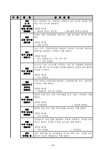 - 584 -%uad6c%ubd84%uc885%ub958%uc0c1%uc138%uc124%uba85(29)%uadf8%uc678%ud310%ub9e4%uad00%ub828%ub2e8%uc21c%uc885%uc0ac%uc6d0(95399)%uc0c1%uae30%uc138%uc138%ubd84%ub958%uc5b4%ub290%ud56d%ubaa9%uc5d0%ub3c4%ud3ec%ud568%ub418%uc9c0%uc54a%uc740%uc720%uc0ac%ud55c%uc9c1%ubb34%ub97c%uc218%ud589%ud558%ub294%uc790%uac00%uc5ec%uae30%uc5d0%ubd84%ub958%ub41c%ub2e4.%u3010%uc9c1%uc5c5%uc608%uc2dc%u3011%u2219%ud734%ub300%ud488%ubcf4%uad00%uc18c%uc811%uc218%uc6d0%u2219%ud5ec%uc2a4%ud074%ub7fd%ud0c8%uc758%uc2e4%ubcf4%uad00%uc6d0(30)%uc0b0%ubd88%uac10%uc2dc%uc6d0(99104)%uc0b0%ubd88%uc758%uc608%ubc29%uc9c4%ud654%uc791%uc5c5%uc5d0%ucc38%uc5ec%ud558%ub294%uc0b0%ubd88%uac10%uc2dc%uc6d0%ub3c4%uc5ec%uae30%uc5d0%ubd84%ub958%ub41c%ub2e4.%u3010%uc9c1%uc5c5%uc608%uc2dc%u3011%u2219%uc0b0%ubd88%uac10%uc2dc%uc6d0(31)%uacc4%uae30%uac80%uce68%uc6d0(99211)%uac00%uc2a4%u2024%uc218%ub3c4%u2024%uc804%ub825%uc0ac%uc6a9%ub7c9%uc744%uac80%uce68%ud558%uae30%uc704%ud558%uc5ec%uc218%uc6a9%uac00%ub97c%ubc29%ubb38%ud558%uc5ec%uacc4%ub7c9%uae30%ub97c%uac80%uce68%ud558%uc5ec%uae30%ub85d%ud558%ub294%uc790%ub97c%ub9d0%ud55c%ub2e4.%u3010%uc9c1%uc5c5%uc608%uc2dc%u3011%u2219%uacc4%uae30%uac80%uce68%uc6d0(%uac00%uc2a4,%uc218%ub3c4,%uc804%uae30%ub4f1)%u2219%uc804%uae30%uc548%uc804%uc810%uac80%uc6d0(32)%uac00%uc2a4%uc810%uac80%uc6d0(99212)%ub3c4%uc2dc%uac00%uc2a4%ub610%ub294LP%uac00%uc2a4%ub97c%uc0ac%uc6a9%ud558%ub294%uac00%uc815%ubc0f%uc0ac%uc5c5%uccb4%ub97c%ubc29%ubb38%ud558%uc5ec%uac00%uc2a4%ub204%ucd9c%uc5ec%ubd80%ub4f1%uac00%uc2a4%uc0ac%uc6a9%uc758%uc548%uc804%uc744%uc810%uac80%ud558%uace0,%uacbd%uc6b0%uc5d0%ub530%ub77c%ud544%uc694%ud55c%uc870%uce58%ub97c%uc694%uad6c%ud55c%ub2e4.%u3010%uc9c1%uc5c5%uc608%uc2dc%u3011%u2219%uac00%uc2a4%uc810%uac80(33)%uc790%ub3d9%ud310%ub9e4%uae30%uad00%ub9ac%uc6d0(99220)%uac01%uc885%ub300%uae08%uc758%uc218%uae08%uc218%uae08%ud558%ub294%uc790%ub97c%ub9d0%ud55c%ub2e4.%u3010%uc9c1%uc5c5%uc608%uc2dc%u3011%u2219%uc790%ub3d9%ud310%ub9e4%uae30%uc720%uc9c0%ubc0f%uc218%uae08%uc6d0(34)%uc8fc%ucc28%uad00%ub9ac%uc6d0(99231)%ucc28%ub7c9%uc758%ubb34%ub8cc%ub610%ub294%uc720%ub8cc%uc8fc%ucc28%uc2dc%uc124%uc744%uc6b4%uc6a9%u2024%uad00%ub9ac%u2024%uc548%ub0b4%ud558%ub294%uc790%ub97c%ub9d0%ud55c%ub2e4.%u3010%uc9c1%uc5c5%uc608%uc2dc%u3011%u2219%uc8fc%ucc28%uad00%ub9ac%uc6d0%u2219%uc8fc%ucc28%uc7a5%uad00%ub9ac%uc6d0(35)%uc8fc%ucc28%uc548%ub0b4%uc6d0(99232)%ucc28%ub7c9%uc758%ubb34%ub8cc%ub610%ub294%uc720%ub8cc%uc8fc%ucc28%uc2dc%uc124%uc744%uc548%ub0b4%ud558%ub294%uc790%ub97c%ub9d0%ud55c%ub2e4.%u3010%uc9c1%uc5c5%uc608%uc2dc%u3011%u2219%uc8fc%ucc28%uc548%ub0b4%uc6d0(36)%uad6c%ub450%ubbf8%ud654%uc6d0(99910)%uc0ac%ubb34%uc2e4%uc774%ub098%uc2dd%ub2f9%ub4f1%uc744%ubc29%ubb38%ud558%uc5ec%uad6c%ub450%ub97c%uc218%uc9d1%ud558%uace0,%uad6c%ub450%ub97c%ub2e6%uc544%uc8fc%uac70%ub098%uad11%ub0b4%uace0%uac04%ub2e8%ud55c%uc218%uc120%uc744%uc2e4%uc2dc%ud558%ub294%uc790%ub97c%ub9d0%ud55c%ub2e4.%u3010%uc9c1%uc5c5%uc608%uc2dc%u3011%u2219%uad6c%ub450%ubbf8%ud654%uc6d0%u2219%uad6c%ub450%ub2e6%uc774(37)%uc138%ud0c1%uc6d0%ubc0f%uc758%ub958,%uc12c%uc720%uc9c1%ubb3c%ubc0f%uc720%uc0ac%ubb3c%ud488%uc744%uc190%uc73c%ub85c%uc138%ud0c1%ub610%ub294%uad6c%uae40%uc744%ud3b4%ub294%uc815%ub3c4%uc758%ub2e8%uc21c%ud55c%ub2e4%ub9bc%uc9c8%ud558%ub294%uc790%ub97c%ub9d0%ud55c%ub2e4.