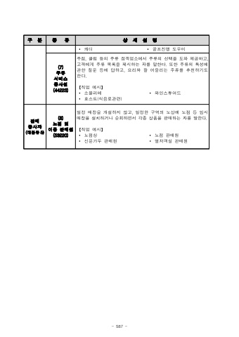 - 587 -%uad6c%ubd84%uc885%ub958%uc0c1%uc138%uc124%uba85%u2219%uce90%ub514%u2219%uace8%ud504%uc9c4%ud589%ub3c4%uc6b0%ubbf8(7)%uc8fc%ub958%uc11c%ube44%uc2a4%uc885%uc0ac%uc6d0(44223)%uc8fc%uc810,%ud074%ub7fd%ub4f1%uc758%uc8fc%ub958%uc811%uac1d%uc5c5%uc18c%uc5d0%uc11c%uc8fc%ub958%uc758%uc120%ud0dd%uc744%ub3c4%uc640%uc81c%uacf5%ud558%uace0,%uace0%uac1d%uc5d0%uac8c%uc8fc%ub958%ubaa9%ub85d%uc744%uc81c%uc2dc%ud558%ub294%uc790%ub97c%ub9d0%ud55c%ub2e4.%ub610%ud55c%uc8fc%ub958%uc758%ud2b9%uc131%uc5d0%uad00%ud55c%uc9c8%ubb38%ub4f1%uc5d0%ub2f5%ud558%uace0,%uc694%ub9ac%uc640%uc798%uc5b4%uc6b8%ub9ac%ub294%uc8fc%ub958%ub97c%ucd94%ucc9c%ud558%uae30%ub3c4%ud55c%ub2e4.%u3010%uc9c1%uc5c5%uc608%uc2dc%u3011%u2219%uc18c%ubbc8%ub9ac%uc5d0%u2219%uc640%uc778%uc2a4%ud29c%uc5b4%ub4dc%u2219%ud638%uc2a4%ud2b8(%uc2dd%uc74c%ub8cc%uad00%ub828)%ud310%ub9e4%uc885%uc0ac%uc790(%ub300%ubd84%ub9585)(8)%ub178%uc810%ubc0f%uc774%ub3d9%ud310%ub9e4%uc6d0(53220)%uc77c%uc815%ub9e4%uc7a5%uc744%uac1c%uc124%ud558%uc9c0%uc54a%uace0,%uc77c%uc815%ud55c%uad6c%uc5ed%uc758%ub178%uc0c1%uc5d0%ub178%uc810%ub4f1%uc784%uc2dc%ub9e4%uc7a5%uc744%uc124%uce58%ud558%uac70%ub098%uc21c%ud68c%ud558%uba74%uc11c%uac01%uc885%uc0c1%ud488%uc744%ud310%ub9e4%ud558%ub294%uc790%ub97c%ub9d0%ud55c%ub2e4.%u3010%uc9c1%uc5c5%uc608%uc2dc%u3011%u2219%ub178%uc810%uc0c1%u2219%ub178%uc810%ud310%ub9e4%uc6d0%u2219%uc2e0%ubb38%uac00%ub450%ud310%ub9e4%uc6d0%u2219%uc5f4%ucc28%uac1d%uc2e4%ud310%ub9e4%uc6d0
