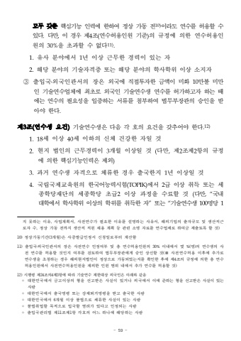 - 59 -%ubaa8%ub450 %uac16%ucd98%ud575%uc2ec%uae30%ub2a5 %uc778%ub825%uc5d0 %ud55c%ud558%uc5ec %uc815%uc0c1 %uac00%ub3d9 %uc80410)%uc774%ub77c%ub3c4 %uc5f0%uc218%ub97c %ud5c8%uc6a9%ud560 %uc218 %uc788%ub2e4.%ub2e4%ub9cc,%uc774 %uacbd%uc6b0 %uc81c4%uc870(%uc5f0%uc218%ud5c8%uc6a9%uc778%uc6d0 %uae30%uc900)%uc758%uaddc%uc815%uc5d0 %uc758%ud55c %uc5f0%uc218%ud5c8%uc6a9%uc778%uc6d0%uc758 30%%uc744 %ucd08%uacfc%ud560 %uc218 %uc5c6%ub2e411).1.%uc720%uc0ac %ubd84%uc57c%uc5d0%uc11c 1%ub144 %uc774%uc0c1 %uadfc%ubb34%ud55c %uacbd%ub825%uc774 %uc788%ub294 %uc7902.%ud574%ub2f9 %ubd84%uc57c%uc758 %uae30%uc220%uc790%uaca9%uc99d %ub610%ub294 %ud574%ub2f9 %ubd84%uc57c%uc758 %ud559%uc0ac%ud559%uc704 %uc774%uc0c1 %uc18c%uc9c0%uc790%u2462 %ucd9c%uc785%uad6d%u2024%uc678%uad6d%uc778%uad00%uc11c%uc758 %uc7a5%uc740 %uc678%uad6d%uc5d0 %uc9c1%uc811%ud22c%uc790%ud55c %uae08%uc561%uc774 %ubbf8%ud654 10%ub9cc%ubd88 %ubbf8%ub9cc%uc778 %uae30%uc220%uc5f0%uc218%uc5c5%uccb4%uc5d0 %ucd5c%ucd08%ub85c %uc678%uad6d%uc778 %uae30%uc220%uc5f0%uc218%uc0dd %uc5f0%uc218%ub97c %ud5c8%uac00%ud558%uace0%uc790 %ud558%ub294 %ub54c%uc5d0%ub294 %uc5f0%uc218%uc758 %ud544%uc694%uc131%uc744 %uc785%uc99d%ud558%ub294 %uc11c%ub958%ub97c %ucca8%ubd80%ud558%uc5ec %ubc95%ubb34%ubd80%uc7a5%uad00%uc758%uc2b9%uc778%uc744 %ubc1b%uc544%uc57c %ud55c%ub2e4.%uc81c3%uc870(%uc5f0%uc218%uc0dd %uc694%uac74)%uae30%uc220%uc5f0%uc218%uc0dd%uc740 %ub2e4%uc74c %uac01 %ud638%uc758 %uc694%uac74%uc744 %uac16%ucd94%uc5b4%uc57c %ud55c%ub2e4.12)1.18%uc138 %uc774%uc0c1 40%uc138 %uc774%ud558%uc758 %uc2e0%uccb4 %uac74%uac15%ud55c %uc790%uc77c %uac832.%ud604%uc9c0 %ubc95%uc778%uc758 %uadfc%ubb34%uacbd%ub825%uc774 3%uac1c%uc6d4 %uc774%uc0c1%uc77c %uac83 (%ub2e4%ub9cc,%uc81c2%uc870%uc81c2%ud56d%uc758 %uaddc%uc815%uc5d0%uc758%ud55c %ud575%uc2ec%uae30%ub2a5%uc778%ub825%uc740 %uc81c%uc678)3.%uacfc%uac70 %uc5f0%uc218%uc0dd %uc790%uaca9%uc73c%ub85c %uccb4%ub958%ud55c %uacbd%uc6b0 %ucd9c%uad6d%ud55c%uc9c0 1%ub144 %uc774%uc0c1%uc77c %uac83 4.%uad6d%ub9bd%uad6d%uc81c%uad50%uc721%uc6d0%uc758%ud55c%uad6d%uc5b4%ub2a5%ub825%uc2dc%ud5d8(TOPIK)%uc5d0%uc11c 2%uae09 %uc774%uc0c1 %ucde8%ub4dd%ub610%ub294 %uc138%uc885%ud559%ub2f9%uc7ac%ub2e8%uc758 %uc138%uc885%ud559%ub2f9 %ucd08%uae092%uc774%uc0c1 %uacfc%uc815%uc744 %uc218%ub8cc%ud560 %uac83(%ub2e4%ub9cc,%u201c%uad6d%ub0b4 %ub300%ud559%uc5d0%uc11c %ud559%uc0ac%ud559%uc704 %uc774%uc0c1%uc758 %ud559%uc704%ub97c%ucde8%ub4dd%ud55c %uc790%u201d%ub610%ub294%u201c%uae30%uc220%uc5f0%uc218%uc0dd 100%uba85%ub2f91%uc9c0 %ubabb%ud558%ub294 %uc774%uc720, %uc0ac%uc5c5%uacc4%ud68d%uc11c, %uc0ac%uc804%uc5f0%uc218%uac00 %ud544%uc694%ud55c %uc774%uc720%ub97c %uc124%uba85%ud558%ub294 %uc0ac%uc720%uc11c, %ud574%uc678%uae30%uc5c5%uc758 %ucd9c%uc790%uaddc%ubaa8 %ubc0f %uc0dd%uc0b0%uc9c1%uadfc%ub85c%uc790 %uc218,%uc815%uc0c1 %uac00%ub3d9 %uc804%uae4c%uc9c0 %uc0dd%uc0b0%uc9c1 %uc9c1%uc6d0 %ucc44%uc6a9 %uacc4%ud68d %ub4f1 %uad00%ub828 %uc18c%uba85 %uc790%ub8cc%ub97c %uc5f0%uc218%uc5c5%uccb4%ub85c %ud558%uc5ec%uae08 %uc81c%ucd9c%ud1a0%ub85d %ud560 %uac83)10)%uc815%uc0c1%uac00%ub3d9%uae30%uac04(3%uac1c%uc6d4)%uc740 %uc0ac%uc99d%ubc1c%uae09%uc778%uc815%uc11c %uc2e0%uccad%uc77c%ub85c%ubd80%ud130 %uacc4%uc0b0%ud56811)%ucd9c%uc785%uad6d%u2024%uc678%uad6d%uc778%uad00%uc11c%uc758 %uc7a5%uc740 %uc0ac%uc804%uc5f0%uc218 %uc778%uc815%uc5ec%ubd80 %ubc0f %ucd1d %uc5f0%uc218%ud5c8%uc6a9%uc778%uc6d0%uc758 30% %uc774%ub0b4%uc5d0%uc11c %uba87 %(%uba85)%uc758 %uc5f0%uc218%uc0dd%uc758 %uc0ac%uc804 %uc5f0%uc218%ub97c %ud5c8%uc6a9%ud560 %uac83%uc778%uc9c0 %uc5ec%ubd80%ub97c %uac80%ud1a0%ud558%uc5ec %ubc95%ubb34%ubd80%uc7a5%uad00%uc5d0%uac8c %uc2b9%uc778 %uc0c1%uc2e0%ud560 %uac83(%u203b %uc0ac%uc804%uc5f0%uc218%ud5c8%uc6a9 %uc774%ud6c4%uc5d0 %ucd94%uac00%ub85c %uc5f0%uc218%uc0dd%uc744 %ucd08%uccad%ud558%ub294 %uacbd%uc6b0 %ud574%uc678%ud604%uc9c0%ubc95%uc778%uc774 %uc815%uc0c1%uc73c%ub85c %uac00%ub3d9%ub418%uc5c8%ub294%uc9c0%ub97c %ud655%uc778%ud55c %ud6c4%uc5d0 %uc81c4%uc870%uc758 %uaddc%uc815%uc5d0 %uc758%ud55c %ucd1d %uc5f0%uc218%ud5c8%uc6a9%uc778%uc6d0%uc5d0%uc11c %uc0ac%uc804%uc5f0%uc218%ud5c8%uc6a9%uc778%uc6d0%uc744 %uc81c%uc678%ud55c %uc778%uc6d0 %ubc94%uc704 %ub0b4%uc5d0%uc11c %ucd94%uac00 %uc5f0%uc218%ub97c %ud5c8%uc6a9%ud560 %uac83)12)%uc2dc%ud589%ub839 %uc81c24%uc870%uc7584%uc81c3%ud56d%uc5d0 %ub530%ub77c %uae30%uc220%uc5f0%uc218 %uc81c%ud55c%ub300%uc0c1 %uc678%uad6d%uc778%uc740 %uc544%ub798%uc640 %uac19%uc74c%u25e6 %ub300%ud55c%ubbfc%uad6d%uc5d0%uc11c %uae08%uace0%uc774%uc0c1%uc758 %ud615%uc744 %uc120%uace0%ubc1b%uc740 %uc0ac%uc2e4%uc774 %uc788%uac70%ub098 %uc678%uad6d%uc5d0%uc11c%uc774%uc5d0 %uc900%ud558%ub294 %ud615%uc744 %uc120%uace0%ubc1b%uc740 %uc0ac%uc2e4%uc774 %uc788%ub294 %uc0ac%ub78c%u25e6 %ub300%ud55c%ubbfc%uad6d%uc5d0%uc11c %ucd9c%uad6d%uba85%ub839 %ub610%ub294 %uac15%uc81c%ud1f4%uac70%uba85%ub839%uc744 %ubc1b%uace0 %ucd9c%uad6d%ud55c %uc0ac%ub78c%u25e6 %ub300%ud55c%ubbfc%uad6d%uc5d0%uc11c 6%uac1c%uc6d4 %uc774%uc0c1 %ubd88%ubc95%uc73c%ub85c %uccb4%ub958%ud55c %uc0ac%uc2e4%uc774 %uc788%ub294 %uc0ac%ub78c%u25e6 %ubd88%ubc95%ucde8%uc5c5%ud560 %ubaa9%uc801%uc73c%ub85c %uc785%uad6d%ud560 %uc5fc%ub824%uac00 %uc788%ub2e4%uace0 %uc778%uc815%ub418%ub294 %uc0ac%ub78c%u25e6 %ucd9c%uc785%uad6d%uad00%ub9ac%ubc95 %uc81c11%uc870%uc81c1%ud56d %uac01%ud638%uc758 %uc5b4%ub290 %ud558%ub098%uc5d0 %ud574%ub2f9%ud558%ub294 %uc0ac%ub78c