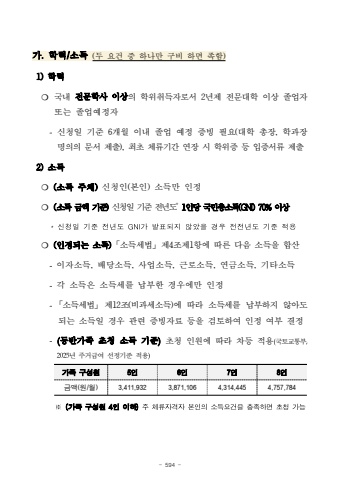 - 594 -%uac00. %ud559%ub825/%uc18c%ub4dd (%ub450 %uc694%uac74 %uc911 %ud558%ub098%ub9cc %uad6c%ube44 %ud558%uba74 %uc871%ud568)1) %ud559%ub825%u274d %uad6d%ub0b4 %uc804%ubb38%ud559%uc0ac %uc774%uc0c1%uc758 %ud559%uc704%ucde8%ub4dd%uc790%ub85c%uc11c 2%ub144%uc81c %uc804%ubb38%ub300%ud559 %uc774%uc0c1 %uc878%uc5c5%uc790%ub610%ub294 %uc878%uc5c5%uc608%uc815%uc790-%uc2e0%uccad%uc77c %uae30%uc900 6%uac1c%uc6d4 %uc774%ub0b4 %uc878%uc5c5 %uc608%uc815 %uc99d%ube59 %ud544%uc694(%ub300%ud559 %ucd1d%uc7a5, %ud559%uacfc%uc7a5%uba85%uc758%uc758 %ubb38%uc11c %uc81c%ucd9c), %ucd5c%ucd08 %uccb4%ub958%uae30%uac04 %uc5f0%uc7a5 %uc2dc %ud559%uc704%uc99d %ub4f1 %uc785%uc99d%uc11c%ub958 %uc81c%ucd9c2) %uc18c%ub4dd%u274d (%uc18c%ub4dd %uc8fc%uccb4)%uc2e0%uccad%uc778(%ubcf8%uc778) %uc18c%ub4dd%ub9cc %uc778%uc815%u274d (%uc18c%ub4dd %uae08%uc561 %uae30%uc900)%uc2e0%uccad%uc77c %uae30%uc900 %uc804%ub144%ub3c4*1%uc778%ub2f9 %uad6d%ubbfc%ucd1d%uc18c%ub4dd(GNI) 70% %uc774%uc0c1*%uc2e0%uccad%uc77c%uae30%uc900%uc804%ub144%ub3c4GNI%uac00%ubc1c%ud45c%ub418%uc9c0%uc54a%uc558%uc744%uacbd%uc6b0%uc804%uc804%ub144%ub3c4%uae30%uc900%uc801%uc6a9%u274d (%uc778%uc815%ub418%ub294 %uc18c%ub4dd)%u300c%uc18c%ub4dd%uc138%ubc95%u300d%uc81c4%uc870%uc81c1%ud56d%uc5d0 %ub530%ub978 %ub2e4%uc74c %uc18c%ub4dd%uc744 %ud569%uc0b0-%uc774%uc790%uc18c%ub4dd, %ubc30%ub2f9%uc18c%ub4dd, %uc0ac%uc5c5%uc18c%ub4dd, %uadfc%ub85c%uc18c%ub4dd, %uc5f0%uae08%uc18c%ub4dd, %uae30%ud0c0%uc18c%ub4dd-%uac01 %uc18c%ub4dd%uc740 %uc18c%ub4dd%uc138%ub97c %ub0a9%ubd80%ud55c %uacbd%uc6b0%uc5d0%ub9cc %uc778%uc815-%u300c%uc18c%ub4dd%uc138%ubc95%u300d%uc81c12%uc870(%ube44%uacfc%uc138%uc18c%ub4dd)%uc5d0 %ub530%ub77c %uc18c%ub4dd%uc138%ub97c %ub0a9%ubd80%ud558%uc9c0 %uc54a%uc544%ub3c4%ub418%ub294 %uc18c%ub4dd%uc77c %uacbd%uc6b0 %uad00%ub828 %uc99d%ube59%uc790%ub8cc %ub4f1%uc744 %uac80%ud1a0%ud558%uc5ec %uc778%uc815 %uc5ec%ubd80 %uacb0%uc815-(%ub3d9%ubc18%uac00%uc871 %ucd08%uccad %uc18c%ub4dd %uae30%uc900)%ucd08%uccad %uc778%uc6d0%uc5d0 %ub530%ub77c %ucc28%ub4f1 %uc801%uc6a9(%uad6d%ud1a0%uad50%ud1b5%ubd80,2025%ub144 %uc8fc%uac70%uae09%uc5ec %uc120%uc815%uae30%uc900 %uc801%uc6a9)%uac00%uc871 %uad6c%uc131%uc6d0 5%uc7786%uc7787%uc7788%uc778%uae08%uc561(%uc6d0/%uc6d4)3,411,9323,871,1064,314,4454,757,784%u203b(%uac00%uc871%uad6c%uc131%uc6d04%uc778%uc774%ud558)%uc8fc%uccb4%ub958%uc790%uaca9%uc790%ubcf8%uc778%uc758%uc18c%ub4dd%uc694%uac74%uc744%ucda9%uc871%ud558%uba74%ucd08%uccad%uac00%ub2a5