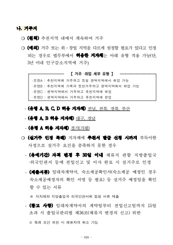 - 595 -%ub098. %uac70%uc8fc%uc9c0%u274d (%uc6d0%uce59)%ucd94%ucc9c%uc9c0%uc5ed%ub0b4%uc5d0%uc11c %uacc4%uc18d%ud558%uc5ec %uac70%uc8fc%u274d (%uc608%uc678)%uac70%uc8fc %ub610%ub294 %ucde8%u00b7%ucc3d%uc5c5 %uc9c0%uc5ed%uc744 %ub2e4%ub974%uac8c %uc124%uc815%ud560 %ud544%uc694%uac00 %uc788%ub2e4%uace0 %uc778%uc815%ub418%ub294%uacbd%uc6b0%ub85c %ubc95%ubb34%ubd80%uc5d0%uc11c %ud5c8%uc6a9%ud55c %uc9c0%uc790%uccb4%ub294 %uc544%ub798 %uc720%ud615 %uc801%uc6a9 %uac00%ub2a5(%ub2e8, 3%ub144%uc774%ub0b4 %uc778%uad6c%uac10%uc18c%uc9c0%uc5ed%uc5d0 %uac70%uc8fc)%u3010 %uac70%uc8fc %u2027%ucde8%uc5c5 %uc138%ubd80 %uc720%ud615 %u3011%u2027%uc720%ud615A:%ucd94%ucc9c%uc9c0%uc5ed%uc5d0%uac70%uc8fc%ud558%uace0%ub3d9%uc77c%uad11%uc5ed%uc9c0%uc5ed%uc5d0%uc11c%ucde8%uc5c5%uac00%ub2a5%u2027%uc720%ud615B:%ucd94%ucc9c%uc9c0%uc5ed%uc5d0%uac00%uc871%uacfc%ub3d9%ubc18%uac70%uc8fc%ud558%uace0%uad11%uc5ed%uc9c0%uc5ed%uc5d0%uc11c%ucde8%uc5c5%uac00%ub2a5%u2027%uc720%ud615C:%uad11%uc5ed%uc9c0%uc5ed%uc5d0%uc11c%uac70%uc8fc%ud558%uace0%ucd94%ucc9c%uc9c0%uc5ed%uc5d0%ucde8%uc5c5%u2027%uc720%ud615D:%uad11%uc5ed%uc9c0%uc5ed%uc5d0%uc11c%uac70%uc8fc%ud558%uace0%ucd94%ucc9c%uc9c0%uc5ed%uc5d0%ucc3d%uc5c5-(%uc720%ud615 A, B, C, D %ud5c8%uc6a9 %uc9c0%uc790%uccb4)%uc804%ub0a8, %uc804%ubd81, %uacbd%ubd81, %ubd80%uc0b0-(%uc720%ud615 A, B %ud5c8%uc6a9 %uc9c0%uc790%uccb4)%ub300%uad6c, %uacbd%ub0a8-(%uc720%ud615 A %ud5c8%uc6a9 %uc9c0%uc790%uccb4)%uacbd%uae30(%uac00%ud3c9)%u274d (%uc2e4%uac70%uc8fc %uc778%uc815 %ud2b9%ub840)%uc9c0%uc790%uccb4%uc5d0 %ucd94%ucc9c%uc11c %ubc1c%uae09 %uc2e0%uccad %uc2dc%uae4c%uc9c0%ubd80%ub4dd%uc774%ud55c%uc0ac%uc815%uc73c%ub85c %uc2e4%uac70%uc8fc %uc694%uac74%uc744 %ucda9%uc871%ud558%uc9c0 %ubabb%ud55c %uacbd%uc6b0-(%uc720%uc608%uae30%uac04)%uc790%uaca9 %ubcc0%uacbd %ud6c4 30%uc77c %uc774%ub0b4%uccb4%ub958%uc9c0 %uad00%ud560 %uc9c0%ubc29%ucd9c%uc785%uad6d%u2027%uc678%uad6d%uc778%uad00%uc11c %ub4f1%uc5d0 %uc804%uc785%uc2e0%uace0 %ubc0f %uc774%uc0ac %uc644%ub8cc %uc2dc %uc2e4%uac70%uc8fc%ub85c %uc778%uc815-(%uc81c%ucd9c%uc11c%ub958)%uc784%ub300%ucc28%uacc4%uc57d%uc11c, %uc219%uc18c%uc81c%uacf5%ud655%uc778%uc11c(%uc219%uc18c%uc81c%uacf5 %uc608%uc815%uc778 %uacbd%uc6b0%uc219%uc18c%uc81c%uacf5%uc608%uc815%uc790%uc758 %ud655%uc778 %uc11c%uba85 %ub4f1 %ud544%uc694) %ub4f1 %uc2e4%uac70%uc8fc %uc608%uc815%uc784%uc744 %ud655%uc778%ud560 %uc218 %uc788%ub294 %uc11c%ub958%u203b%uc9c0%uc790%uccb4%uc640%uc9c0%ubc29%ucd9c%uc785%uad6d%u2027%uc678%uad6d%uc778%uad00%uc11c%uc5d0%ub3d9%uc77c%uc11c%ub958%uc81c%ucd9c-(%ucc38%uace0 %uc0ac%ud56d)%uc784%ub300%ucc28%uacc4%uc57d%uc11c%uc758 %uacc4%uc57d%uc77c%ubd80%ud130 %uc804%uc785%uc2e0%uace0%uc77c%uae4c%uc9c0 15%uc77c %ucd08%uacfc %uc2dc %ucd9c%uc785%uad6d%uad00%ub9ac%ubc95 %uc81c36%uc870(%uccb4%ub958%uc9c0 %ubcc0%uacbd%uc758 %uc2e0%uace0) %uc704%ubc18%u203b%ud2b9%ub840%uc870%uac74%uc704%ubc18%uc2dc%uccb4%ub958%uc790%uaca9%ucde8%uc18c%uac00%ub2a5
