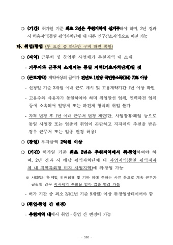 - 596 -%u274d (%uae30%uac04)%ud5c8%uac00%uc77c %uae30%uc900 %ucd5c%ucd08 2%ub144%uc740 %ucd94%ucc9c%uc9c0%uc5ed%uc5d0 %uc2e4%uac70%uc8fc%ud574%uc57c %ud558%uba70, 2%ub144 %uacbd%uacfc %uc2dc %ud5c8%uc6a9%uc9c0%uc5ed(%ub3d9%uc77c %uad11%uc5ed%uc790%uce58%ub2e8%uccb4 %ub0b4 %ub2e4%ub978 %uc778%uad6c%uac10%uc18c%uc9c0%uc5ed)%uc73c%ub85c %uc774%uc804 %uac00%ub2a5%ub2e4. %ucde8%uc5c5/%ucc3d%uc5c5 (%ub450 %uc694%uac74 %uc911 %ud558%ub098%ub9cc %uad6c%ube44 %ud558%uba74 %uc871%ud568)%u274d (%uc9c0%uc5ed) %uadfc%ubb34%ucc98 %ubc0f %ucc3d%uc5c5%ud55c %uc0ac%uc5c5%uccb4%uac00 %ucd94%ucc9c%uc9c0%uc5ed %ub0b4 %uc18c%uc7ac-%uac70%uc8fc%uc9c0%uc640 %uadfc%ubb34%ucc98 %uc18c%uc7ac%uc9c0%ub294 %ub3d9%uc77c %uc9c0%uc5ed(%uae30%ucd08%uc790%uce58%ub2e8%uccb4)%uc77c %uac83%u274d (%uadfc%ub85c%uacc4%uc57d)%uacc4%uc57d%uc11c%uc0c1%uc758 %uae09%uc5ec%uac00 %uc804%ub144%ub3c4 1%uc778%ub2f9 %uad6d%ubbfc%ucd1d%uc18c%ub4dd(GNI) 70% %uc774%uc0c1-%uc2e0%uccad%uc77c %uae30%uc900 3%uac1c%uc6d4 %uc774%ub0b4 %uadfc%ub85c %uac1c%uc2dc %ubc0f %uace0%uc6a9%uacc4%uc57d%uae30%uac04 1%ub144 %uc774%uc0c1 %ud655%uc778-%uace0%uc6a9%uc8fc%uc640 %uc0ac%uc6a9%uc790%uac00 %ub3d9%uc77c%ud558%uc5ec%uc57c %ud558%uba70 %ucde8%uc5c5%uc54c%uc120 %uc5c5%uccb4, %uc778%ub825%ud30c%uacac %uc5c5%uccb4%ub4f1%uc5d0 %uc18c%uc18d%ub418%uc5b4 %uc77c%ub2f9%uc81c %ub610%ub294 %ud30c%uacac%uc81c %ud615%uc2dd%uc758 %ucde8%uc5c5 %ubd88%uac00-%uc790%uaca9 %ubcc0%uacbd %ud6c4 1%ub144 %uc774%ub0b4 %uadfc%ubb34%ucc98 %ubcc0%uacbd %uc81c%ud55c(%ub2e8, %uc0ac%uc5c5%uc7a5%ud734%u2027%ud3d0%uc5c5 %ub4f1%uc73c%ub85c%ub3d9%uc77c %uc0ac%uc5c5%uc7a5 %ub610%ub294 %uc5c5%uc885%uc5d0 %ucde8%uc5c5%uc774 %uace4%ub780%ud558%uace0 %uc9c0%uc790%uccb4%uc758 %ucd94%ucc9c%uc744 %ubc1b%uc740%uacbd%uc6b0 %uadfc%ubb34%ucc98 %ub610%ub294 %uc5c5%uc885 %ubcc0%uacbd %ud5c8%uc6a9)%u274d (%ucc3d%uc5c5)%ud22c%uc790%uae08%uc561 2%uc5b5%uc6d0 %uc774%uc0c1%u274d (%uae30%uac04)%ud5c8%uac00%uc77c %uae30%uc900 %ucd5c%ucd08 2%ub144%uc740 %ucd94%ucc9c%uc9c0%uc5ed%uc5d0%uc11c %ucde8%u2027%ucc3d%uc5c5%ud558%uc5ec%uc57c %ud558%uba70, 2%ub144 %uacbd%uacfc %uc2dc %ud574%ub2f9 %uad11%uc5ed%uc790%uce58%ub2e8%uccb4 %ub0b4 %uc0ac%uc5c5%uc9c0%uc5ed(%ub3d9%uc77c %uad11%uc5ed%uc9c0%uc790%uccb4 %ub0b4 %uc9c0%uc5ed%ud2b9%ud654%ud615 %ube44%uc790 %uc0ac%uc5c5%uc9c0%uc5ed)%uc5d0 %ucde8%u2027%ucc3d%uc5c5 %uac00%ub2a5%u203b%uc0ac%uc5c5%uc7a5%uc758%ud734%u2027%ud3d0%uc5c5,%uc778%uad8c%uce68%ud574%ubc0f%uae30%ud0c0%uc774%uc5d0%uc900%ud558%ub294%uc0ac%uc720%ub4f1%uc73c%ub85c%uacc4%uc18d%uadfc%ubb34%uac00%uace4%ub780%ud55c%uacbd%uc6b0%uc9c0%uc790%uccb4%uc758%ucd94%ucc9c%uc744%ubc1b%uc544%uc5c5%uc885%ubcc0%uacbd%uac00%ub2a5-%ud5c8%uac00 %uae30%uac04 %uc911 %ucd5c%uc18c 3/4(1%ub144 %uae30%uc900 9%uac1c%uc6d4) %uc774%uc0c1 %ucde8%u2027%ucc3d%uc5c5%uc0c1%ud0dc%uc774%uc5b4%uc57c %ud568m (%ucde8%uc5c5%u2027%ucc3d%uc5c5 %uac04 %ubcc0%uacbd) -%ucd94%ucc9c%uc9c0%uc5ed %ub0b4%uc5d0%uc11c %ucde8%uc5c5%u00b7%ucc3d%uc5c5 %uac04 %ubcc0%uacbd%uc774 %uac00%ub2a5