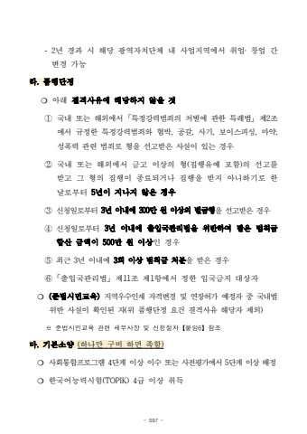 - 597 --2%ub144 %uacbd%uacfc %uc2dc %ud574%ub2f9 %uad11%uc5ed%uc790%uce58%ub2e8%uccb4 %ub0b4 %uc0ac%uc5c5%uc9c0%uc5ed%uc5d0%uc11c %ucde8%uc5c5%u2027 %ucc3d%uc5c5 %uac04%ubcc0%uacbd %uac00%ub2a5%ub77c. %ud488%ud589%ub2e8%uc815%u274d %uc544%ub798 %uacb0%uaca9%uc0ac%uc720%uc5d0 %ud574%ub2f9%ud558%uc9c0 %uc54a%uc744 %uac83%u2460 %uad6d%ub0b4 %ub610%ub294 %ud574%uc678%uc5d0%uc11c %u300c%ud2b9%uc815%uac15%ub825%ubc94%uc8c4%uc758 %ucc98%ubc8c%uc5d0 %uad00%ud55c %ud2b9%ub840%ubc95%u300d %uc81c2%uc870%uc5d0%uc11c%uaddc%uc815%ud55c %ud2b9%uc815%uac15%ub825%ubc94%uc8c4%uc640 %ud611%ubc15, %uacf5%uac08, %uc0ac%uae30, %ubcf4%uc774%uc2a4%ud53c%uc2f1, %ub9c8%uc57d, %uc131%ud3ed%ub825 %uad00%ub828 %ubc94%uc8c4%ub85c %ud615%uc744 %uc120%uace0%ubc1b%uc740 %uc0ac%uc2e4%uc774 %uc788%ub294 %uacbd%uc6b0%u2461 %uad6d%ub0b4 %ub610%ub294 %ud574%uc678%uc5d0%uc11c %uae08%uace0 %uc774%uc0c1%uc758 %ud615(%uc9d1%ud589%uc720%uc608 %ud3ec%ud568)%uc758 %uc120%uace0%ub97c %ubc1b%uace0%uadf8 %ud615%uc758 %uc9d1%ud589%uc774 %uc885%ub8cc%ub418%uac70%ub098 %uc9d1%ud589%uc744 %ubc1b%uc9c0 %uc544%ub2c8%ud558%uae30%ub85c %ud55c %ub0a0%ub85c%ubd80%ud1305%ub144%uc774 %uc9c0%ub098%uc9c0 %uc54a%uc740 %uacbd%uc6b0%u2462 %uc2e0%uccad%uc77c%ub85c%ubd80%ud130 3%ub144 %uc774%ub0b4%uc5d0 300%ub9cc %uc6d0 %uc774%uc0c1%uc758 %ubc8c%uae08%ud615%uc744 %uc120%uace0%ubc1b%uc740 %uacbd%uc6b0%u2463 %uc2e0%uccad%uc77c%ub85c%ubd80%ud130 3%ub144 %uc774%ub0b4%uc5d0 %ucd9c%uc785%uad6d%uad00%ub9ac%ubc95%uc744 %uc704%ubc18%ud558%uc5ec %ubc1b%uc740 %ubc94%uce59%uae08 %ud569%uc0b0 %uae08%uc561%uc774 500%ub9cc %uc6d0 %uc774%uc0c1%uc778 %uacbd%uc6b0%u2464%ucd5c%uadfc 3%ub144 %uc774%ub0b4%uc5d0 3%ud68c %uc774%uc0c1 %ubc94%uce59%uae08 %ucc98%ubd84%uc744 %ubc1b%uc740 %uacbd%uc6b0%u2465 %u300c%ucd9c%uc785%uad6d%uad00%ub9ac%ubc95%u300d%uc81c11%uc870 %uc81c1%ud56d%uc5d0%uc11c %uc815%ud55c %uc785%uad6d%uae08%uc9c0 %ub300%uc0c1%uc790%u274d (%uc900%ubc95%uc2dc%ubbfc%uad50%uc721)%uc9c0%uc5ed%uc6b0%uc218%uc778%uc7ac %uc790%uaca9%ubcc0%uacbd %ubc0f %uc5f0%uc7a5%ud5c8%uac00 %uc608%uc815%uc790 %uc911 %uad6d%ub0b4%ubc95%uc704%ubc18 %uc0ac%uc2e4%uc774 %ud655%uc778%ub41c %uc790(%uc704 %ud488%ud589%ub2e8%uc815 %uc694%uac74 %uacb0%uaca9%uc0ac%uc720 %ud574%ub2f9%uc790 %uc81c%uc678)%u203b%uc900%ubc95%uc2dc%ubbfc%uad50%uc721%uad00%ub828%uc138%ubd80%uc0ac%ud56d%ubc0f%uc2e0%uccad%uc808%ucc28%u3010%ubd99%uc7846%u3011%ucc38%uc870%ub9c8. %uae30%ubcf8%uc18c%uc591 (%ud558%ub098%ub9cc %uad6c%ube44 %ud558%uba74 %uc871%ud568)%u274d%uc0ac%ud68c%ud1b5%ud569%ud504%ub85c%uadf8%ub7a8 4%ub2e8%uacc4 %uc774%uc0c1 %uc774%uc218 %ub610%ub294 %uc0ac%uc804%ud3c9%uac00%uc5d0%uc11c 5%ub2e8%uacc4 %uc774%uc0c1 %ubc30%uc815%u274d %ud55c%uad6d%uc5b4%ub2a5%ub825%uc2dc%ud5d8(TOPIK) 4%uae09 %uc774%uc0c1 %ucde8%ub4dd