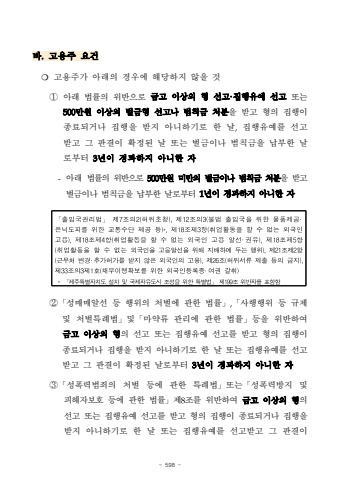 - 598 -%ubc14. %uace0%uc6a9%uc8fc %uc694%uac74%u274d %uace0%uc6a9%uc8fc%uac00 %uc544%ub798%uc758 %uacbd%uc6b0%uc5d0 %ud574%ub2f9%ud558%uc9c0 %uc54a%uc744 %uac83%u2460 %uc544%ub798 %ubc95%ub960%uc758 %uc704%ubc18%uc73c%ub85c %uae08%uace0 %uc774%uc0c1%uc758 %ud615 %uc120%uace0%u00b7%uc9d1%ud589%uc720%uc608 %uc120%uace0%ub610%ub294500%ub9cc%uc6d0 %uc774%uc0c1%uc758 %ubc8c%uae08%ud615 %uc120%uace0%ub098 %ubc94%uce59%uae08 %ucc98%ubd84%uc744 %ubc1b%uace0 %ud615%uc758 %uc9d1%ud589%uc774%uc885%ub8cc%ub418%uac70%ub098 %uc9d1%ud589%uc744 %ubc1b%uc9c0 %uc544%ub2c8%ud558%uae30%ub85c %ud55c %ub0a0,%uc9d1%ud589%uc720%uc608%ub97c %uc120%uace0%ubc1b%uace0 %uadf8 %ud310%uacb0%uc774 %ud655%uc815%ub41c %ub0a0 %ub610%ub294 %ubc8c%uae08%uc774%ub098 %ubc94%uce59%uae08%uc744 %ub0a9%ubd80%ud55c %ub0a0%ub85c%ubd80%ud130 3%ub144%uc774 %uacbd%uacfc%ud558%uc9c0 %uc544%ub2c8%ud55c %uc790-%uc544%ub798 %ubc95%ub960%uc758 %uc704%ubc18%uc73c%ub85c 500%ub9cc%uc6d0 %ubbf8%ub9cc%uc758 %ubc8c%uae08%uc774%ub098 %ubc94%uce59%uae08 %ucc98%ubd84%uc744 %ubc1b%uace0%ubc8c%uae08%uc774%ub098 %ubc94%uce59%uae08%uc744 %ub0a9%ubd80%ud55c %ub0a0%ub85c%ubd80%ud130 1%ub144%uc774 %uacbd%uacfc%ud558%uc9c0 %uc544%ub2c8%ud55c %uc790%u300c%ucd9c%uc785%uad6d%uad00%ub9ac%ubc95%u300d%uc81c7%uc870%uc7582(%ud5c8%uc704%ucd08%uccad),%uc81c12%uc870%uc7583(%ubd88%ubc95%ucd9c%uc785%uad6d%uc744%uc704%ud55c%ubb3c%ud488%uc81c%uacf5%u2027%uc740%ub2c9%ub3c4%ud53c%ub97c%uc704%ud55c%uad50%ud1b5%uc218%ub2e8%uc81c%uacf5%ub4f1)*,%uc81c18%uc870%uc81c3%ud56d(%ucde8%uc5c5%ud65c%ub3d9%uc744%ud560%uc218%uc5c6%ub294%uc678%uad6d%uc778%uace0%uc6a9),%uc81c18%uc870%uc81c4%ud56d(%ucde8%uc5c5%ud65c%ub3d9%uc744%ud560%uc218%uc5c6%ub294%uc678%uad6d%uc778%uace0%uc6a9%uc54c%uc120%u2027%uad8c%uc720),%uc81c18%uc870%uc81c5%ud56d(%ucde8%uc5c5%ud65c%ub3d9%uc744%ud560%uc218%uc5c6%ub294%uc678%uad6d%uc778%uc744%uace0%uc6a9%uc54c%uc120%uc744%uc704%ud574%uc9c0%ubc30%ud558%uc5d0%ub450%ub294%ud589%uc704),%uc81c21%uc870%uc81c2%ud56d(%uadfc%ubb34%ucc98%ubcc0%uacbd%u2027%ucd94%uac00%ud5c8%uac00%ub97c%ubc1b%uc9c0%uc54a%uc740%uc678%uad6d%uc778%uc758%uace0%uc6a9),%uc81c26%uc870(%ud5c8%uc704%uc11c%ub958%uc81c%ucd9c%ub4f1%uc758%uae08%uc9c0),%uc81c33%uc870%uc7583%uc81c1%ud638(%ucc44%ubb34%uc774%ud589%ud655%ubcf4%ub97c%uc704%ud55c%uc678%uad6d%uc778%ub4f1%ub85d%uc99d%u2027%uc5ec%uad8c%uac08%ucde8)*%u300c%uc81c%uc8fc%ud2b9%ubcc4%uc790%uce58%ub3c4%uc124%uce58%ubc0f%uad6d%uc81c%uc790%uc720%ub3c4%uc2dc%uc870%uc131%uc744%uc704%ud55c%ud2b9%ubcc4%ubc95%u300d%uc81c199%uc870%uc704%ubc18%uc790%ub97c%ud3ec%ud568%ud568%u2461%u300c%uc131%ub9e4%ub9e4%uc54c%uc120 %ub4f1 %ud589%uc704%uc758 %ucc98%ubc8c%uc5d0 %uad00%ud55c %ubc95%ub960%u300d,%u300c%uc0ac%ud589%ud589%uc704 %ub4f1 %uaddc%uc81c%ubc0f %ucc98%ubc8c%ud2b9%ub840%ubc95%u300d%ubc0f%u300c%ub9c8%uc57d%ub958 %uad00%ub9ac%uc5d0 %uad00%ud55c %ubc95%ub960%u300d%ub4f1%uc744 %uc704%ubc18%ud558%uc5ec %uae08%uace0 %uc774%uc0c1%uc758 %ud615%uc758 %uc120%uace0 %ub610%ub294 %uc9d1%ud589%uc720%uc608 %uc120%uace0%ub97c %ubc1b%uace0 %ud615%uc758 %uc9d1%ud589%uc774%uc885%ub8cc%ub418%uac70%ub098 %uc9d1%ud589%uc744 %ubc1b%uc9c0 %uc544%ub2c8%ud558%uae30%ub85c %ud55c %ub0a0 %ub610%ub294 %uc9d1%ud589%uc720%uc608%ub97c %uc120%uace0%ubc1b%uace0 %uadf8 %ud310%uacb0%uc774 %ud655%uc815%ub41c %ub0a0%ub85c%ubd80%ud130 3%ub144%uc774 %uacbd%uacfc%ud558%uc9c0 %uc544%ub2c8%ud55c %uc790%u2462%u300c%uc131%ud3ed%ub825%ubc94%uc8c4%uc758 %ucc98%ubc8c %ub4f1%uc5d0 %uad00%ud55c %ud2b9%ub840%ubc95%u300d%ub610%ub294%u300c%uc131%ud3ed%ub825%ubc29%uc9c0 %ubc0f %ud53c%ud574%uc790%ubcf4%ud638 %ub4f1%uc5d0 %uad00%ud55c %ubc95%ub960%u300d%uc81c8%uc870%ub97c %uc704%ubc18%ud558%uc5ec %uae08%uace0 %uc774%uc0c1%uc758 %ud615%uc758%uc120%uace0 %ub610%ub294 %uc9d1%ud589%uc720%uc608 %uc120%uace0%ub97c %ubc1b%uace0 %ud615%uc758 %uc9d1%ud589%uc774 %uc885%ub8cc%ub418%uac70%ub098 %uc9d1%ud589%uc744 %ubc1b%uc9c0 %uc544%ub2c8%ud558%uae30%ub85c %ud55c %ub0a0 %ub610%ub294 %uc9d1%ud589%uc720%uc608%ub97c %uc120%uace0%ubc1b%uace0 %uadf8 %ud310%uacb0%uc774
