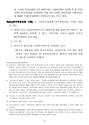 - 60 -%uba85 %uc774%uc0c1%uc758%ud1b5%uc5ed%uc694%uc6d0%uc744 %uc0c1%uc2dc %ubc30%uce5813)%ud558%uace0 %uae30%uc220%uc5f0%uc218%uc0dd%uc774 %uc785%uad6d%ud55c %ud6c4 %uc6d4 5%uc2dc%uac04 %uc774%uc0c1%uc758 %ud55c%uad6d%uc5b4%uad50%uc721%uc744%uc2e4%uc2dc%ud55c%ub2e4%ub294 %ub0b4%uc6a9 %ub4f1%uc774 %ud3ec%ud568%ub41c%u2018%ud55c%uad6d%uc5b4%uad50%uc721 %uc774%ud589%uac01%uc11c14)%u2019%ub97c %uc81c%ucd9c%ud55c %uae30%uc220%uc5f0%uc218%uc5c5%uccb4%uc5d0%uc11c %uc5f0%uc218%ubc1b%uace0%uc790 %ud558%ub294 %uc790%u201d%ub294 %uc81c%uc678)%uc81c4%uc870(%uc5f0%uc218%ud5c8%uc6a9%uc778%uc6d0 %uae30%uc900)%u2460 %uae30%uc220%uc5f0%uc218%uc5c5%uccb4%ubcc4 %uc5f0%uc218%ud5c8%uc6a9%uc778%uc6d0 %uae30%uc900%uc740 %ub2e4%uc74c%uacfc %uac19%ub2e4.1.%ub0b4%uad6d%uc778 %uc0c1%uc2dc %uadfc%ub85c%uc79015)(%uc784%uc2dc%uc9c1 %ubc0f %uae30%uc220%uc5f0%uc218%uc0dd %uc81c%uc678)%ucd1d%uc218%uc758 8%%uc774%ub0b416)%ub2e8,%ucd5c%ub300 200%uba85%uc744 %ucd08%uacfc%ud560 %uc218 %uc5c6%uace0,%ubd80%ub4dd%uc774%ud55c %uc0ac%uc720%ub85c 200%uba85 %ucd08%uacfc%uc2dc %ubc95%ubb34%ubd80%uc7a5%uad00%uc758 %uc2b9%uc778 %ud544%uc694 2.<%uc0ad %uc81c>3.%uc678%uad6d%uad6d%uc801 %ub3d9%ud3ec17)%ub97c %uae30%uc220%uc5f0%uc218%uc0dd%uc73c%ub85c %ucd08%uccad%ud558%ub294 %uacbd%uc6b0:%uc81c1%ud638%uc758 %ud5c8%uc6a9%uc778%uc6d0 %uc678%uc5d0 %uc678%uad6d%uad6d%uc801%ub3d9%ud3ec %uae30%uc220%uc5f0%uc218%uc0dd%uc218%uc758 50%%ubc94%uc704 %ub0b4%uc5d0%uc11c %ucd08%uacfc %ud5c8%uc6a9(%ub2e8,%ucd1d %ucd08%uacfc%ud5c8%uc6a9%uc778%uc6d0%uc740 %uc81c1%ud638%uc758 %ud5c8%uc6a9%uc778%uc6d0 %uc0c1%ud55c%uc758 50%%ub97c %ucd08%uacfc%ud558%uc9c0 %ubabb%ud568)18)13)%ud1b5%uc5ed%uc694%uc6d0%uc740 %uae30%uc220%uc5f0%uc218%uc0dd%uc758 %uad6d%uc801%uad6d %uc5b8%uc5b4 %ubc0f %ud55c%uad6d%uc5b4%ub97c %ub3d9%uc2dc%uc5d0 %uad6c%uc0ac%ud560 %uc218 %uc788%uc5b4%uc57c %ud558%uba70, %uc0b0%uc5c5%uc5f0%uc218%uc0dd%uc774 %uc5f0%uc218%ub97c%ubc1b%ub294 %uacfc%uc815%uc5d0%uc11c %uc5b8%uc81c%ub4e0%uc9c0 %ud1b5%uc5ed%uc774 %uac00%ub2a5%ud558%ub3c4%ub85d %uc0c1%uc2dc %ubc30%uce58%ud558%uc5ec%uc57c %ud568. %ud1b5%uc5ed%uc694%uc6d0%uc758 %ud55c%uad6d%uc5b4 %ub2a5%ub825 %uc694%uac74%uc740 %uc678%uad6d%uc778(%uadc0%ud654%ud55c %uad6d%ubbfc %ud3ec%ud568)%uc758 %uacbd%uc6b0 %ud1a0%ud53d 4%uae09 %uc774%uc0c1 %uc790%uaca9%uc99d%uc744 %uc18c%uc9c0%ud55c %uc790 %ub610%ub294 %ubc95%ubb34%ubd80 %uc6b4%uc601 %uc0ac%ud68c%ud1b5%ud569%ud504%ub85c%uadf8%ub7a8 4%ub2e8%uacc4 %uc774%uc0c1 %uc774%uc218%uc790%ub85c %ud55c%uc815%ud558%uba70, %uad6d%ubbfc%uc778 %uacbd%uc6b0 %ud574%ub2f9 %uc678%uad6d%uc5b4 %ub2a5%ub825 %uc2dc%ud5d8 %uc911%uae09 %uc790%uaca9%uc99d %ub610%ub294 %ud574%ub2f9%uad6d%uac00%uc5d0 3%ub144 %uc774%uc0c1(%uc5f0%uc218 %uc5c5%uccb4 %uc18c%uc18d %uc9c1%uc6d0%uc73c%ub85c %ud574%ub2f9 %uad6d%uac00 %ud574%uc678 %ubc95%uc778%uc758 %uae30%uc220 %ubc0f %uc0dd%uc0b0 %uad00%ub9ac %uc778%ub825%uc73c%ub85c %ud30c%uacac %uc8fc%uc7ac%ud55c %uacbd%uc6b0 2%ub144 %uc774%uc0c1) %uccb4%ub958 %uacbd%ub825%uc744 %uac00%uc9c0%uace0 %uc788%ub294 %uc790%ub85c %ud55c%uc815, %uad6d%uc801%uad6d %uc5b8%uc5b4%uac00 %uc544%ub2cc %uc601%uc5b4%ud1b5%uc5ed%uc744 %ud558%ub294 %uacbd%uc6b0 %ud574%ub2f9%uc5f0%uc218%uc0dd %ubaa8%ub450%uc758 %uc601%uc5b4%ud68c%ud654 %ub2a5%ub825(TOEIC 700 %uc774%uc0c1)%uc744 %uc785%uc99d%ud574%uc57c %ud56814)%u2018%ud55c%uad6d%uc5b4%uad50%uc721 %uc774%ud589%uac01%uc11c%u2019%ub294 %ubcc4%ub3c4 %uc11c%uc2dd%uc740 %uc5c6%uc73c%ub098, %u201c%uae30%uc220%uc5f0%uc218%uc0dd 100%uba85%ub2f9 o%uba85%uc758 %ud1b5%uc5ed%uc694%uc6d0%uc744 %uc0c1%uc2dc %ubc30%uce58%ud558%uace0%uae30%uc220%uc5f0%uc218%uc0dd%uc774 %uc785%uad6d%ud55c %ud6c4 %uc6d4 5%uc2dc%uac04 %uc774%uc0c1%uc758 %ud55c%uad6d%uc5b4%uad50%uc721%uc744 %uc2e4%uc2dc%ud560 %uc608%uc815%uc774%ubbc0%ub85c %ubcf8 %uae30%uc220%uc5f0%uc218%uc5c5%uccb4%uac00 %ucd08%uccad%ud558%uace0%uc790 %ud558%ub294 %uae30%uc220%uc5f0%uc218%uc0dd%uc5d0 %ub300%ud574 %ud55c%uad6d%uc5b4%uc2dc%ud5d8%uc131%uc801 %uc81c%ucd9c%uc744 %uba74%uc81c%ud558%uc5ec %uc8fc%uc2dc%uae30%ubc14%ub78d%ub2c8%ub2e4. %ub9cc%uc57d %ub3d9 %uac01%uc11c%uc758 %ub0b4%uc6a9%uc744 %uc774%ud589%ud558%uc9c0 %uc54a%uc744 %uacbd%uc6b0%ud55c%uad6d%uc5b4%uc2dc%ud5d8 %uc131%uc801%uc81c%ucd9c %uc758%ubb34%ub97c %uba74%uc81c%ubc1b%uc740 %uae30%uc220%uc5f0%uc218%uc0dd%uc758%uccb4%ub958%uae30%uac04 %uc5f0%uc7a5%uc774 %ubd88%ud5c8%ub428%uc740 %ubb3c%ub860 %uc81c4%uc870%uc81c3%ud56d %uaddc%uc815%uc5d0 %uc758%ud55c %ucd94%uac00 %ucd08%uccad %ubd88%ud5c8 %ubc0f %ucd94%ud6c4%uc5d0 %ucd08%uccad%ud558%ub294%uc5f0%uc218%uc0dd%uc5d0 %ub300%ud574%uc11c%ub294 %ud55c%uad6d%ub9d0%uc2dc%ud5d8%uc131%uc801%uc81c%ucd9c%uc758%ubb34%uac00 %uba74%uc81c%ub418%uc9c0 %uc54a%ub294%ub4f1%uc5b4%ub5a0%ud55c %ubd88%uc774%uc775%ub3c4 %uac10%uc218%ud560 %uac83%uc785%ub2c8%ub2e4.%u201d%ub77c%ub294 %ubb38%uad6c%uc640 %u201c%uae30%uc220%uc5f0%uc218%uc5c5%uccb4%uc758 %uc7a5%uc758 %uc11c%uba85%u201d%uc740 %ubc18%ub4dc%uc2dc %u2018%ud55c%uad6d%uc5b4%uad50%uc721 %uc774%ud589%uac01%uc11c%u2019%uc5d0 %uae30%uc7ac%ud574%uc57c %ud56815)%uadfc%ub85c%uc790%ub294%u300c%uadfc%ub85c%uae30%uc900%ubc95%u300d%uc81c2%uc870%uc5d0 %uaddc%uc815%ub41c %uadfc%ub85c%uc790%ub85c %uace0%uc6a9%ubcf4%ud5d8 %uac00%uc785 %ub0b4%uad6d%uc778%ud53c%ubcf4%ud5d8%uc790%ub97c %uc758%ubbf8%ud558%uba70 %uace0%uc6a9%ub178%ub3d9%ubd80%uc758%uace0%uc6a9%ubcf4%ud5d8 %uc0ac%uc774%ud2b8%uc5d0%uc11c %ud655%uc778%uc774 %uac00%ub2a5%ud56816)%uc5f0%uc218%ud5c8%uc6a9%uc778%uc6d0 %uacc4%uc0b0%uc5d0 %uc788%uc5b4%uc11c %uc18c%uc218%uc810 %uc774%ud558%ub294 %uc808%uc0ad%ud56817)%uc678%uad6d%uad6d%uc801%ub3d9%ud3ec%uc758 %uc815%uc758%ub294 %u300c%uc7ac%uc678%ub3d9%ud3ec%uc758 %ucd9c%uc785%uad6d%uacfc %ubc95%uc801 %uc9c0%uc704%uc5d0 %uad00%ud55c %ubc95%ub960%u300d%uc81c2%uc870%uc81c2%ud638 %ubc0f %ub3d9%ubc95 %uc2dc%ud589%ub839%uaddc%uc815%uc5d0 %ub530%ub98418)%uc608%ub97c %ub4e4%uc5b4 %uc81c4%uc870%uc81c1%ud56d%uc81c1%ud638 %uaddc%uc815%uc5d0 %uc758%ud574 %uc5f0%uc218%ud5c8%uc6a9%uc778%uc6d0%uc774 10%uba85%uc774%uace0, %uc774%uc911 %uc678%uad6d%uad6d%uc801%ub3d9%ud3ec%ua