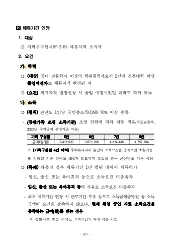 - 601 -%uf000%uccb4%ub958%uae30%uac04 %uc5f0%uc7a51. %ub300%uc0c1%u274d %uc9c0%uc5ed%uc6b0%uc218%uc778%uc7ac(F-2-R) %uccb4%ub958%uc790%uaca9 %uc18c%uc9c0%uc7902. %uc694%uac74%uac00. %ud559%ub825%u274d (%ub300%uc0c1)%uad6d%ub0b4 %uc804%ubb38%ud559%uc0ac %uc774%uc0c1%uc758 %ud559%uc704%ucde8%ub4dd%uc790%ub85c%uc11c 2%ub144%uc81c %uc804%ubb38%ub300%ud559 %uc774%uc0c1%uc878%uc5c5%uc608%uc815%uc790%ub85c %uccb4%ub958%uc790%uaca9 %ubcc0%uacbd%ub41c %uc790%u274d (%uc694%uac74)%uccb4%ub958%uc790%uaca9 %ubcc0%uacbd%uc2e0%uccad %uc2dc %uc878%uc5c5 %uc608%uc815%uc774%uc5c8%ub358 %ub300%ud559%uad50 %ud559%uc704 %ucde8%ub4dd%ub098. %uc18c%ub4dd%u274d (%uc6d0%uce59)%uc804%ub144%ub3c4 1%uc778%ub2f9 %uad6d%ubbfc%ucd1d%uc18c%ub4dd(GNI) 70% %uc774%uc0c1 %ucda9%uc871-(%ub3d9%ubc18%uac00%uc871 %ucd08%uccad %uc18c%ub4dd%uae30%uc900)%ucd08%uccad %uc778%uc6d0%uc5d0 %ub530%ub77c %ucc28%ub4f1 %uc801%uc6a9(%uad6d%ud1a0%uad50%ud1b5%ubd802025%ub144 %uc8fc%uac70%uae09%uc5ec %uc120%uc815%uae30%uc900 %uc801%uc6a9)%uac00%uc871 %uad6c%uc131%uc6d0 5%uc7786%uc7787%uc7788%uc778%uae08%uc561(%uc6d0/%uc6d4)3,411,9323,871,1064,314,4454,757,784%u203b(%uac00%uc871%uad6c%uc131%uc6d04%uc778%uc774%ud558)%uc8fc%uccb4%ub958%uc790%uaca9%uc790%ubcf8%uc778%uc758%uc18c%ub4dd%uc694%uac74%uc744%ucda9%uc871%ud558%uba74%ucd08%uccad%uac00%ub2a5%u203b%uc2e0%uccad%uc77c%uae30%uc900%uc804%ub144%ub3c4GNI%uac00%ubc1c%ud45c%ub418%uc9c0%uc54a%uc558%uc744%uacbd%uc6b0%uc804%uc804%ub144%ub3c4%uae30%uc900%uc801%uc6a9%u274d (%ud2b9%ub840)%ub2e4%uc74c%uc758 %uacbd%uc6b0 %uccb4%ub958%uae30%uac04 1%ub144 %ubc94%uc704 %ub0b4%uc5d0%uc11c %uccb4%ub958%ud5c8%uac00-%uc784%uc2e0, %ucd9c%uc2e0 %ub610%ub294 %uc721%uc544%ud734%uc9c1 %ub4f1%uc73c%ub85c %uc18c%ub4dd%uc694%uac74 %ubbf8%ucda9%uc871%uc790-%uc784%uc2e0,%ucd9c%uc0b0 %ub610%ub294 %uc721%uc544%ud734%uc9c1 %ub4f1%uc758 %uc0ac%uc720%ub85c %uc18c%ub4dd%uc694%uac74 %ubbf8%ucda9%uc871%uc790-%ucd5c%ucd08 %uccb4%ub958%uae30%uac04 %uc5f0%uc7a5 %uc2dc %uadfc%ub85c%uae30%uac04 %ubd80%uc871 %ub4f1%uc73c%ub85c %uc18c%ub4dd%uae08%uc561%uc99d%uba85%uc6d0 %uc0c1 %uc18c%ub4dd%uae08%uc561%uc774 %uc694%uac74%uc744 %ucda9%uc871%ud558%uc9c0 %uc54a%uc73c%ub098,%ud604%uc7ac %ucde8%uc5c5 %uc911%uc778 %uc790%ub85c %uc18c%ub4dd%uc694%uac74%uc744 %ucda9%uc871%ud558%ub294 %uae09%uc5ec(%uc6d4)%ub97c %ubc1b%ub294 %uacbd%uc6b0%u203b%ub3d9%ubc18%uac00%uc871%ucd08%uccad%uc2dc%uc5d0%ub3c4%uc18c%ub4dd%uc694%uac74%uc758%ud2b9%ub840%uc801%uc6a9%uac00%ub2a5