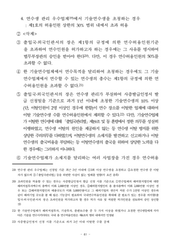 - 61 -4.%uc5f0%uc218%uc0dd %uad00%ub9ac %uc6b0%uc218%uc5c5%uccb419)%uc5d0%uc11c %uae30%uc220%uc5f0%uc218%uc0dd%uc744 %ucd08%uccad%ud558%ub294 %uacbd%uc6b0:%uc81c1%ud638%uc758 %ud5c8%uc6a9%uc778%uc6d0 %uc0c1%ud55c%uc758 30%%ubc94%uc704 %ub0b4%uc5d0%uc11c %ucd08%uacfc %ud5c8%uc6a9%u2461 <%uc0ad%uc81c>%u2462 %ucd9c%uc785%uad6d%u2024%uc678%uad6d%uc778%uad00%uc11c%uc758 %uc7a5%uc740 %uc81c1%ud56d%uc758 %uaddc%uc815%uc5d0 %uc758%ud55c %uc5f0%uc218%ud5c8%uc6a9%uc778%uc6d0%uae30%uc900%uc744%ucd08%uacfc%ud558%uc5ec %uc5f0%uc218%uc778%uc6d0%uc744 %ud5c8%uac00%ud558%uace0%uc790 %ud558%ub294 %uacbd%uc6b0%uc5d0%ub294 %uadf8 %uc0ac%uc720%ub97c %uba85%uc2dc%ud558%uc5ec %ubc95%ubb34%ubd80%uc7a5%uad00%uc758 %uc2b9%uc778%uc744 %ubc1b%uc544%uc57c %ud55c%ub2e420).%ub2e4%ub9cc,%uc774 %uacbd%uc6b0 %uc5f0%uc218%ud5c8%uc6a9%uc778%uc6d0%uc758 50%%ub97c %ucd08%uacfc%ud560%uc218 %uc5c6%ub2e4.%u2463 %ud55c %uae30%uc220%uc5f0%uc218%uc5c5%uccb4%uc5d0%uc11c %uc5f0%uc218%ubaa9%uc801%uc744 %ub2ec%ub9ac%ud558%uc5ec %ucd08%uccad%ud558%ub294 %uacbd%uc6b0%uc5d0%ub3c4 %uadf8 %uae30%uc220%uc5f0%uc218%uc5c5%uccb4%uc5d0%uc11c %uc5f0%uc218%ud560 %uc218 %uc788%ub294 %uc5f0%uc218%uc0dd%uc758 %ucd1d%uc218%ub294 %uc81c1%ud56d%uc758 %uaddc%uc815%uc5d0 %uc758%ud55c %uc5f0%uc218%ud5c8%uc6a9%uc778%uc6d0%uc744 %ucd08%uacfc%ud560 %uc218 %uc5c6%ub2e4.21)%u2464 %ucd9c%uc785%uad6d%u2024%uc678%uad6d%uc778%uad00%uc11c%uc758 %uc7a5%uc740 %uc5f0%uc218%uc0dd %uad00%ub9ac%uac00 %ubd80%uc2e4%ud558%uc5ec %uc0ac%uc99d%ubc1c%uae09%uc778%uc815%uc11c%ubc1c%uae09 %uc2e0%uccad%uc77c%uc744 %uae30%uc900%uc73c%ub85c %uacfc%uac70 1%ub144 %uc774%ub0b4%uc5d0 %ucd08%uccad%ud55c %uae30%uc220%uc5f0%uc218%uc0dd%uc758 10%%uc774%uc0c1(%ub2e8,%uc774%ud0c8%uc778%uc6d0%uc774 2%uba85 %uc774%uc0c1%uc778 %uacbd%uc6b0%uc5d0 %ud55c%ud568)%uc774 %uc5f0%uc218 %uc7a5%uc18c%ub97c %uc774%ud0c8%ud55c %uc5c5%uccb4%uc5d0 %ub300%ud558%uc5ec %uc774%ud0c8 %uae30%uc220%uc5f0%uc218%uc0dd %uc218%ub97c %uc5f0%uc218%ud5c8%uc6a9%uc778%uc6d0%uc5d0%uc11c %uc81c%uc678%ud560 %uc218 %uc788%ub2e4.22)%ub2e4%ub9cc,%uae30%uc220%uc5f0%uc218%uc5c5%uccb4%uac00 %uc774%ud0c8%ud55c %uc5f0%uc218%uc0dd%uc5d0 %ub300%ud574 %u300c%ucd9c%uc785%uad6d%uad00%ub9ac%ubc95%u300d%uc81c19%uc870 %ubc0f %ub3d9 %ud6c8%ub839%uc5d0%uc11c %uc815%ud55c %uc758%ubb34%ub97c %uc131%uc2e4%ud788 %uc774%ud589%ud558%uc600%uace0,%uc5f0%uc218%uc0dd %uc774%ud0c8%uc758 %uc6d0%uc778%uc744 %uc81c%uacf5%ud558%uc9c0 %uc54a%ub294 %ub4f1 %uc5f0%uc218%uc0dd %uc774%ud0c8 %ubc29%uc9c0%ub97c %uc704%ud55c %uc0c1%ub2f9%ud55c %uc8fc%uc758%uc758%ubb34%ub97c %ub2e4%ud558%uc600%uc73c%uba70,%uc774%ud0c8%uc5f0%uc218%uc0dd%uc758 %uc18c%uc7ac%uc9c0%ub97c%ubc1c%uacac%ud558%uace0 %uc2e0%uace0%ud558%uac70%ub098 %uc774%ud0c8%uc5f0%uc218%uc0dd%uc758 %ucd9c%uad6d%ube44%uc6a9%uc744 %ubd80%ub2f4%ud558%ub294%ub4f1 %uc774%ud0c8%uc5f0%uc218%uc0dd%uc758 %ucd9c%uad6d%uc744%uc704%ud558%uc5ec %uc0c1%ub2f9%ud55c %ub178%ub825%uc744 %ub2e4%ud55c %uacbd%uc6b0%uc5d0%ub294 %uadf8%ub7ec%ud558%uc9c0 %uc544%ub2c8%ud558%ub2e4.%u2465 %uae30%uc220%uc5f0%uc218%uc5c5%uccb4%uac00 %uc18c%uc7ac%uc9c0%ub97c %ub2ec%ub9ac%ud558%ub294 %uc5ec%ub7ec %uc0ac%uc5c5%uc7a5%uc744 %uac00%uc9c4 %uacbd%uc6b0 %uc5f0%uc218%ud5c8%uc6a919)%uc5f0%uc218%uc0dd %uad00%ub9ac %uc6b0%uc218%uc5c5%uccb4%ub294 %uc2e0%uccad%uc77c %uae30%uc900 %ucd5c%uadfc 2%ub144 %uc774%ub0b4%uc5d0 %u24603%ud68c %uc774%uc0c1 %uc5f0%uc218%uc0dd%uc744 %ucd08%uccad%ud558%uace0 %u2461%ucd08%uccad%ud55c %uc5f0%uc218%uc0dd %uc911 %uc774%ud0c8%uc790%uac00 %uc5c6%uc73c%uba70 %u2462%u300c%ucd9c%uc785%uad6d%uad00%ub9ac%ubc95%u300d%ub4f1%uc744 %uc704%ubc18%ud55c %uc0ac%uc2e4%uc774 %uc5c6%ub294 %uc5c5%uccb4%ub97c %ub9d0%ud568(%uac01 %uc694%uac74 %ucda9%uc871)20)%ucd08%uacfc%uc778%uc6d0%uc744 %ud5c8%uc6a9%ud560 %uc218 %uc788%ub294 %uacbd%uc6b0%ub294 %uc0ac%uc99d%ubc1c%uae09%uc778%uc815%uc11c %ubc1c%uae09 %uc2e0%uccad %uc2dc%ub97c %uae30%uc900%uc73c%ub85c %u2460%uc5f0%uc218%uc5c5%uccb4%uc758 %ud574%uc678%ud604%uc9c0%ubc95%uc778%uc5d0 %ub300%ud55c %ud574%uc678%uc9c1%uc811%ud22c%uc790%uc561%uc218%uc758 %ucd1d%uc561%uc774 %ubbf8%ud654 1,000%ub9cc%ubd88 %uc774%uc0c1%uc778 %uacbd%uc6b0, %u2461%ud574%uc678%ud604%uc9c0%ubc95%uc778%uc758 %ucd1d %ucd9c%uc790%ucd1d%uc561%uc774 %ubbf8%ud654 1,000%ub9cc%ubd88%uc774%uc0c1%uc778 %uacbd%uc6b0 %ub610%ub294 %u2462%ud574%uc678%ud604%uc9c0%ubc95%uc778%uc758 %ub9e4%ucd9c%uaddc%ubaa8%uac00 %ubbf8%ud654 5,000%ub9cc%ubd88%uc774%uace0 %uadf8 %ud574%uc678%uae30%uc5c5%uc758 %uc0dd%uc0b0%uc9c1 %uc9c1%uc6d0 %uc218%uac00 1%ucc9c%uba85 %uc774%uc0c1%uc778 %uacbd%uc6b0%uc640 %uac19%uc774 %ud574%uc678%uae30%uc5c5 %uaddc%ubaa8%ub97c %ubcfc %ub54c %ub9ce%uc740 %uae30%ub2a5%uacf5%uc774%ud544%uc694%ud558%uc5ec %uad6d%ub0b4%uc5f0%uc218%ud5c8%uc6a9%uc778%uc6d0%uc744 %ud655%ub300%ud574 %uc904 %ud544%uc694%uac00 %uc788%ub294 %uacbd%uc6b0%ub97c %uc758%ubbf8%ud568(%ucd9c%uc785%uad6d%u2024%uc678%uad6d%uc778%uad00%uc11c%uc758 %uc7a5%uc740 %ucd08%uacfc%uc778%uc6d0%uc744 %ud5c8%uac00%ud558%uace0%uc790 %ud560 %uacbd%uc6b0 %ud5c8%uac00 %uc0ac%uc720 %ubc0f %uc801%uc808%ud55c %ud5c8%uac00%uc778%uc6d0%uc744%uac80%ud1a0%ud558%uc5ec %uc2b9%uc778 %uc0c1%uc2e0%ud560 %uac83)21)%ud55c %uae30%uc220%uc5f0%uc218%uc5c5%uccb4%uac00 %ud574%uc678%uc9c1%uc811%ud22c%uc790, %uae30%uc220%ud22c%uc790, %ud50c%ub79c%ud2b8%uc218%ucd9c %uc911 %ub450 %uac00%uc9c0 %uc774%uc0c1%uc744 %ud558%uc600%uac70%ub098 %ucd08%uccad%ud55c %uc5f0%uc218%uc0dd%ub4e4%uc5d0%uac8c %uac01%uac01 %ub2e4%ub978 %uae30%uc220%uc744 %uc5f0%uc218%uc2dc%ud0a4%ub354%ub77c%ub3c4 %uad6d%ub0b4 %ucd1d %uc5f0%uc218%ud5c8%uc6a9%uc778%uc6d0%uc740 %uc81c4%uc870%uc758 %ubc94%uc704 %ub0b4%uc5d0%uc11c%ub9cc %uc778%uc815%ub42822)%uc0ac%uc99d%ubc1c%uae09%uc778%uc815%uc11c %uc2e0%uccad %uc2dc%ub97c %uae30%uc900%uc73c%ub85c %uacfc%uac70 1%ub144 %uc774%ub0b4 %uc774%ud0c8%ud55c %uc218%ub97c %uacf5%uc81c