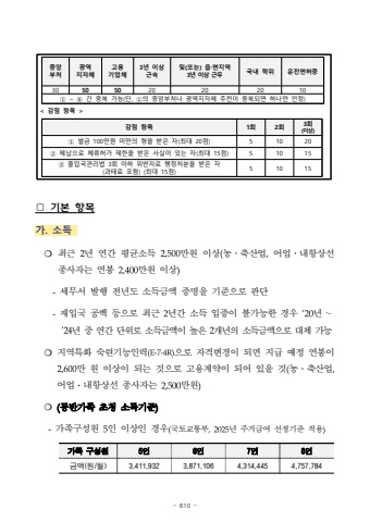 - 610 -%u25a1 %uae30%ubcf8 %ud56d%ubaa9%uac00. %uc18c%ub4dd %u274d %ucd5c%uadfc 2%ub144 %uc5f0%uac04 %ud3c9%uade0%uc18c%ub4dd 2,500%ub9cc%uc6d0 %uc774%uc0c1(%ub18d%u2024%ucd95%uc0b0%uc5c5,%uc5b4%uc5c5%u2024%ub0b4%ud56d%uc0c1%uc120 %uc885%uc0ac%uc790%ub294 %uc5f0%ubd09 %ub9cc%uc6d0 %uc774%uc0c1-%uc138%ubb34%uc11c %ubc1c%ud589 %uc804%ub144%ub3c4 %uc18c%ub4dd%uae08%uc561 %uc99d%uba85%uc744 %uae30%uc900%uc73c%ub85c %ud310%ub2e8-%uc7ac%uc785%uad6d %uacf5%ubc31 %ub4f1%uc73c%ub85c %ucd5c%uadfc 2%ub144%uac04 %uc18c%ub4dd %uc785%uc99d%uc774 %ubd88%uac00%ub2a5%ud55c %uacbd%uc6b0 %u201920%ub144%uff5e%u201924%ub144 %uc911 %uc5f0%uac04 %ub2e8%uc704%ub85c %uc18c%ub4dd%uae08%uc561%uc774 %ub192%uc740 2%uac1c%ub144%uc758 %uc18c%ub4dd%uae08%uc561%uc73c%ub85c %ub300%uccb4 %uac00%ub2a5%u274d %uc9c0%uc5ed%ud2b9%ud654 %uc219%ub828%uae30%ub2a5%uc778%ub825(E-7-4R)%uc73c%ub85c %uc790%uaca9%ubcc0%uacbd%uc774 %ub418%uba74 %uc9c0%uae09 %uc608%uc815 %uc5f0%ubd09%uc7742,600%ub9cc %uc6d0 %uc774%uc0c1%uc774 %ub418%ub294 %uac83%uc73c%ub85c %uace0%uc6a9%uacc4%uc57d%uc774 %ub418%uc5b4 %uc788%uc744 %uac83(%ub18d%u2024%ucd95%uc0b0%uc5c5,%uc5b4%uc5c5%u2024%ub0b4%ud56d%uc0c1%uc120 %uc885%uc0ac%uc790%ub294 2,500%ub9cc%uc6d0)%u274d (%ub3d9%ubc18%uac00%uc871 %ucd08%uccad %uc18c%ub4dd%uae30%uc900)-%uac00%uc871%uad6c%uc131%uc6d0 5%uc778 %uc774%uc0c1%uc778 %uacbd%uc6b0(%uad6d%ud1a0%uad50%ud1b5%ubd80,2025%ub144 %uc8fc%uac70%uae09%uc5ec %uc120%uc815%uae30%uc900 %uc801%uc6a9)%uac00%uc871 %uad6c%uc131%uc6d0 5%uc7786%uc7787%uc7788%uc778%uae08%uc561(%uc6d0/%uc6d4)3,411,9323,871,1064,314,4454,757,784< %uac10%uc810 %ud56d%ubaa9 >%uc911%uc559%ubd80%ucc98%uad11%uc5ed%uc9c0%uc790%uccb4%uace0%uc6a9%uae30%uc5c5%uccb43%ub144 %uc774%uc0c1%uadfc%uc18d%ubc0f(%ub610%ub294) %uc74d%u00b7%uba74%uc9c0%uc5ed 3%ub144 %uc774%uc0c1 %uadfc%ubb34%uad6d%ub0b4 %ud559%uc704%uc6b4%uc804%uba74%ud5c8%uc99d30505020202010%u2460 ~ %u2465 %uac04 %uc911%ubcf5 %uac00%ub2a5(%ub2e8, %u2460%uc758 %uc911%uc559%ubd80%ucc98%ub098 %uad11%uc5ed%uc9c0%uc790%uccb4 %ucd94%ucc9c%uc774 %uc911%ubcf5%ub418%uba74 %ud558%ub098%ub9cc %uc778%uc815)%uac10%uc810 %ud56d%ubaa91%ud68c2%ud68c3%ud68c(%uc774%uc0c1)%u2460 %ubc8c%uae08 100%ub9cc%uc6d0 %ubbf8%ub9cc%uc758 %ud615%uc744 %ubc1b%uc740 %uc790(%ucd5c%ub300 20%uc810)51020%u2461 %uccb4%ub0a9%uc73c%ub85c %uccb4%ub958%ud5c8%uac00 %uc81c%ud55c%uc744 %ubc1b%uc740 %uc0ac%uc2e4%uc774 %uc788%ub294 %uc790(%ucd5c%ub300 15%uc810)51015%u2462 %ucd9c%uc785%uad6d%uad00%ub9ac%ubc95 3%ud68c %uc774%ud558 %uc704%ubc18%uc790%ub85c %ud589%uc815%ucc98%ubd84%uc744 %ubc1b%uc740 %uc790(%uacfc%ud0dc%ub8cc %ud3ec%ud568) (%ucd5c%ub300 15%uc810)51015