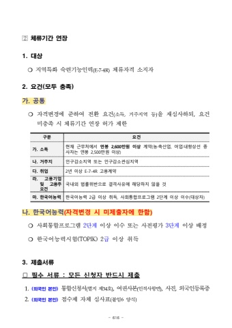 - 616 -%uf000%uccb4%ub958%uae30%uac04 %uc5f0%uc7a51. %ub300%uc0c1%u274d %uc9c0%uc5ed%ud2b9%ud654 %uc219%ub828%uae30%ub2a5%uc778%ub825(E-7-4R)%uccb4%ub958%uc790%uaca9 %uc18c%uc9c0%uc7902. %uc694%uac74(%ubaa8%ub450 %ucda9%uc871)%uac00. %uacf5%ud1b5%u274d%uc790%uaca9%ubcc0%uacbd%uc5d0 %uc900%ud558%uc5ec %uc804%ud658 %uc694%uac74(%uc18c%ub4dd,%uac70%uc8fc%uc9c0%uc5ed %ub4f1)%uc744 %uc7ac%uc2ec%uc0ac%ud558%ub418,%uc694%uac74 %ubbf8%ucda9%uc871 %uc2dc %uccb4%ub958%uae30%uac04 %uc5f0%uc7a5 %ud5c8%uac00 %uc81c%ud55c%uad6c%ubd84%uc694%uac74%uac00. %uc18c%ub4dd%ud604%uc7ac %uadfc%ubb34%ucc98%uc5d0%uc11c %uc5f0%ubd09 2,600%ub9cc%uc6d0 %uc774%uc0c1%uacc4%uc57d(%ub18d%u00b7%ucd95%uc0b0%uc5c5, %uc5b4%uc5c5%u00b7%ub0b4%ud56d%uc0c1%uc120 %uc885%uc0ac%uc790%ub294 %uc5f0%ubd09 2,500%ub9cc%uc6d0 %uc774%uc0c1)%ub098. %uac70%uc8fc%uc9c0%uc778%uad6c%uac10%uc18c%uc9c0%uc5ed %ub610%ub294 %uc778%uad6c%uac10%uc18c%uad00%uc2ec%uc9c0%uc5ed%ub2e4. %ucde8%uc5c52%ub144 %uc774%uc0c1 E-7-4R %uace0%uc6a9%uacc4%uc57d%ub77c. %uace0%uc6a9%uae30%uc5c5%ubc0f %uace0%uc6a9%uc8fc %uc694%uac74%uad6d%ub0b4%uc678 %ubc95%ub960%uc704%ubc18%uc73c%ub85c %uacb0%uaca9%uc0ac%uc720%uc5d0 %ud574%ub2f9%ud558%uc9c0 %uc54a%uc744 %uac83%ub9c8. %ud55c%uad6d%uc5b4%ub2a5%ub825%ud55c%uad6d%uc5b4%ub2a5%ub825 2%uae09 %uc774%uc0c1 %ucde8%ub4dd, %uc0ac%ud68c%ud1b5%ud569%ud504%ub85c%uadf8%ub7a8 2%ub2e8%uacc4 %uc774%uc0c1 %uc774%uc218(%ub300%uc0c1%uc790)%ub098. %ud55c%uad6d%uc5b4%ub2a5%ub825(%uc790%uaca9%ubcc0%uacbd %uc2dc %ubbf8%uc81c%ucd9c%uc790%uc5d0 %ud55c%ud568)%u274d %uc0ac%ud68c%ud1b5%ud569%ud504%ub85c%uadf8%ub7a82%ub2e8%uacc4 %uc774%uc0c1 %uc774%uc218 %ub610%ub294 %uc0ac%uc804%ud3c9%uac003%ub2e8%uacc4%uc774%uc0c1 %ubc30%uc815%u274d %ud55c%uad6d%uc5b4%ub2a5%ub825%uc2dc%ud5d8(TOPIK) 2%uae09%uc774%uc0c1 %ucde8%ub4dd3. %uc81c%ucd9c%uc11c%ub958%u25a1 %ud544%uc218 %uc11c%ub958 : %ubaa8%ub4e0 %uc2e0%uccad%uc790 %ubc18%ub4dc%uc2dc %uc81c%ucd9c1.(%uc678%uad6d%uc778 %ubcf8%uc778)%ud1b5%ud569%uc2e0%uccad%uc11c(%ubcc4%uc9c0 %uc81c34%ud638),%uc5ec%uad8c%uc0ac%ubcf8(%uc778%uc801%uc0ac%ud56d%uba74),%uc0ac%uc9c4,%uc678%uad6d%uc778%ub4f1%ub85d%uc99d2.(%uc678%uad6d%uc778 %ubcf8%uc778)%uc810%uc218%uc81c %uc790%uccb4 %uc2ec%uc0ac%ud45c(%ubd99%uc7846%uc591%uc2dd)