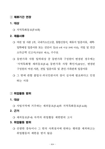 - 624 -%uf000%uccb4%ub958%uae30%uac04 %uc5f0%uc7a51. %ub300%uc0c1%u274d %uc9c0%uc5ed%ud2b9%ud654%ub3d9%ud3ec(F-4-R)2. %uc81c%ucd9c%uc11c%ub958%u274d %uc5ec%uad8c %ubc0f %uc0ac%ubcf8 1%ubd80,%uad6d%ub0b4%uac70%uc18c%uc2e0%uace0%uc99d,%ud1b5%ud569%uc2e0%uccad%uc11c,%uccb4%ub958%uc9c0%uc785%uc99d%uc11c%ub958,%uc7ac%ud559%u00b7%uc785%ud559%uc608%uc815 %uc785%uc99d%uc11c%ub958 %ub610%ub294 %uc9c4%ub2e8%uc11c%ub4f1(%ub9cc 6%uc138 %uc774%uc0c1 19%uc138 %ubbf8%ub9cc),%uc9c1%uc5c5 %ubc0f %uc5f0%uac04%uc18c%ub4dd%uae08%uc561 %uc2e0%uace0%uc11c(%uc9c1%uc5c5%ub9cc %uccb4%ud06c),%uc218%uc218%ub8cc%u274d %ub3d9%ubc18%uac00%uc871 %uc0ac%ud56d %uc785%ub825%ub300%uc0c1%uc911 %ub3d9%ubc18%uac00%uc871 %uad6c%uc131%uc6d0%uc774%ubcc0%uacbd%ub41c%uacbd%uc6b0%uc5d0%ub294 %u2018%uc9c0%uc5ed%ud2b9%ud654%ud615 %uc7ac%uc678%ub3d9%ud3ec(F-4)%ub3d9%ubc18%uac00%uc871 %uc0ac%ud56d %ud655%uc778%uc11c(%ubd99%uc7847)%u2019,%ubcc0%uacbd%ub41c%uad6c%uc131%uc6d0%uc758 %uc5ec%uad8c%u00b7%uc0ac%ubcf8,%uc804%uc785 %uc785%uc99d%uc11c%ub958 %ubc0f %ud63c%uc778%u00b7%uac00%uc871%uad00%uacc4 %uc785%uc99d%uc11c%ub958%u274d %uadf8 %ubc16%uc5d0 %uad00%ud560 %ucd9c%uc785%uad6d%u00b7%uc678%uad6d%uc778%uad00%uc11c%uc758 %uc7a5%uc774 %uc2ec%uc0ac%uc5d0 %ud544%uc694%ud558%ub2e4%uace0 %uc778%uc815%ud558%ub294 %uc11c%ub958%uf000%ucde8%uc5c5%ud65c%ub3d9 %ubc94%uc7041. %ub300%uc0c1%u274d %uc0ac%uc5c5%uc9c0%uc5ed%uc5d0 %uac70%uc8fc%ud558%ub294 %uc7ac%uc678%ub3d9%ud3ec(F-4)%uc640 %uc9c0%uc5ed%ud2b9%ud654%ub3d9%ud3ec(F-4-R)2. %uadfc%uac70%u274d %uc7ac%uc678%ub3d9%ud3ec(F-4)%uc790%uaca9%uc758 %ucde8%uc5c5%ud65c%ub3d9 %uc81c%ud55c%ubc94%uc704 %uace0%uc2dc3. %ucde8%uc5c5%ud65c%ub3d9 %ubc94%uc704%u274d %uc120%ub7c9%ud55c %ud48d%uc18d%uc774%ub098 %uadf8 %ubc16%uc758 %uc0ac%ud68c%uc9c8%uc11c%uc5d0 %ubc18%ud558%ub294 %ud589%uc704%ub97c %uc81c%uc678%ud558%uace0%ub294 %ucde8%uc5c5%ud65c%ub3d9%uc758 %uc81c%ud55c%uc744 %ubc1b%uc9c0 %uc54a%uc74c
